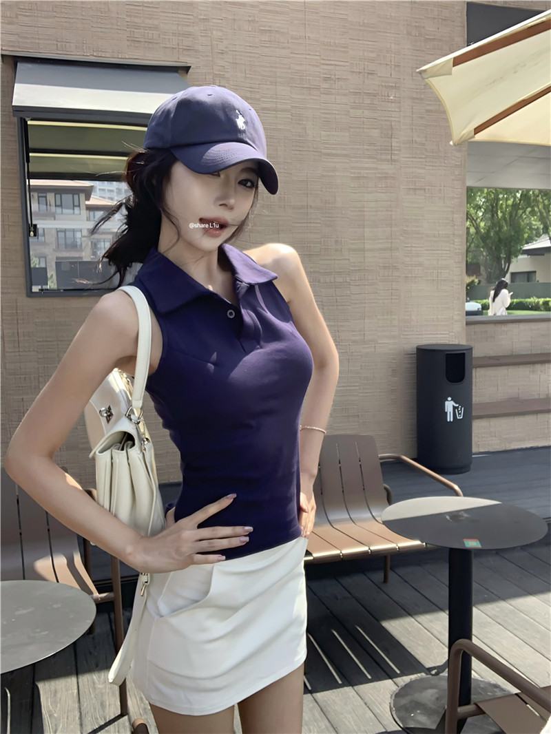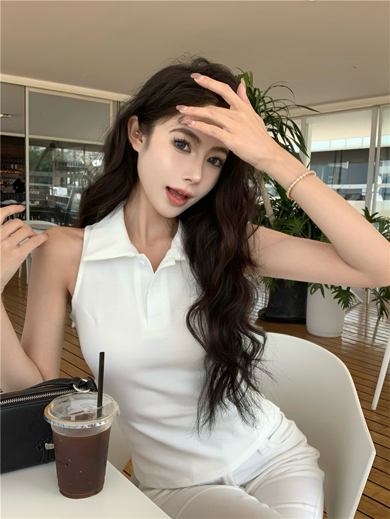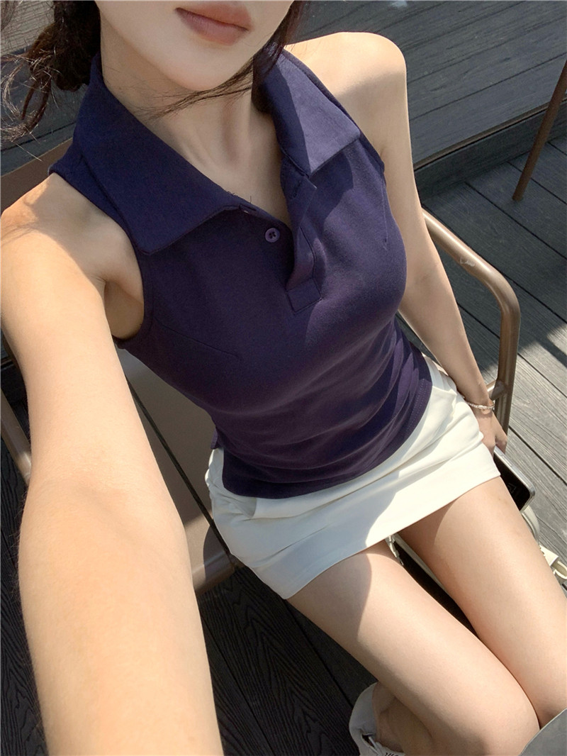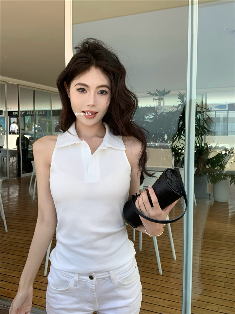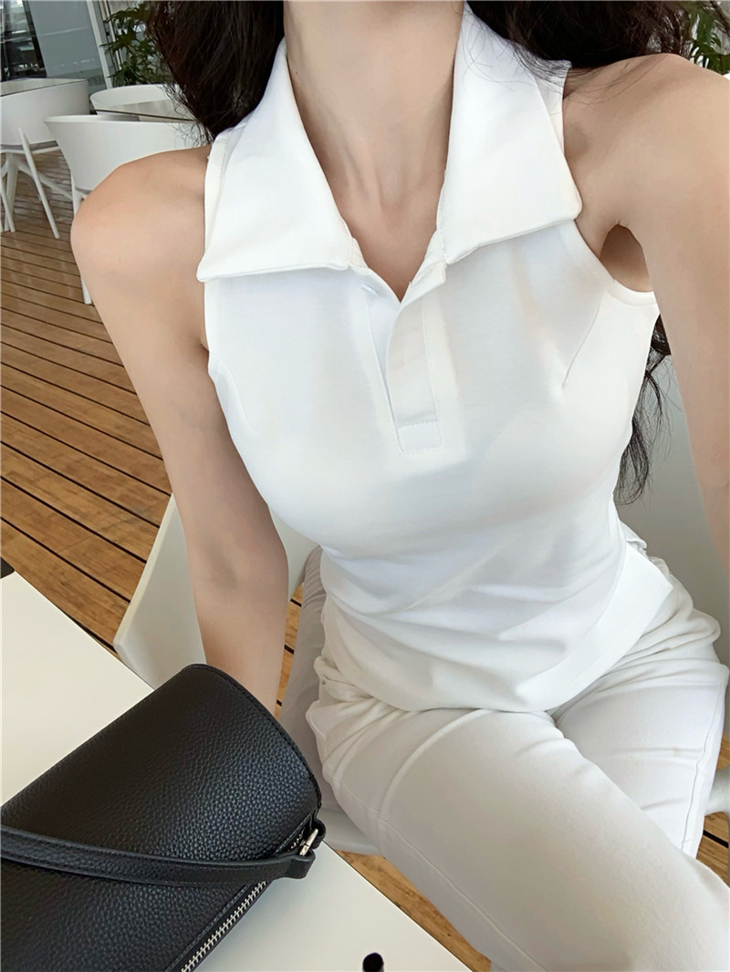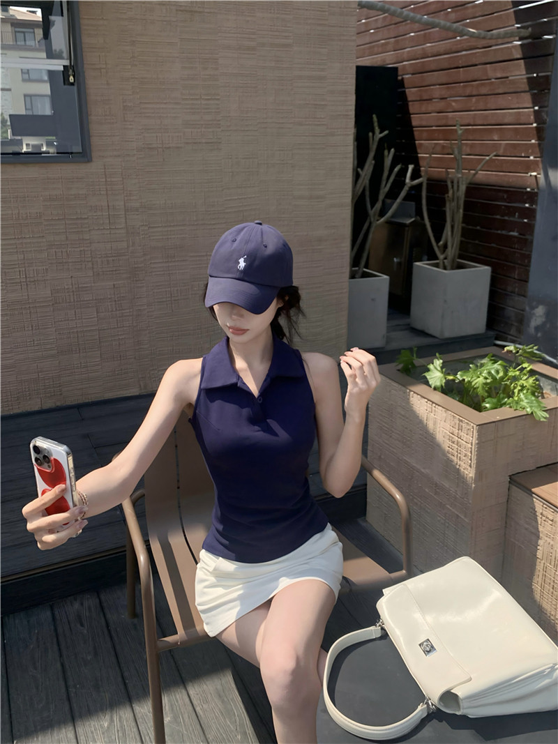 Basic cut-out polo neck sleeveless vest T-shirt
