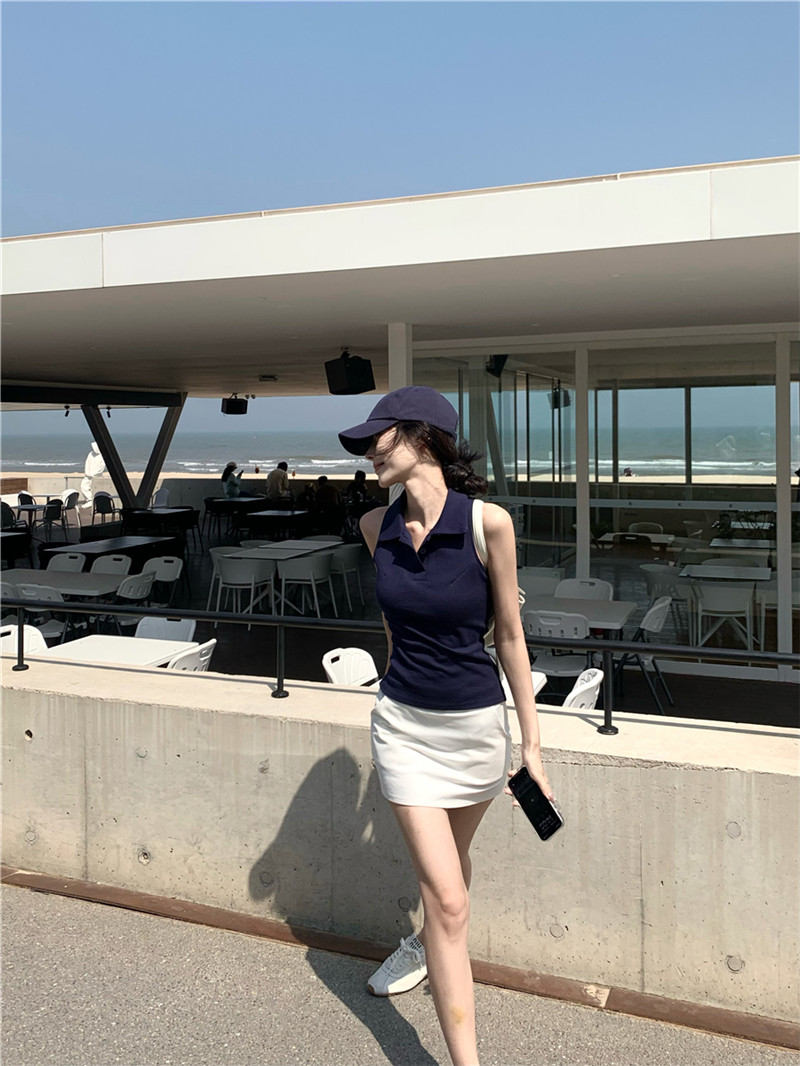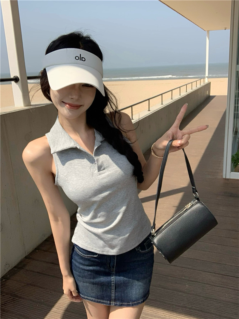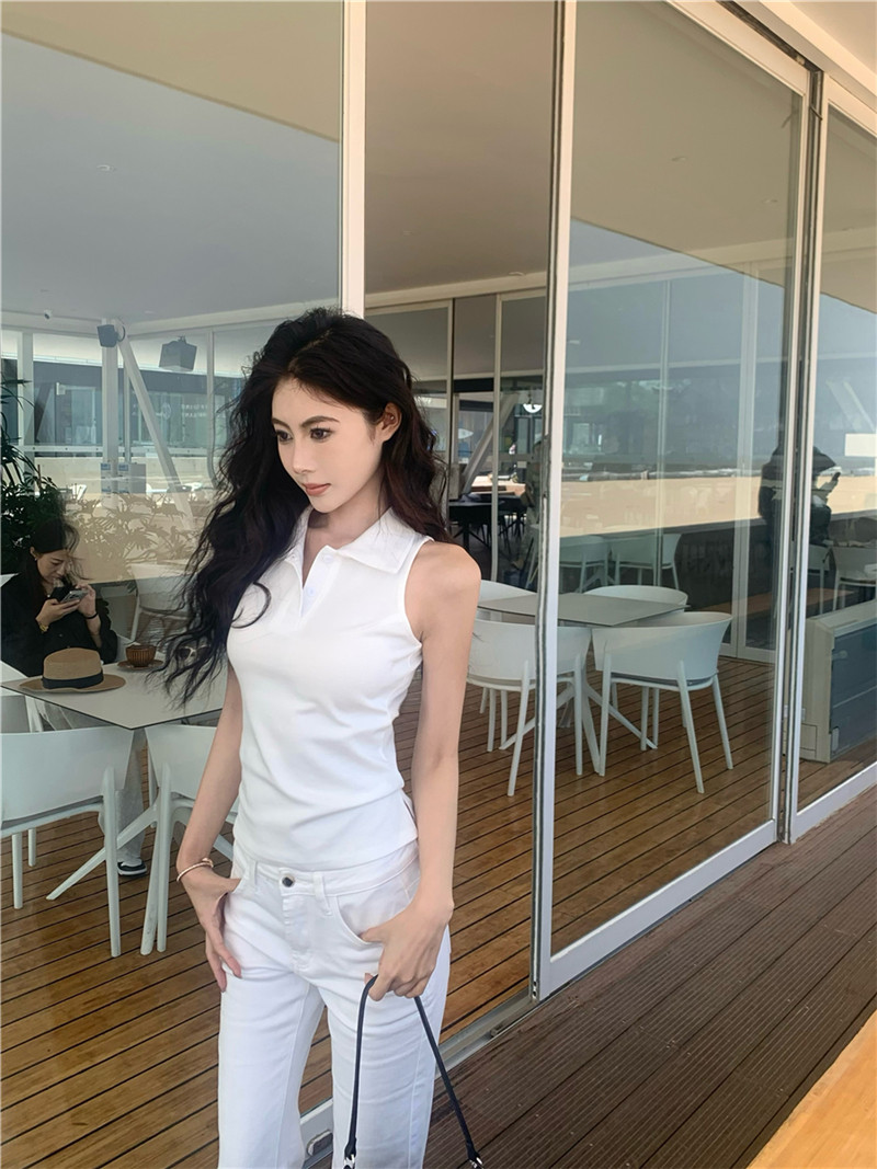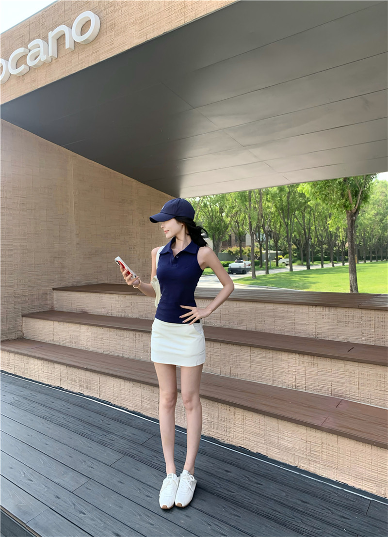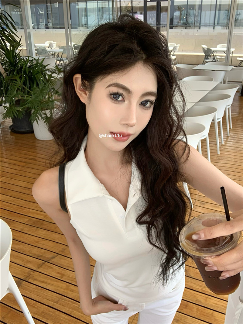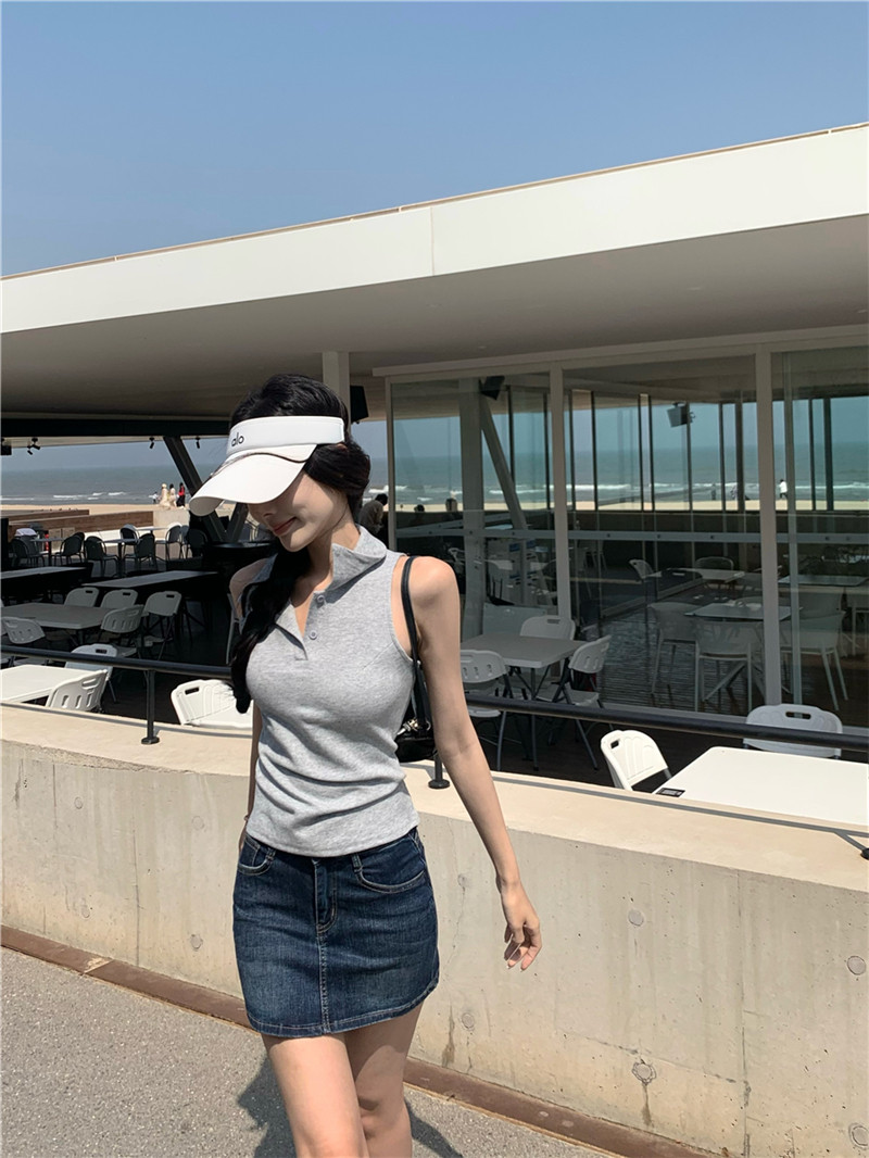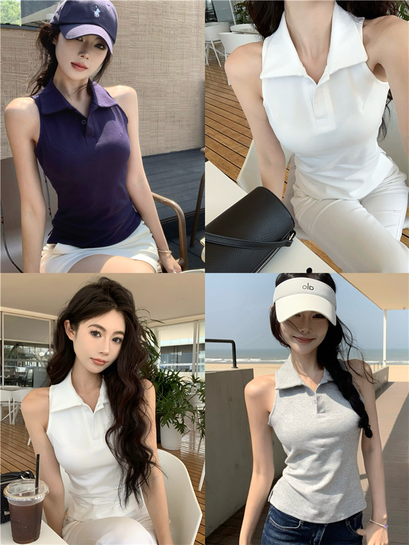 Basic cut-out polo neck sleeveless vest T-shirt