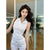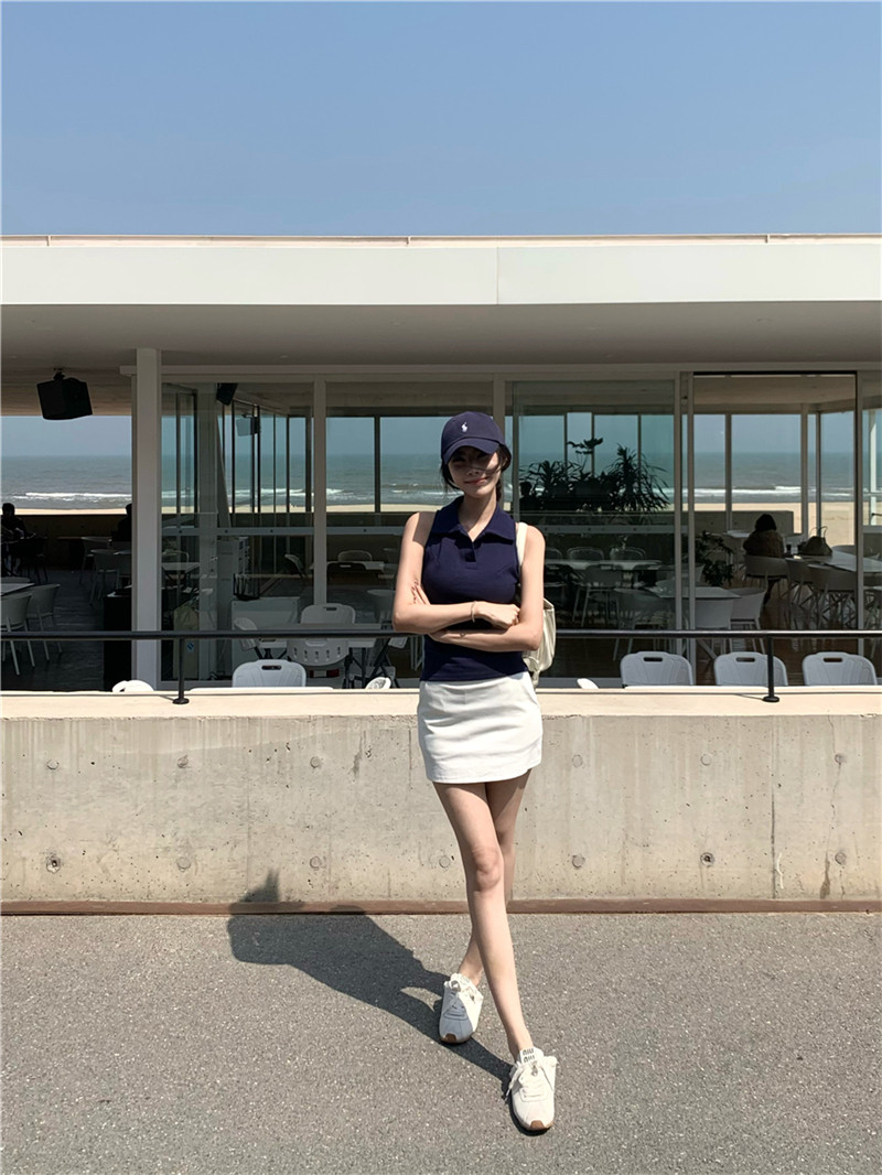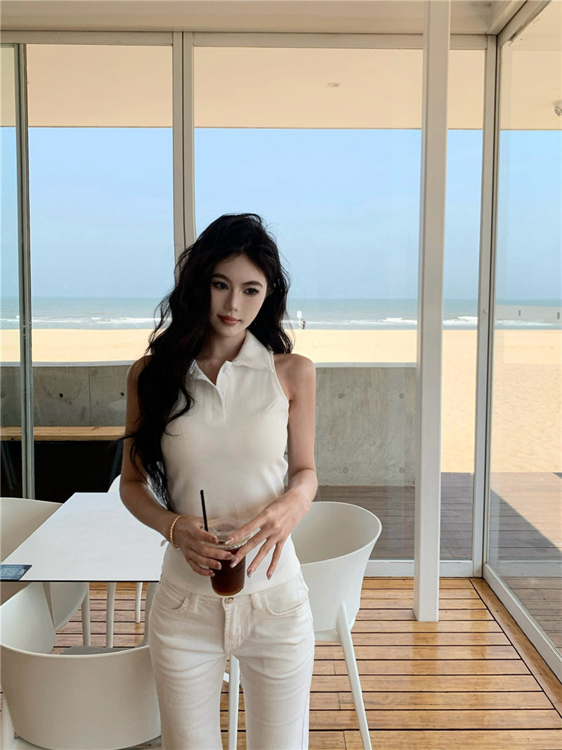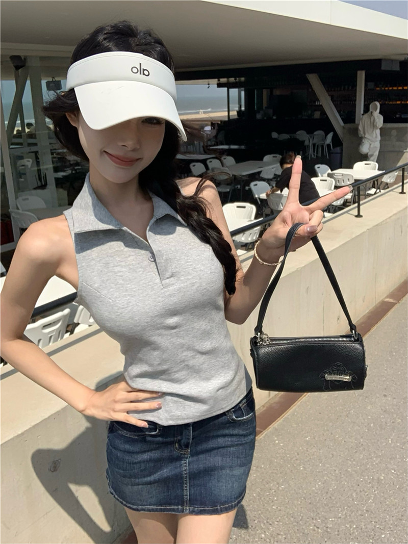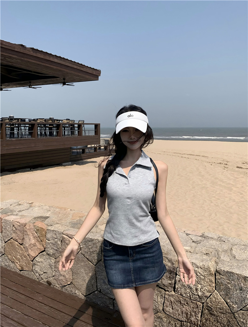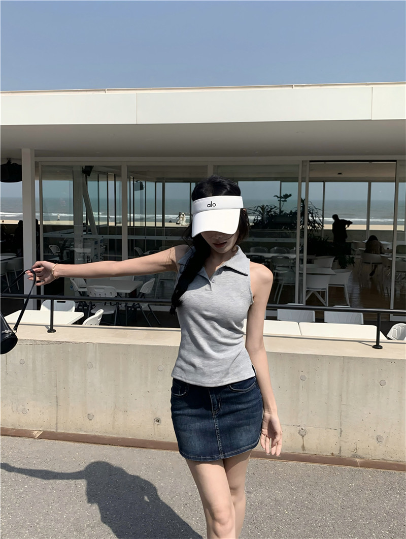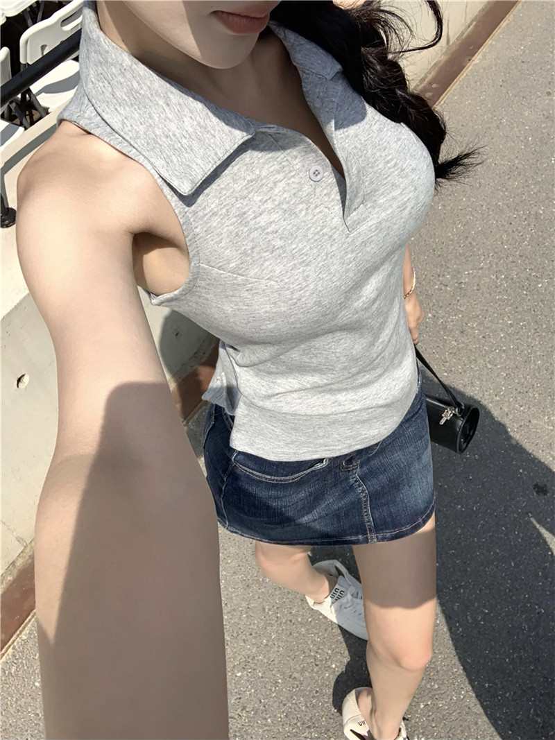 Basic cut-out polo neck sleeveless vest T-shirt
