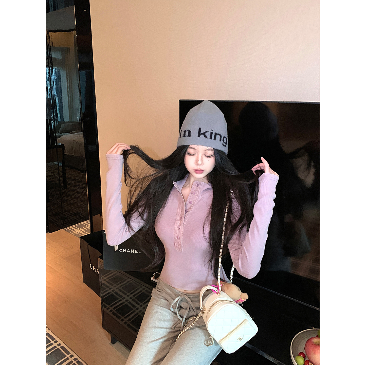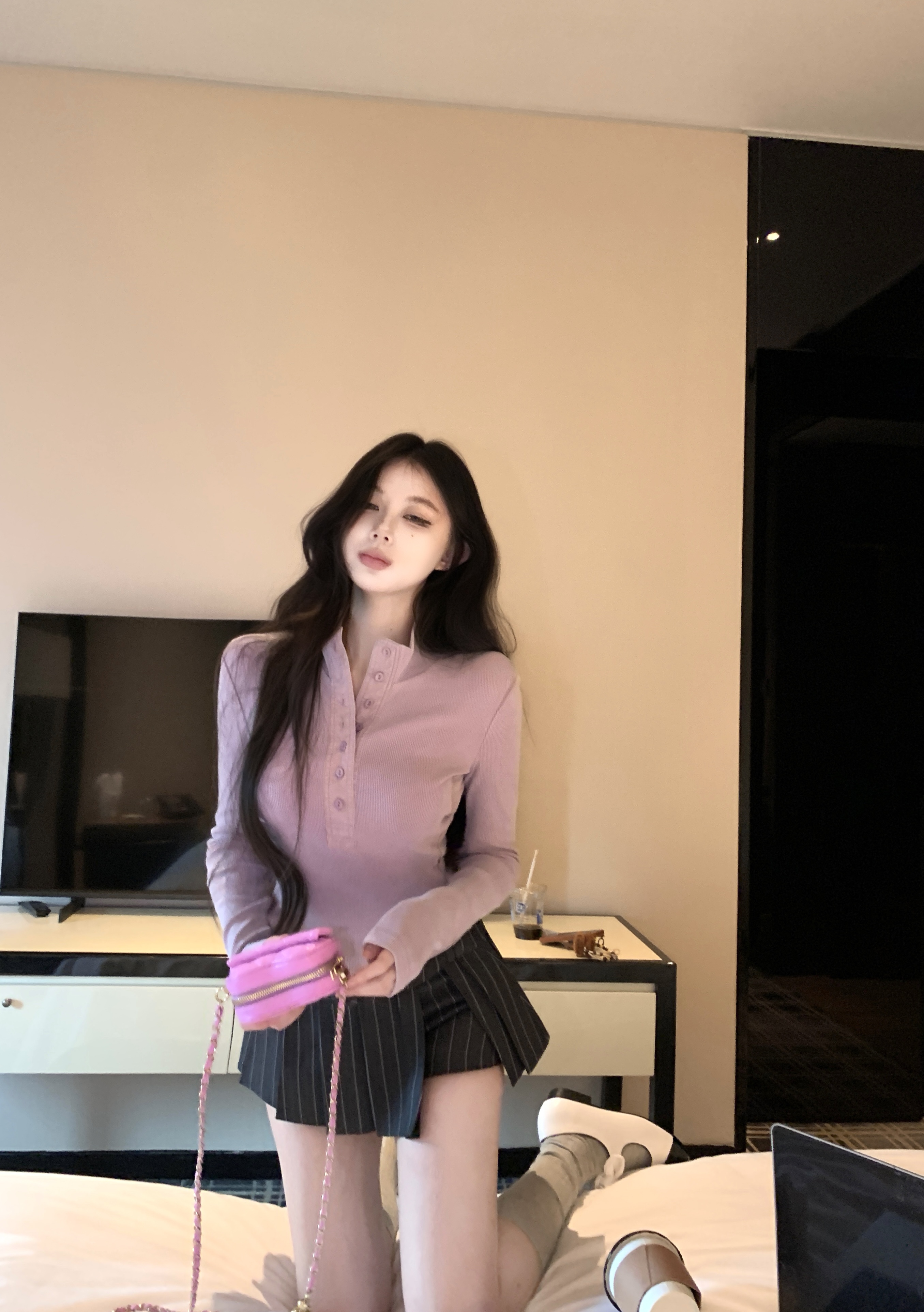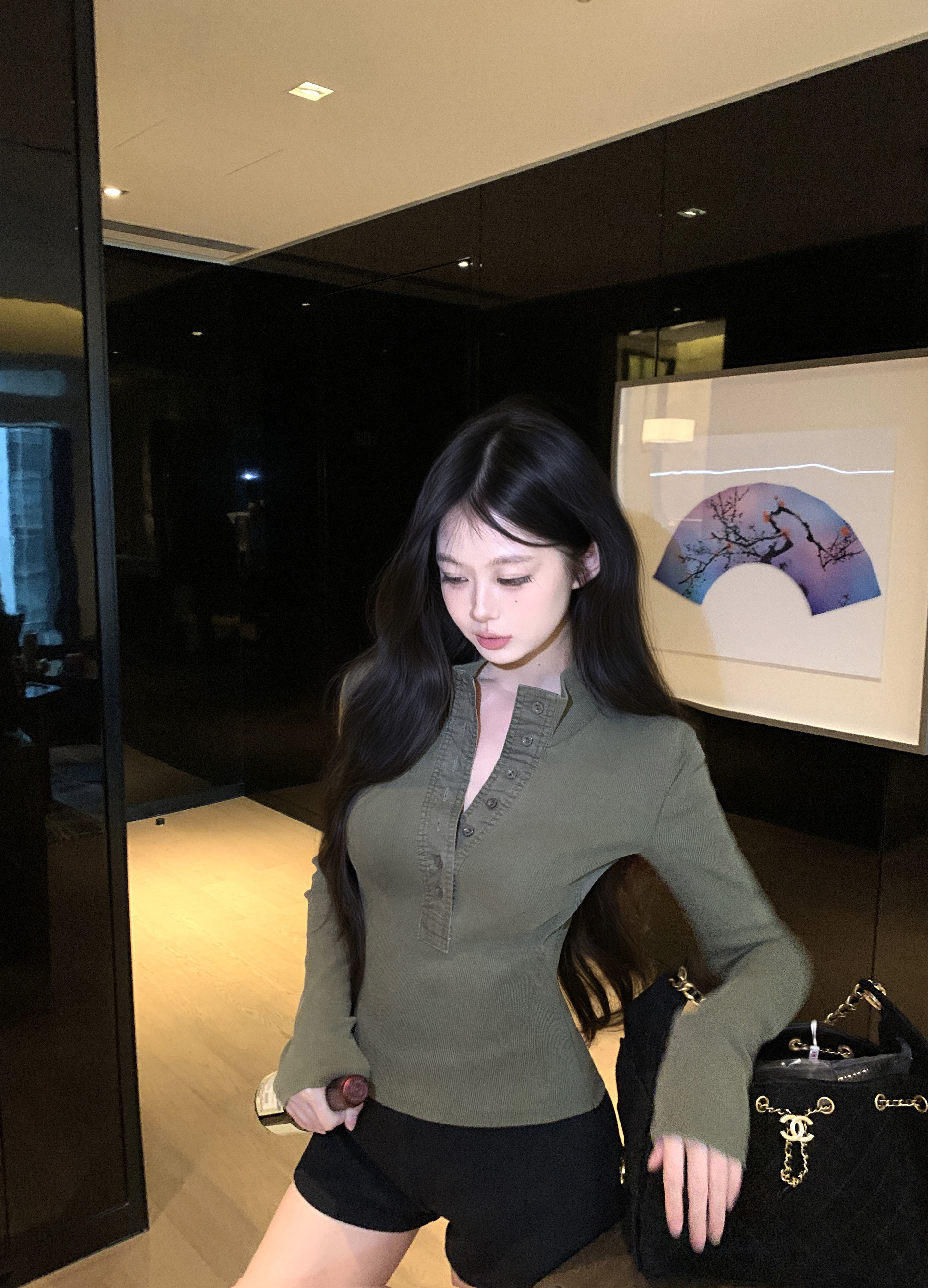 Black strawberry button-down stand-up collar long sleeve T-shirt