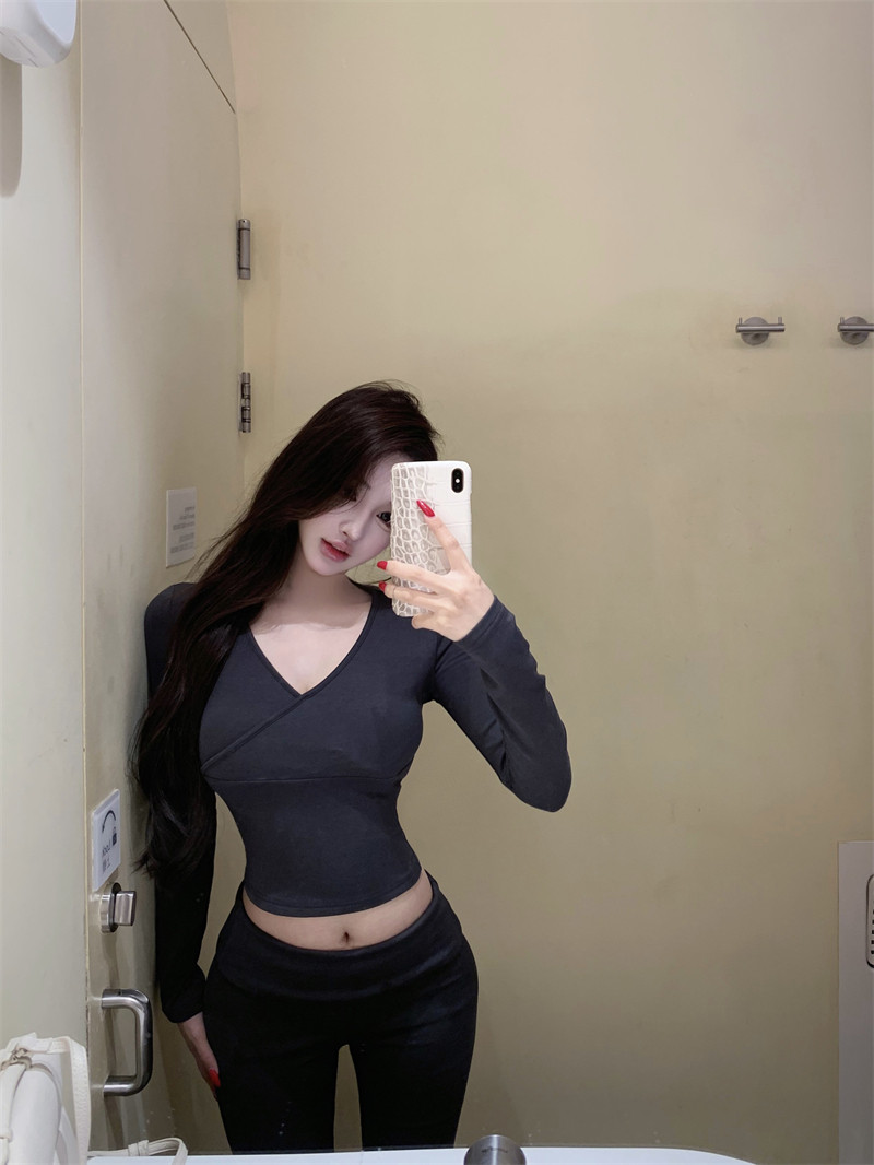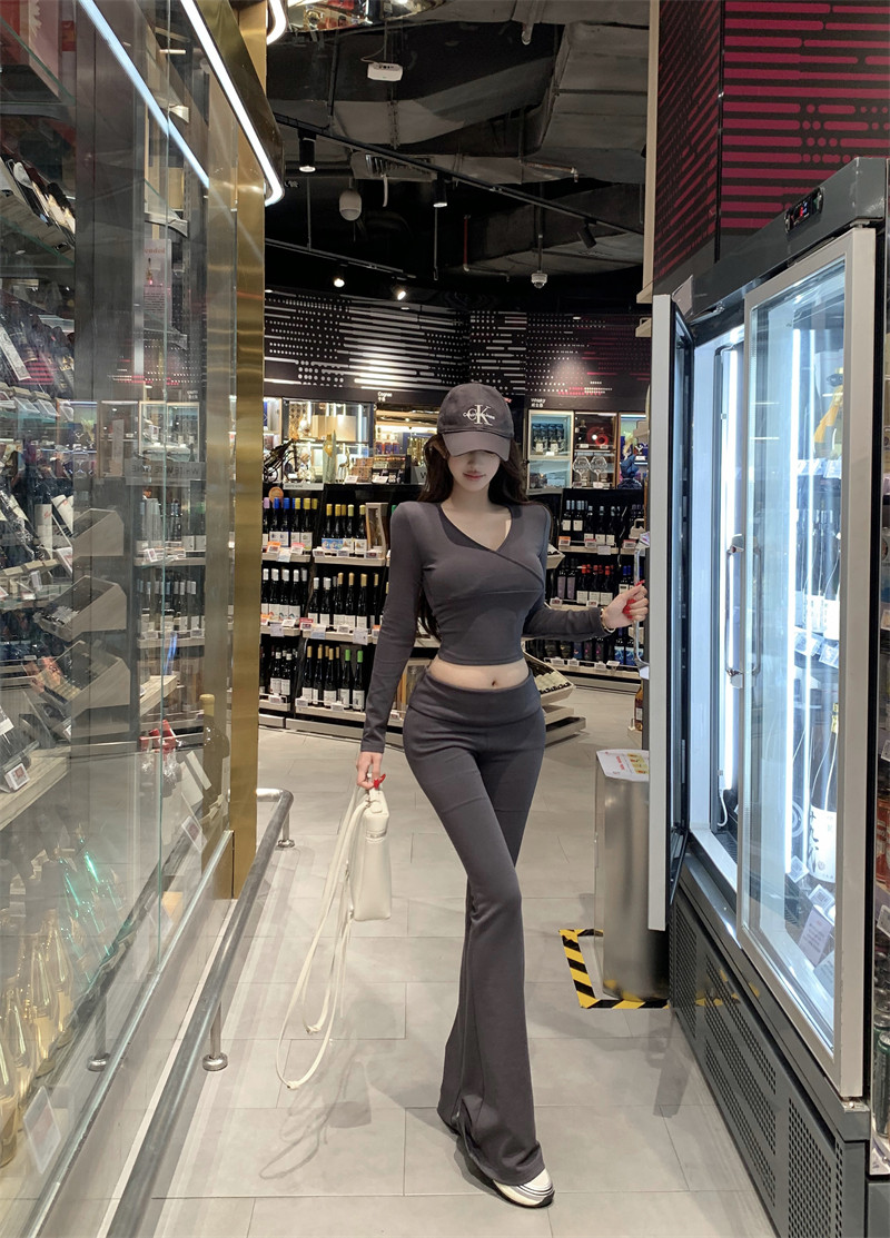 Casual sportswear hot girl gray V-neck skinny long sleeve T-shirt women's spring high-waisted micro-flared trousers two-piece set