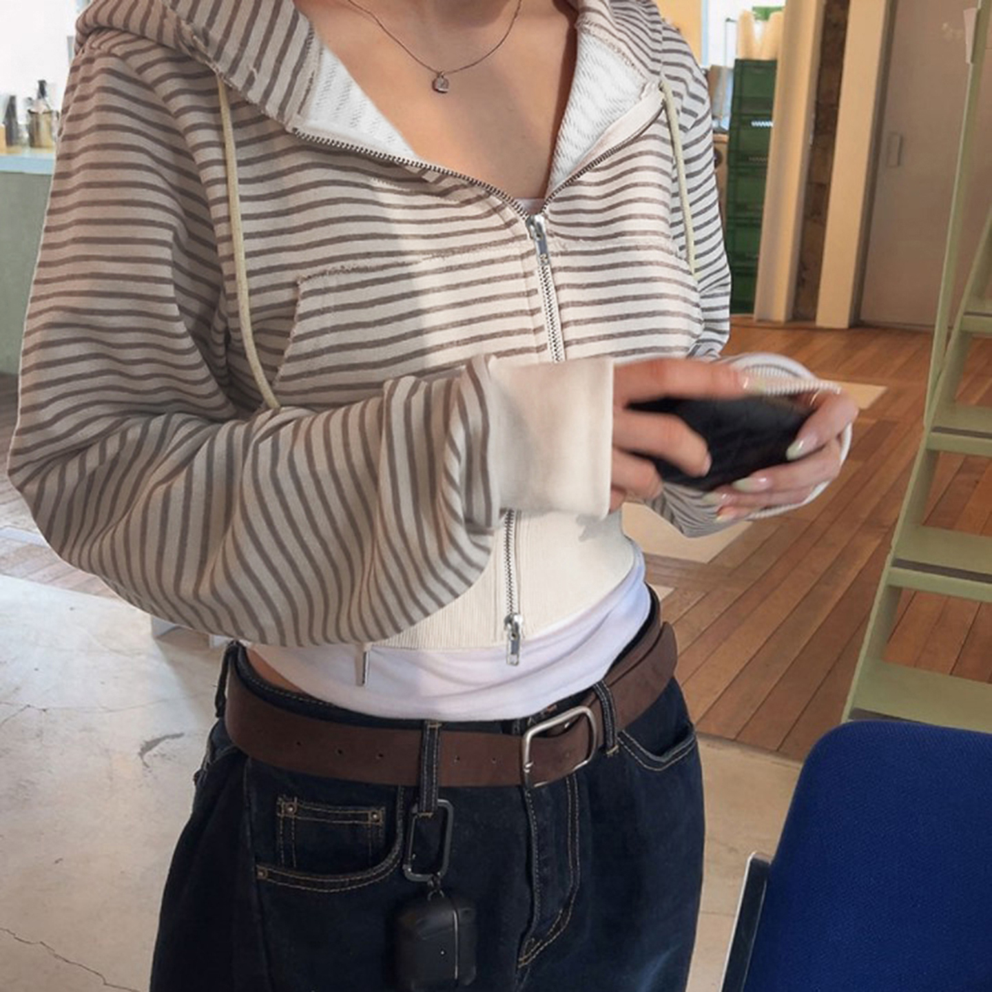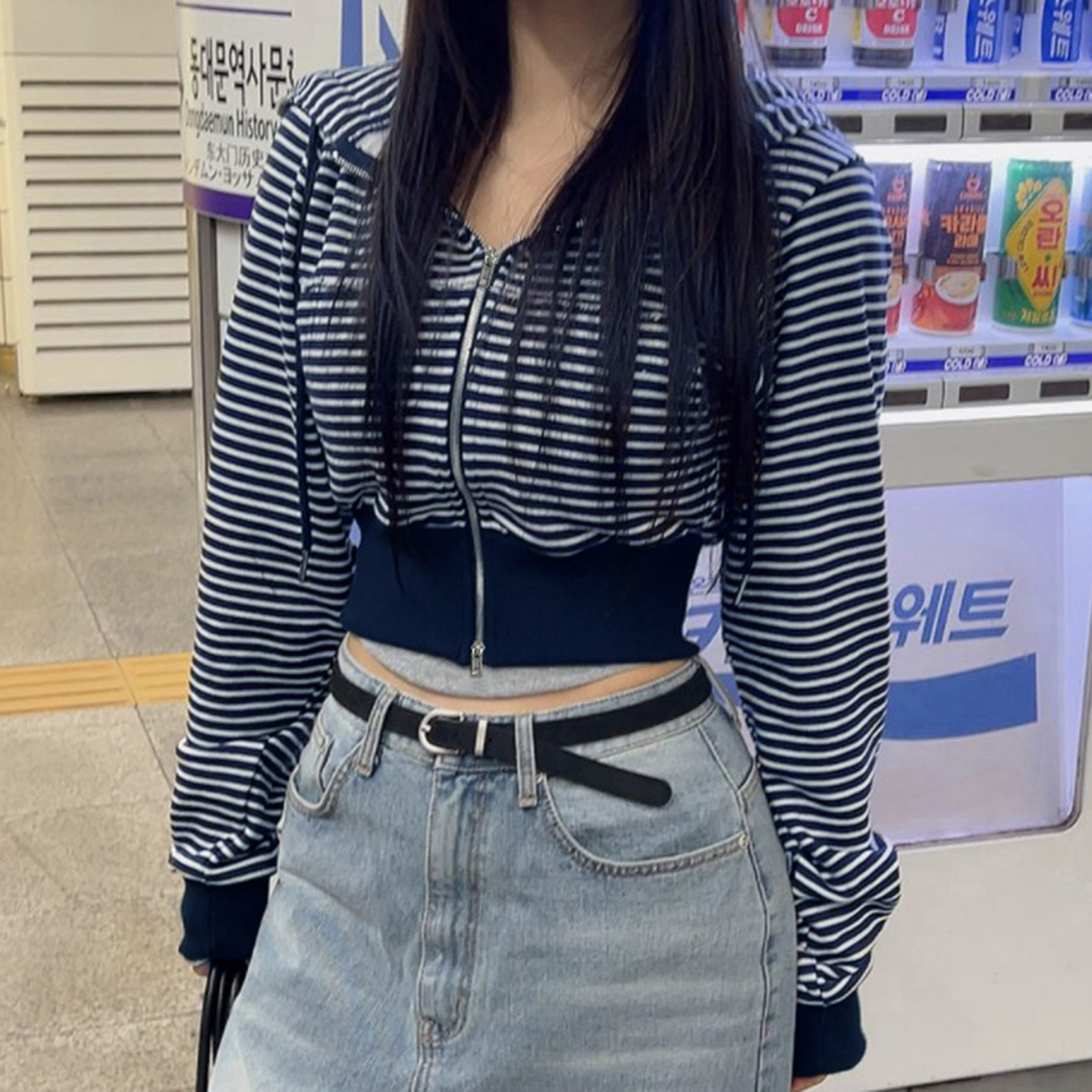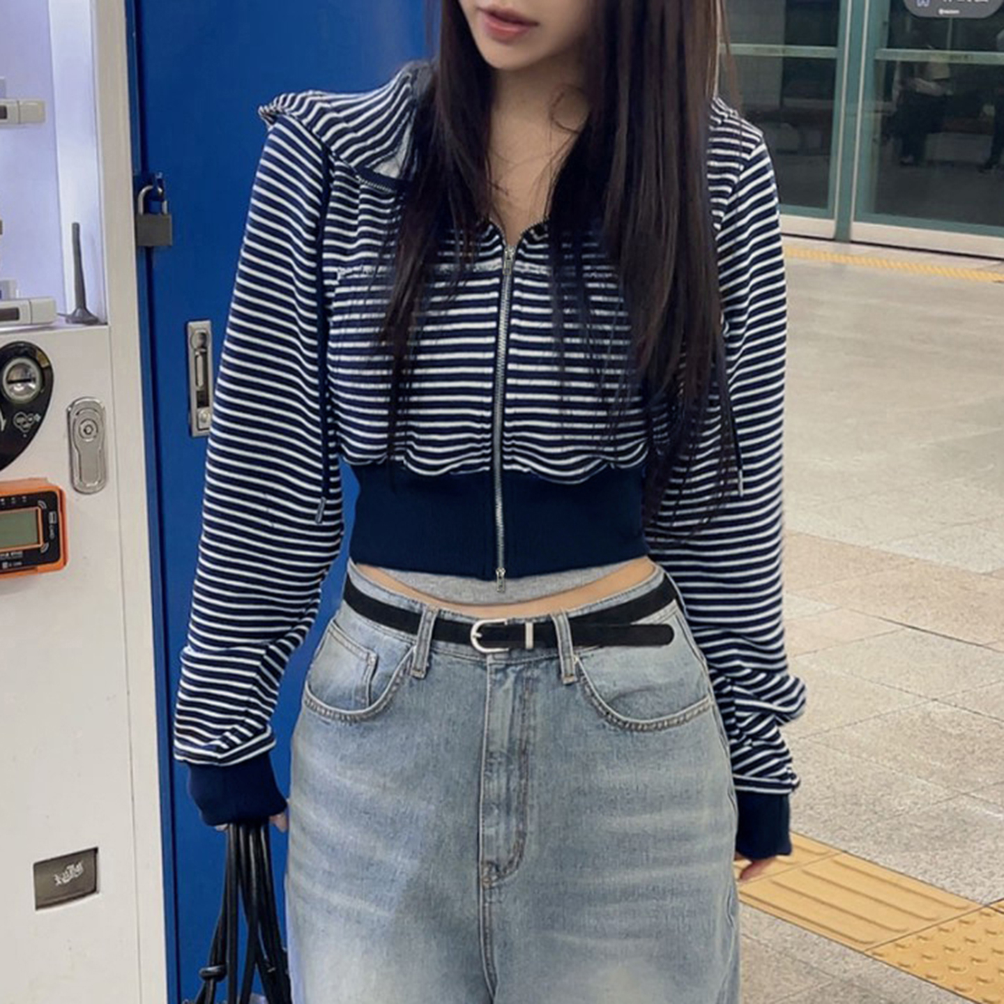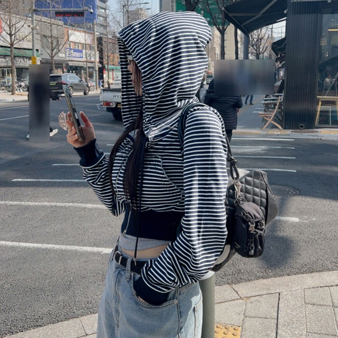 Casual Versatile Contrast Striped Hooded Zip Short Coats