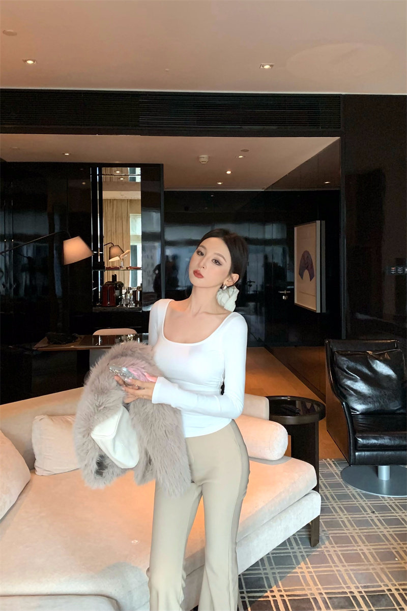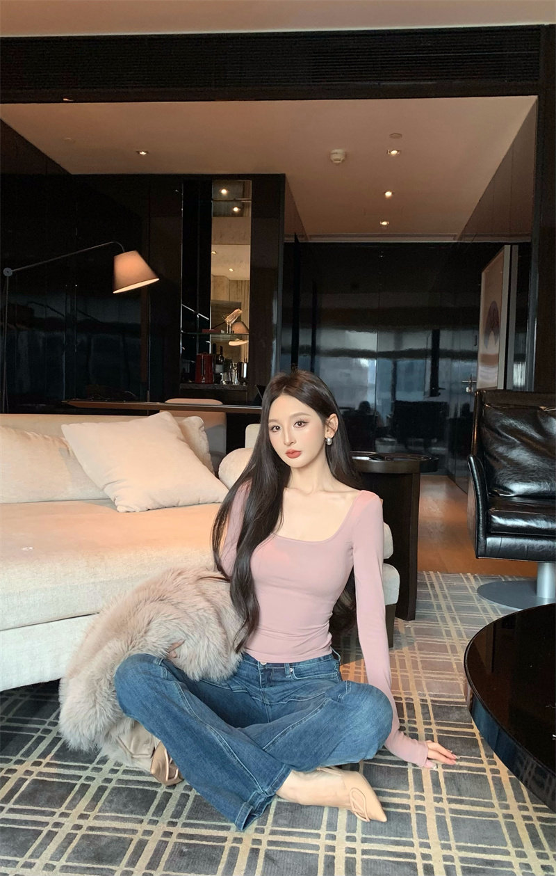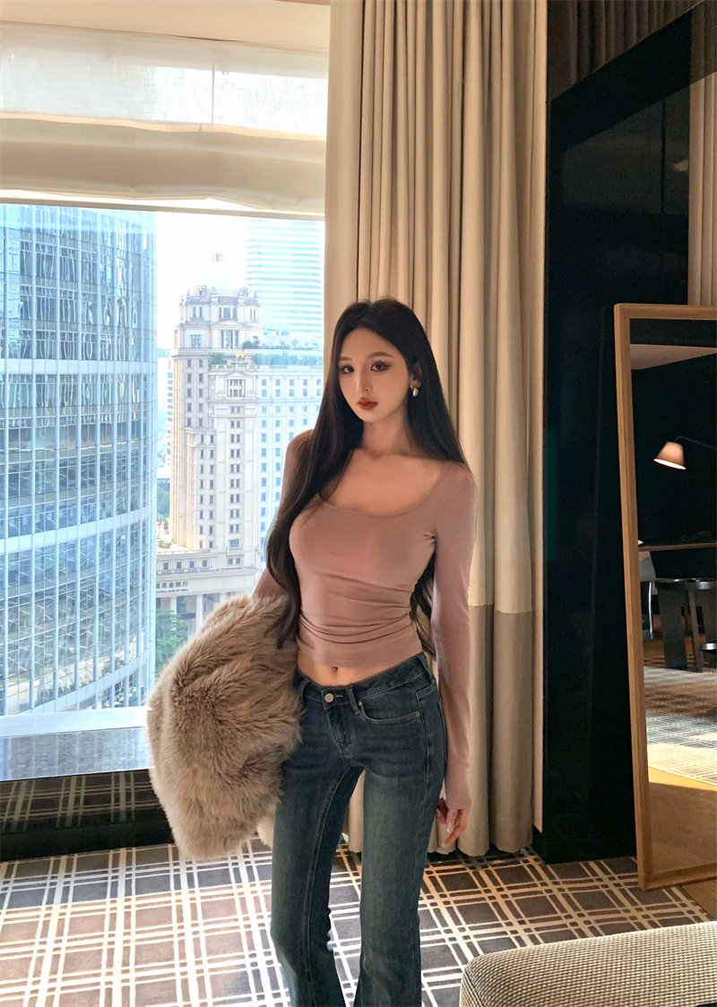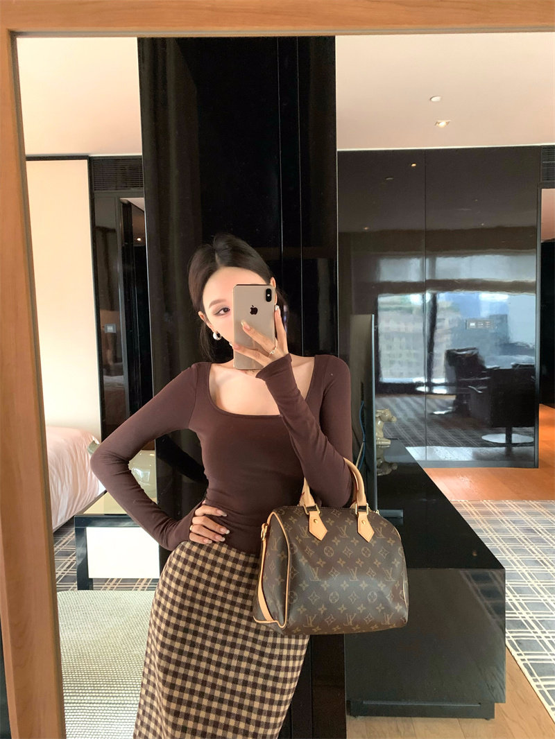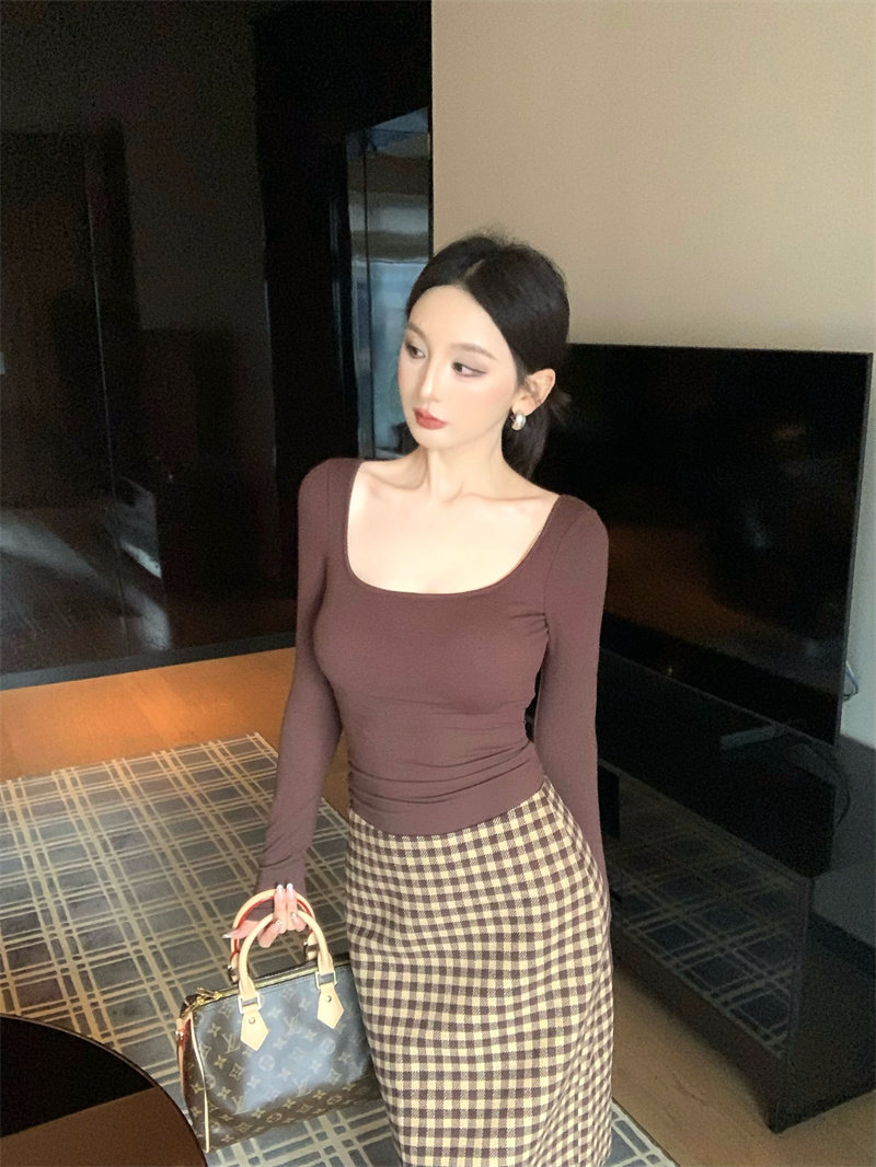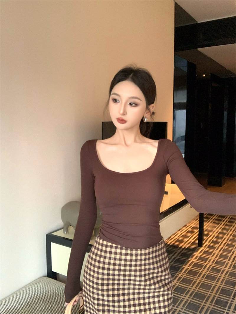 Coffee color U-neck long-sleeved pullover T-shirt