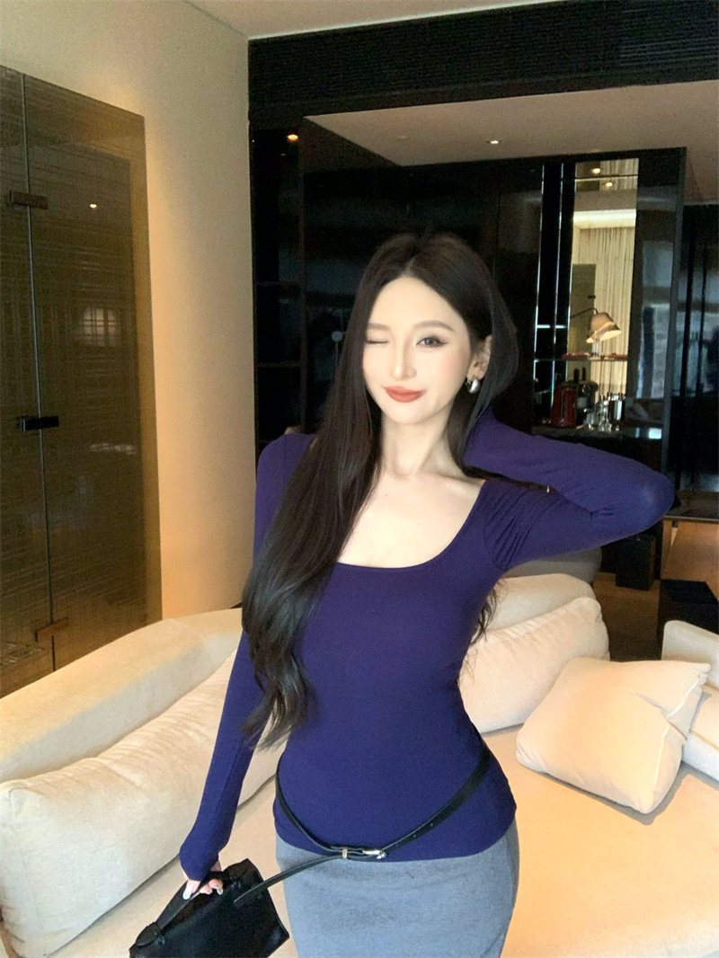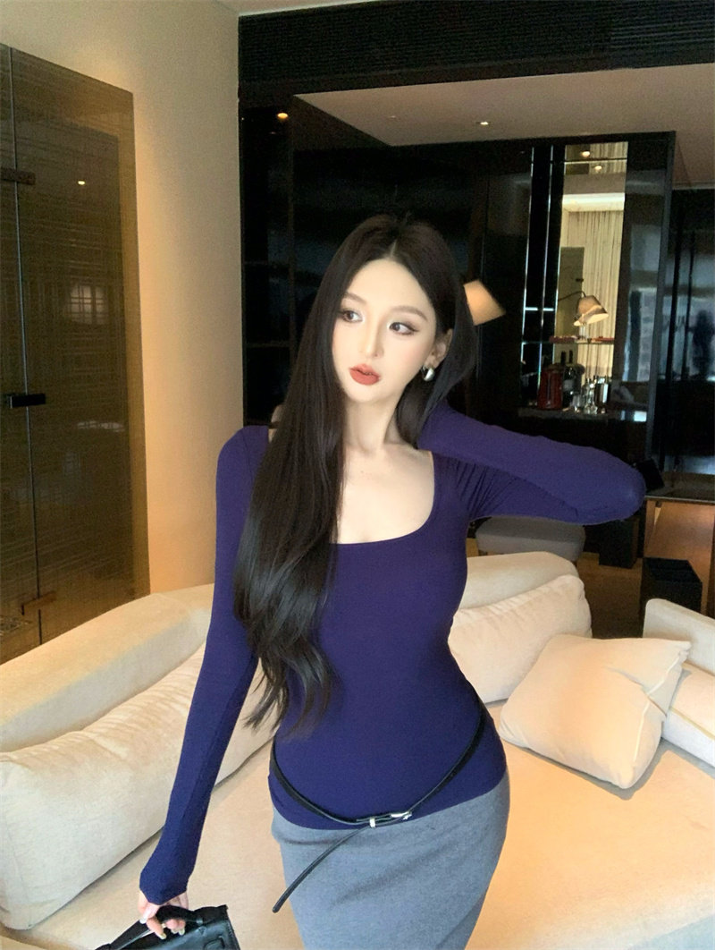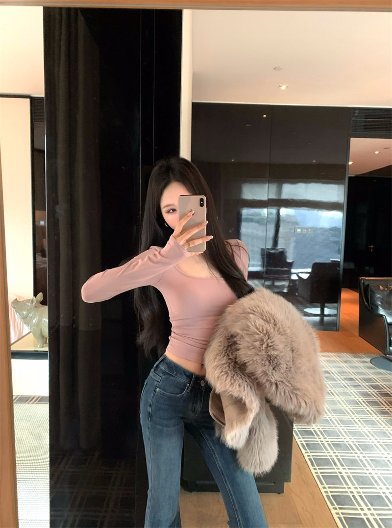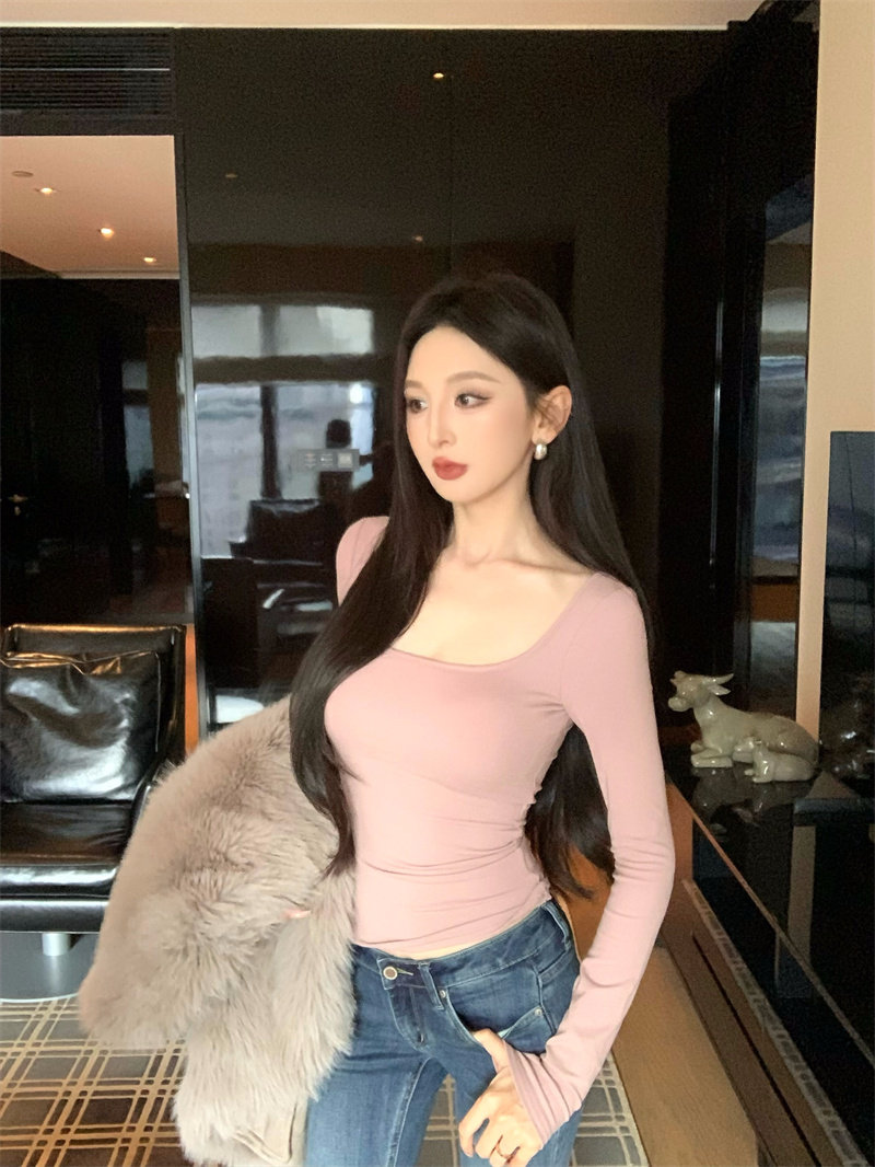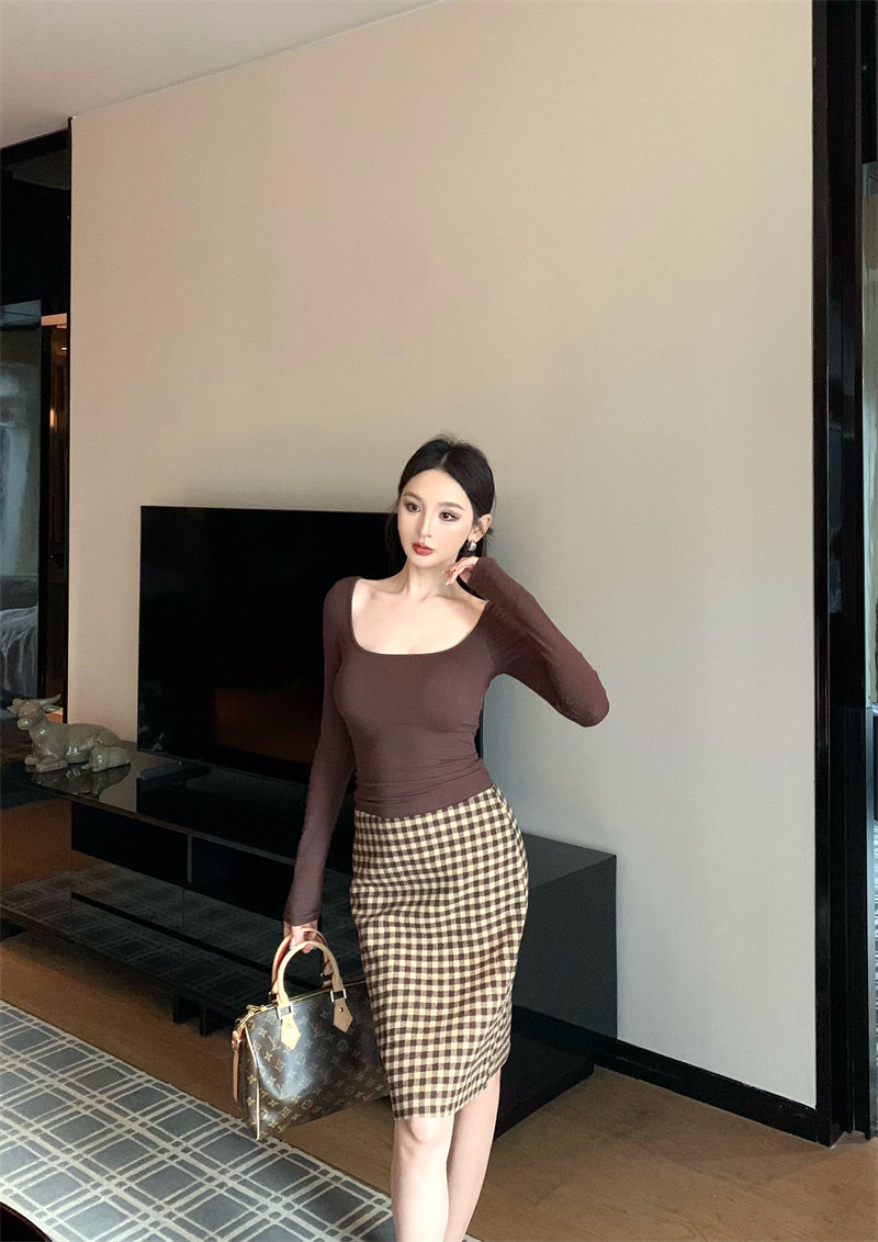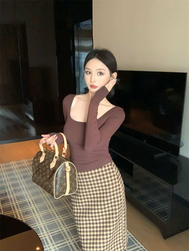 Coffee color U-neck long-sleeved pullover T-shirt
