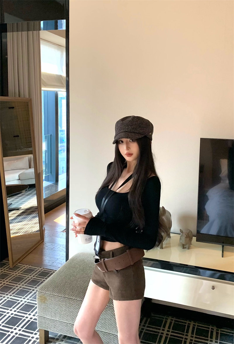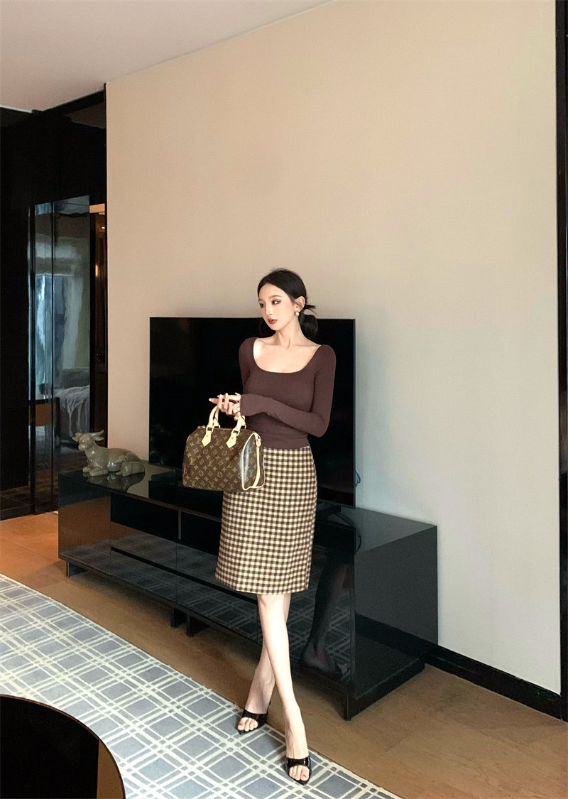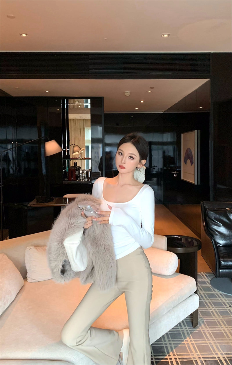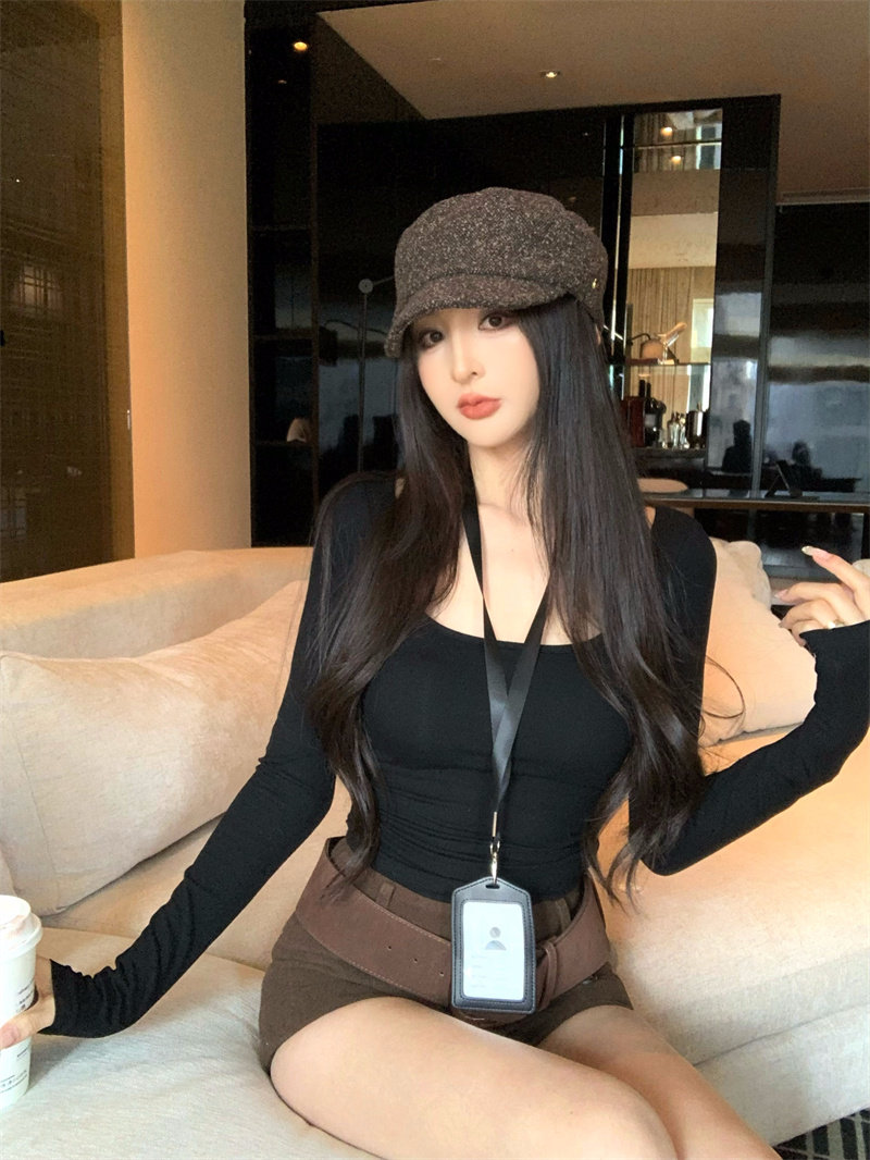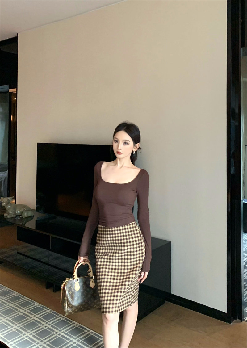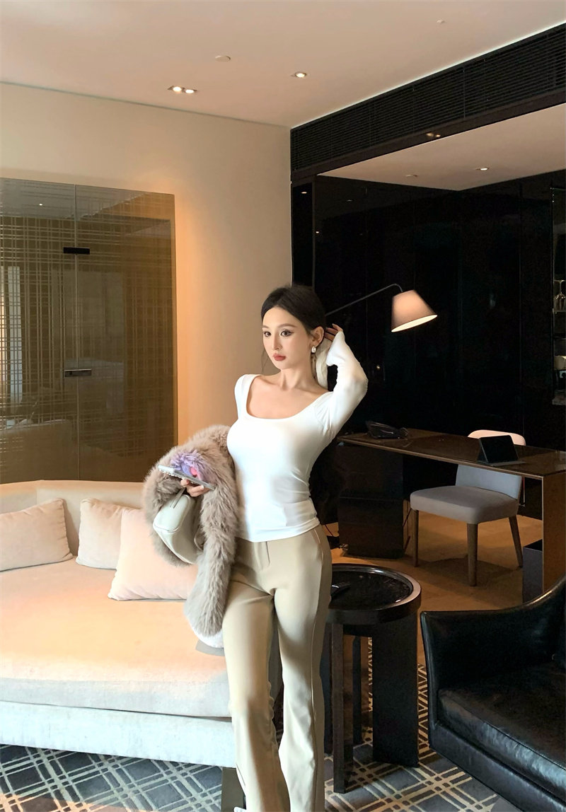 Coffee color U-neck long-sleeved pullover T-shirt
