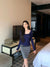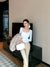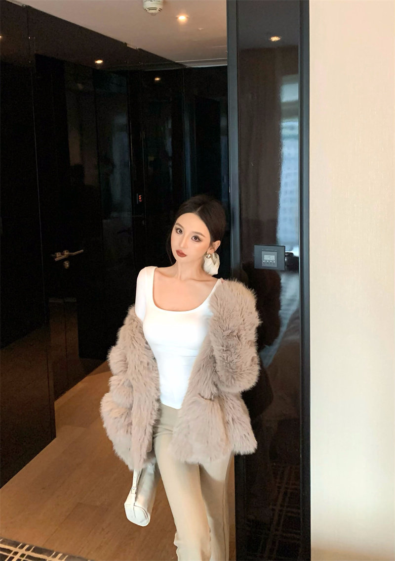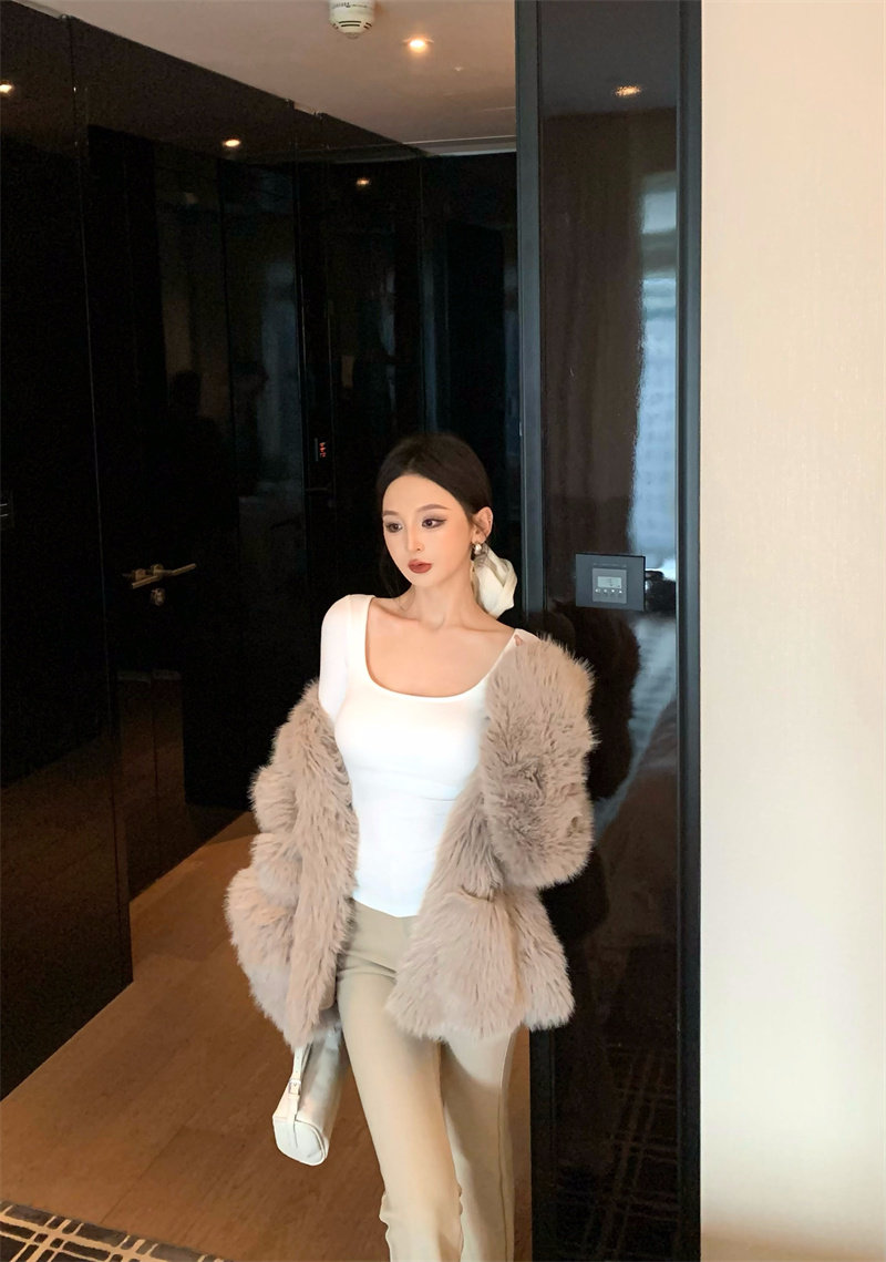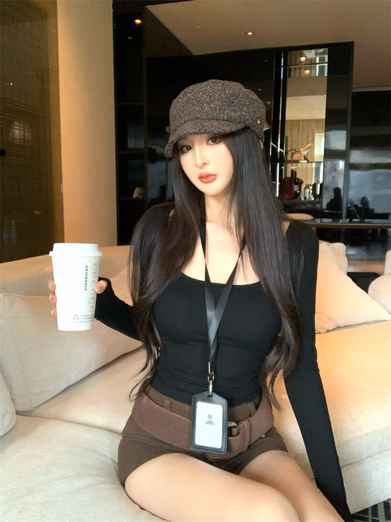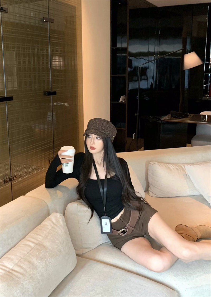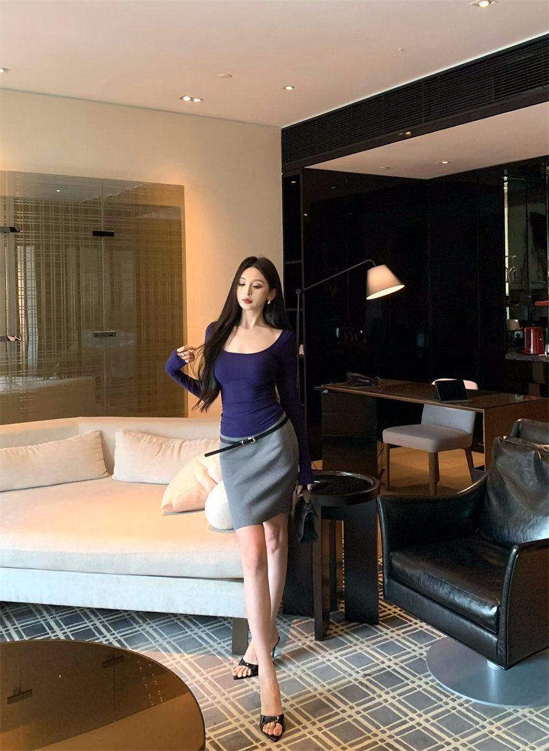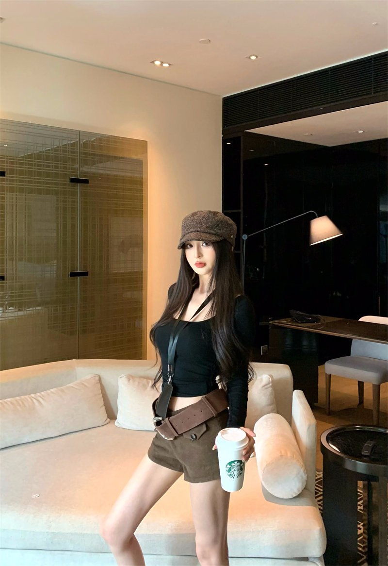 Coffee color U-neck long-sleeved pullover T-shirt