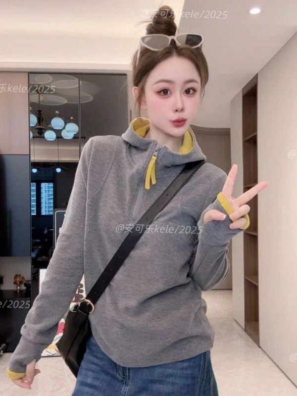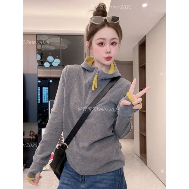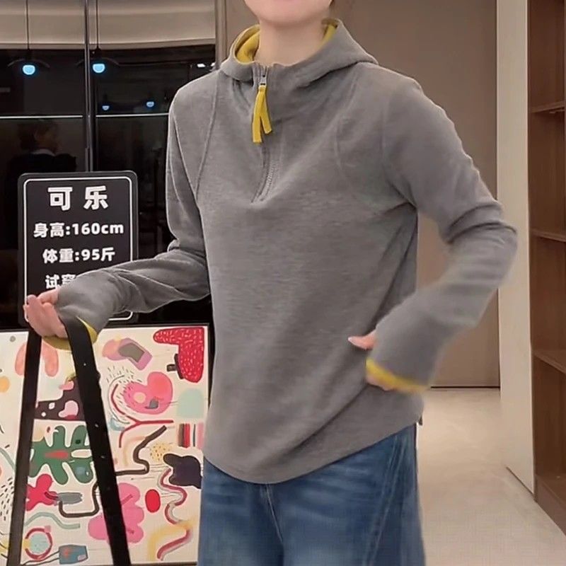 Double-sided velvet contrasting semi-zipper fleece hoodie sweater