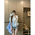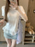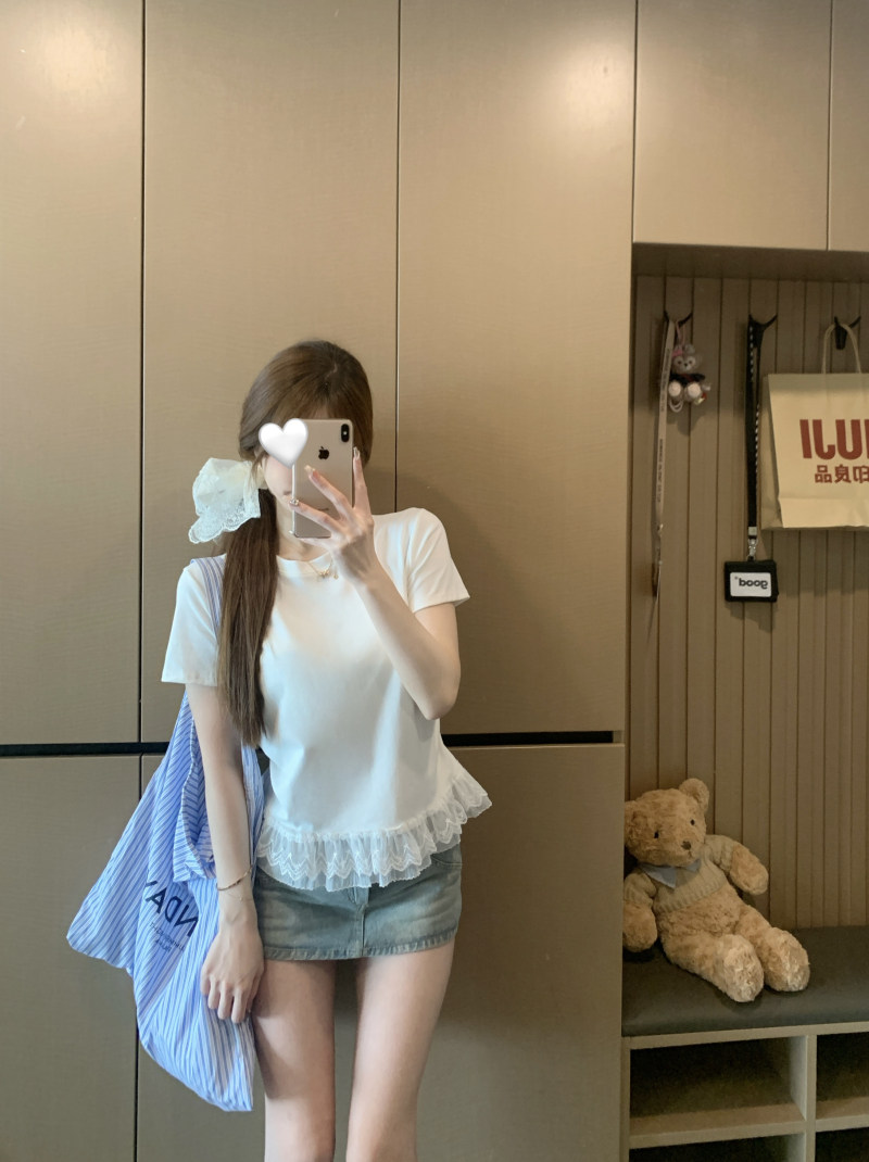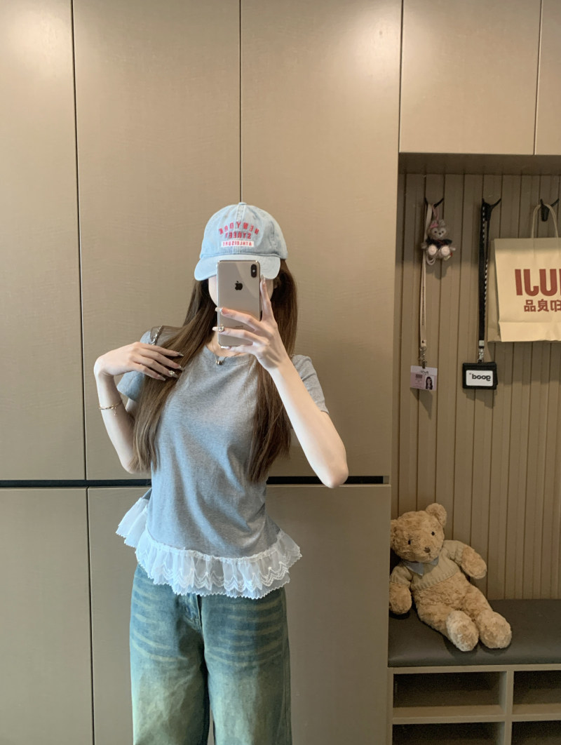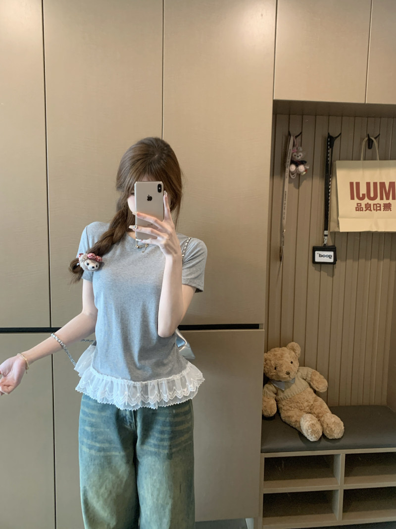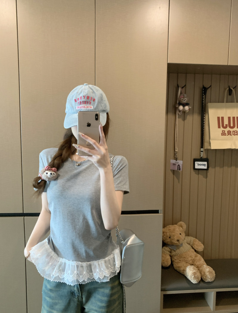 French gray lace patchwork crew neck short-sleeved T-shirt