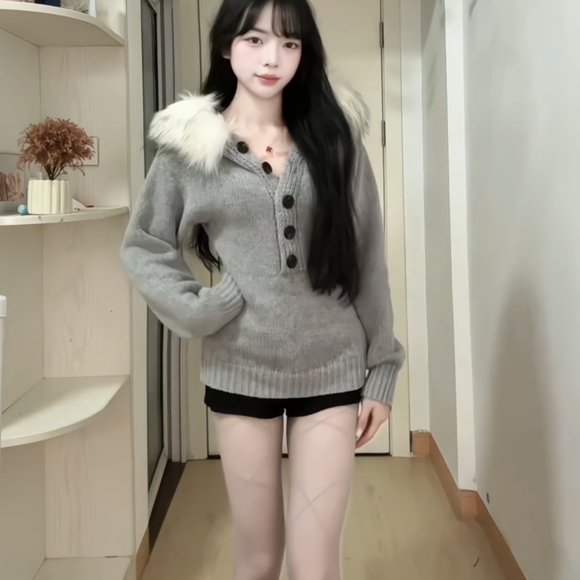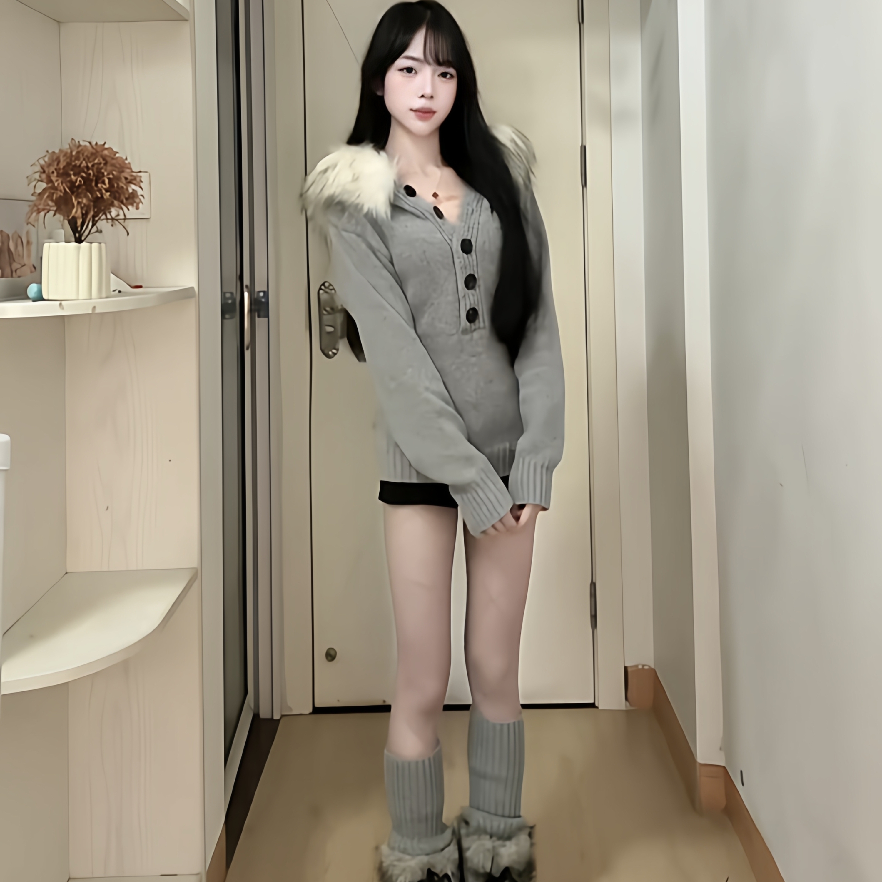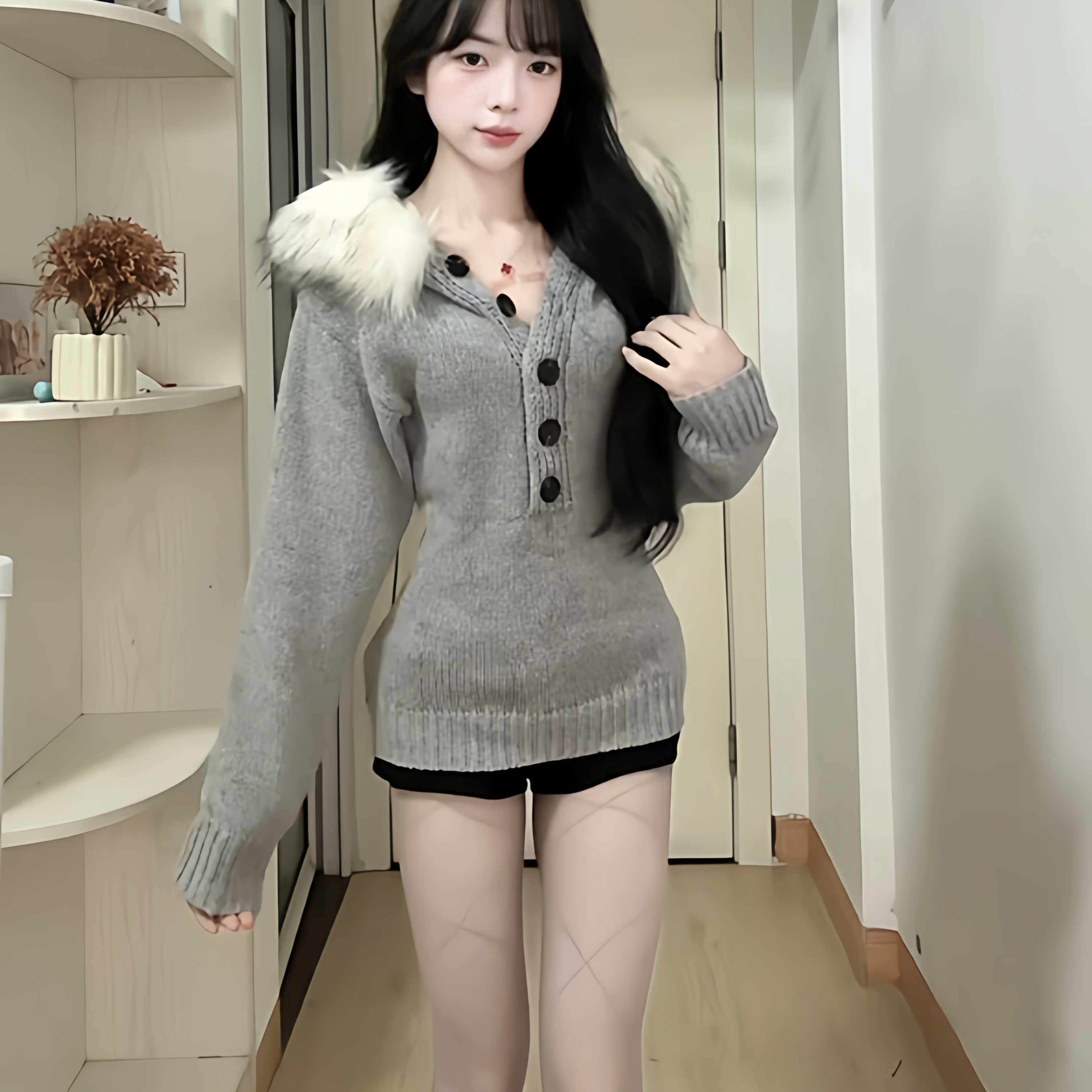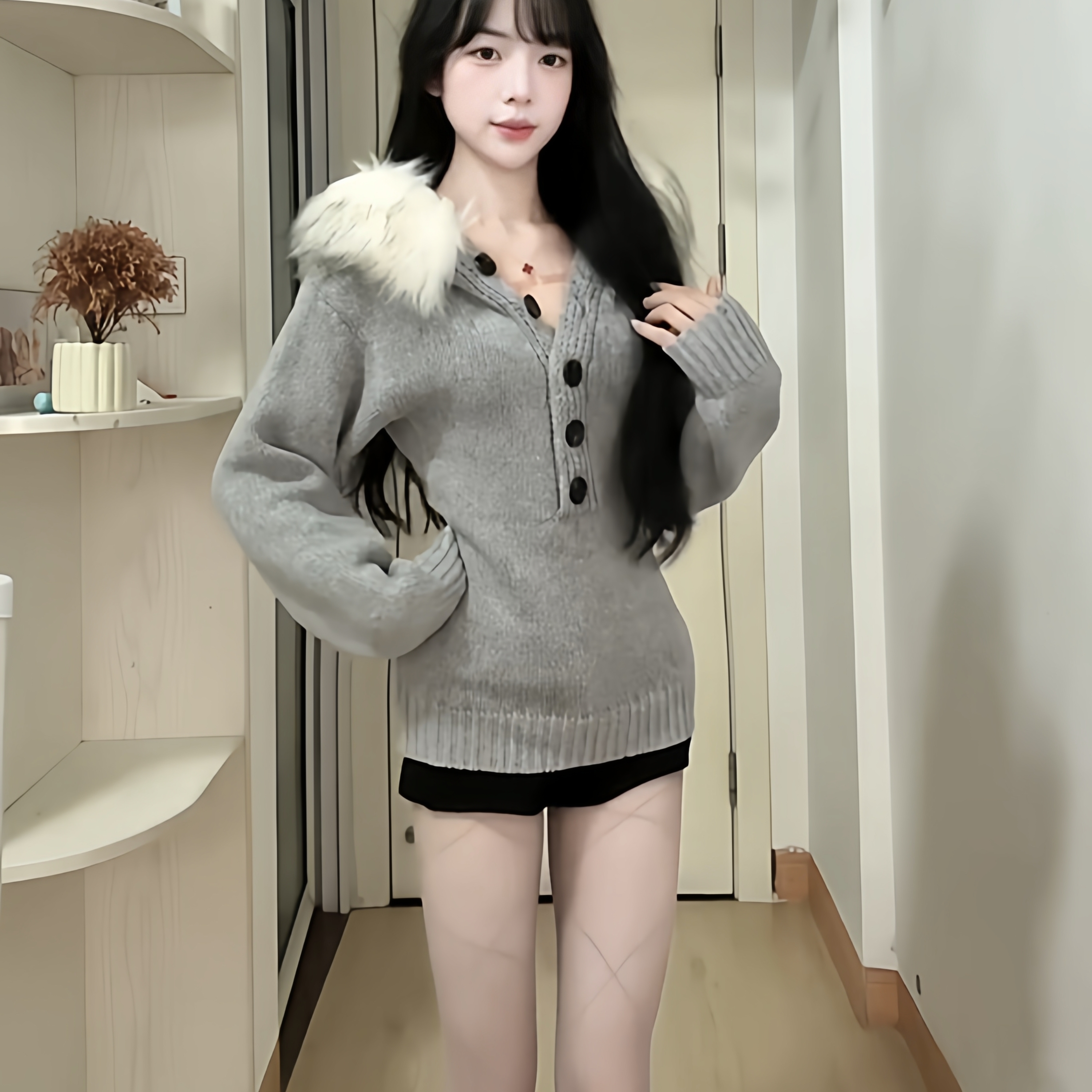 Gray fur collar hooded knittedsweater