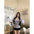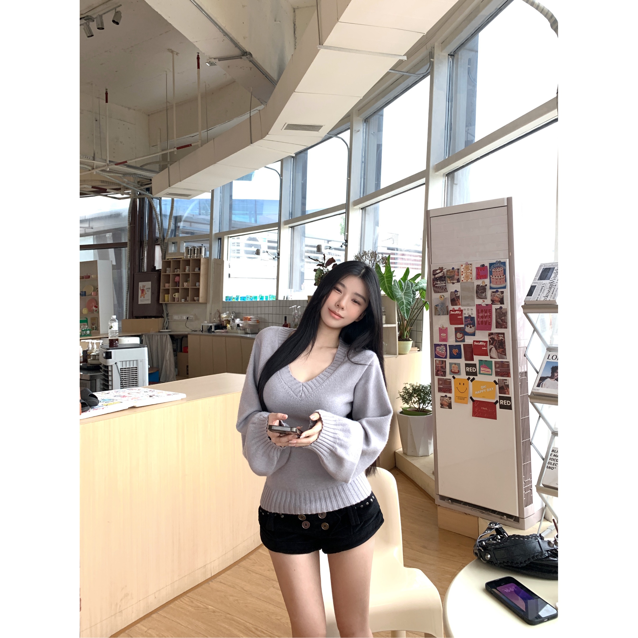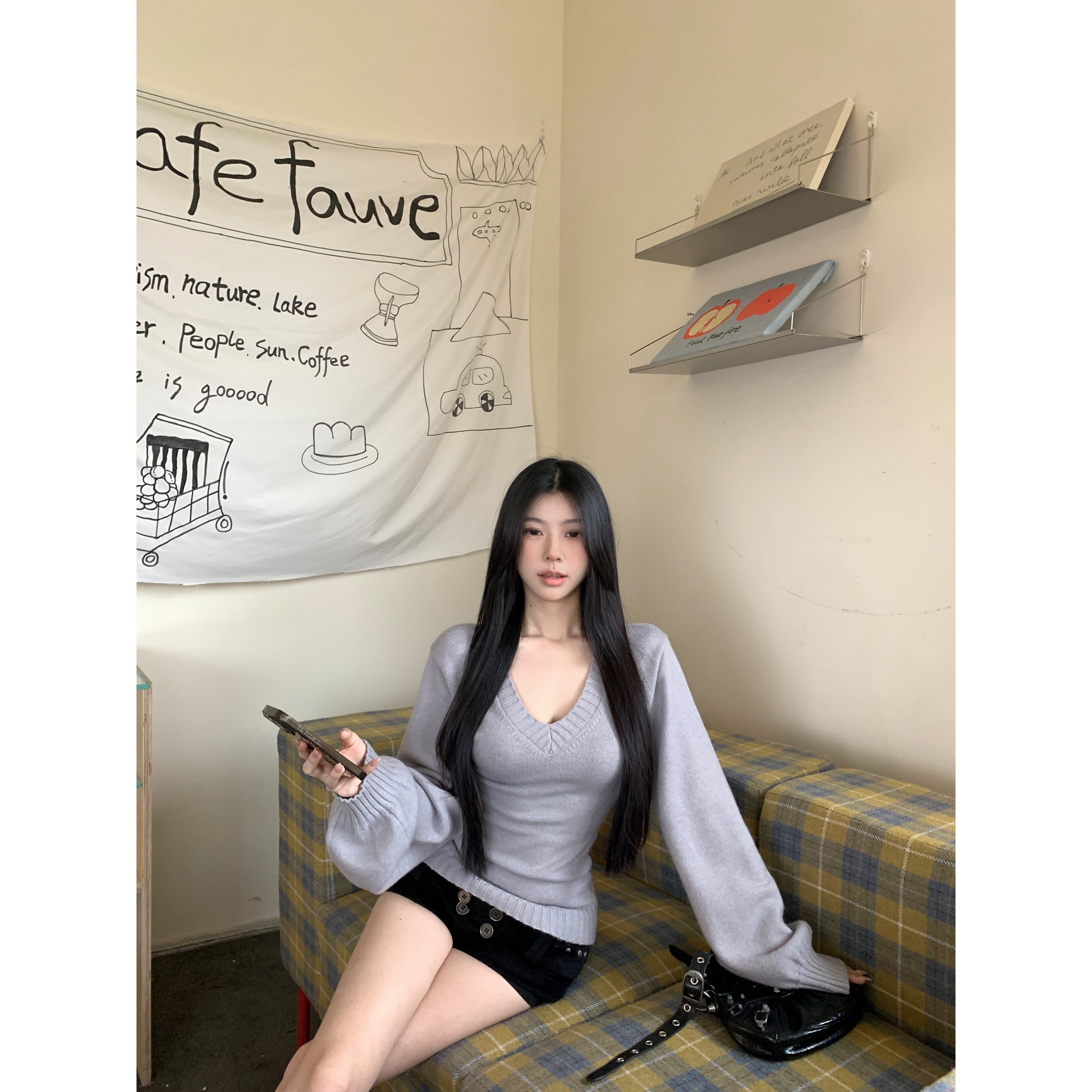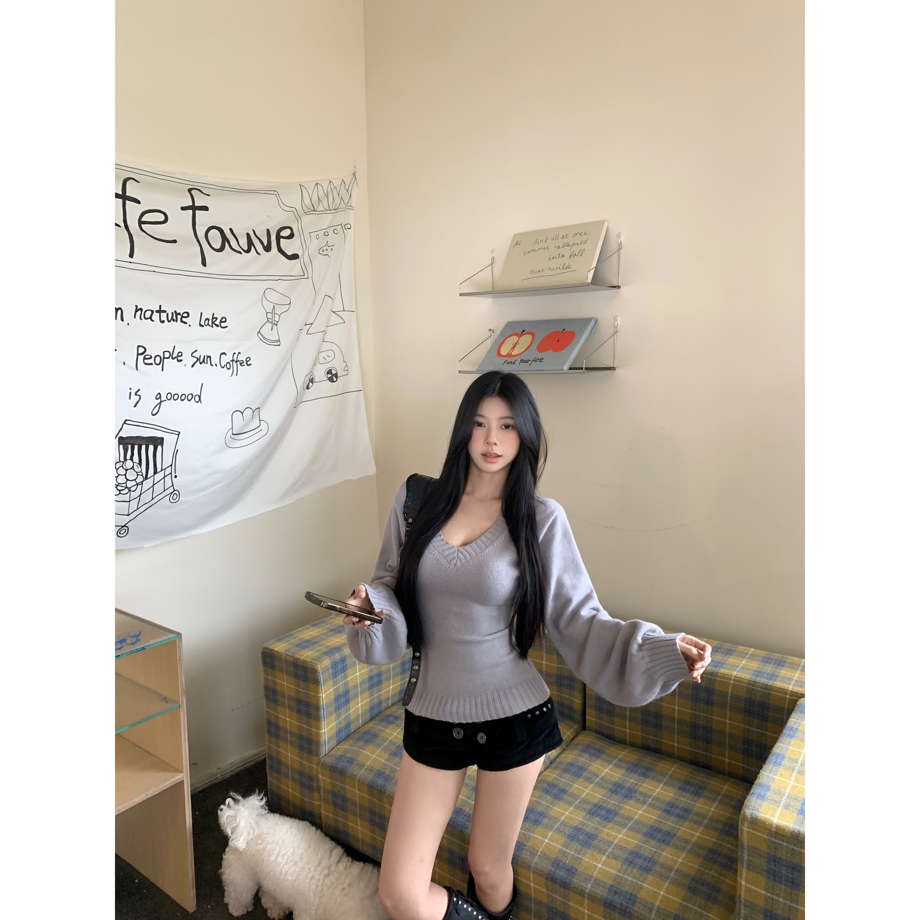 Gray V-neck long-sleeved soft glutinous pullover waist knitted sweater