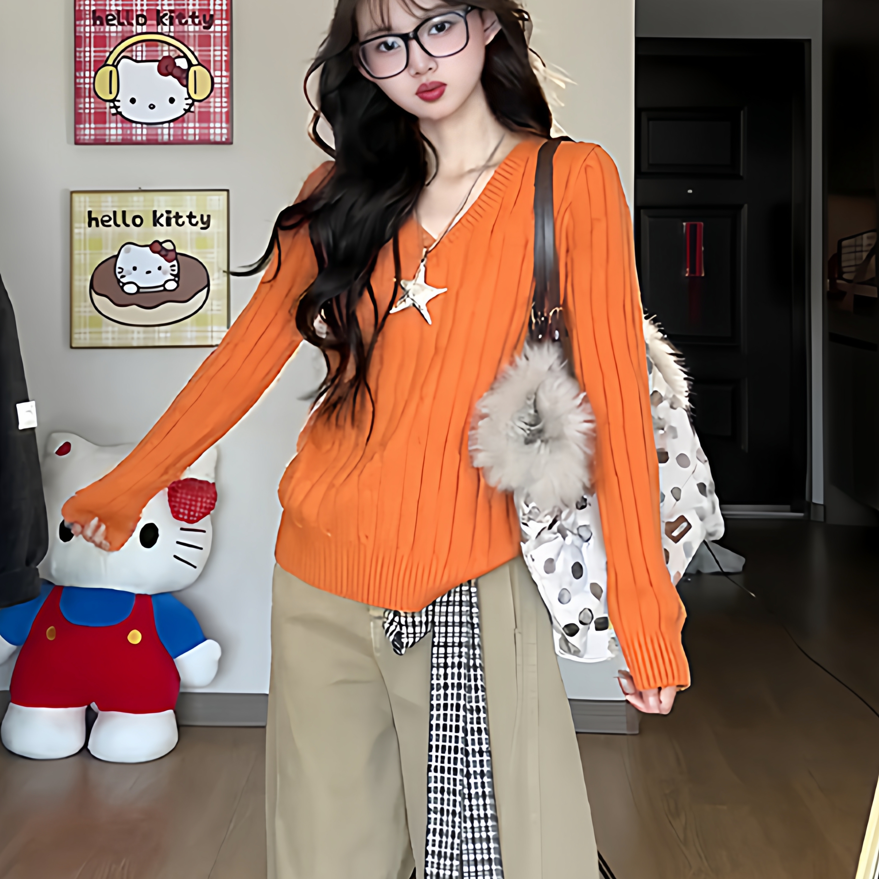 Korean dopamine orange V-neck twist sweater