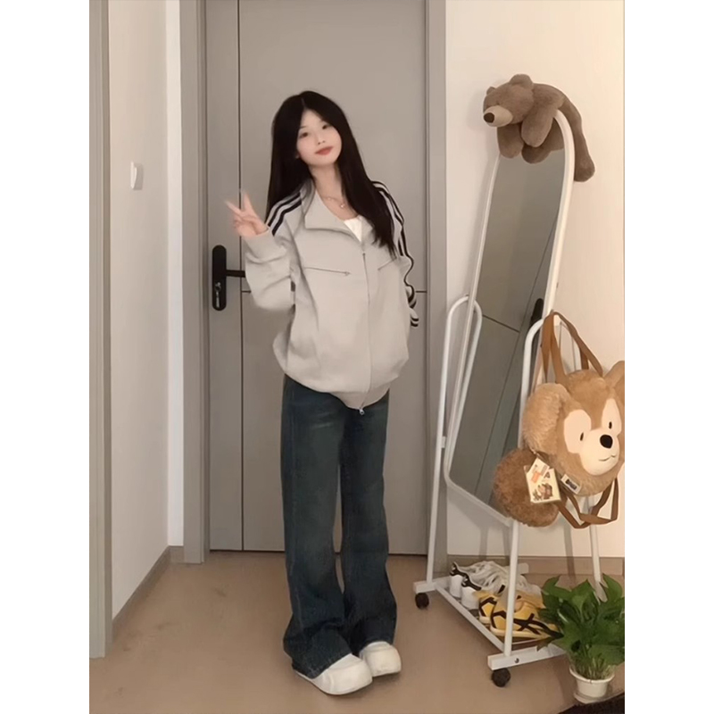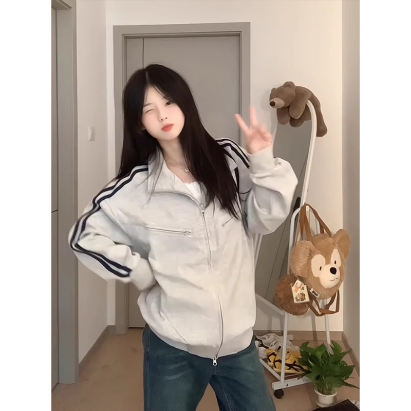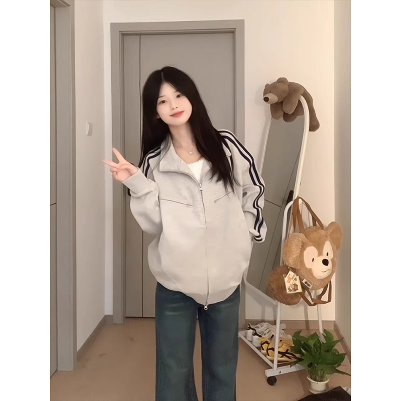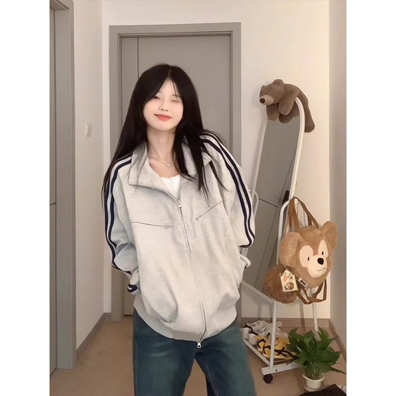Korean retro gray sweatshirt jacket baseball uniform loose sports style jacket