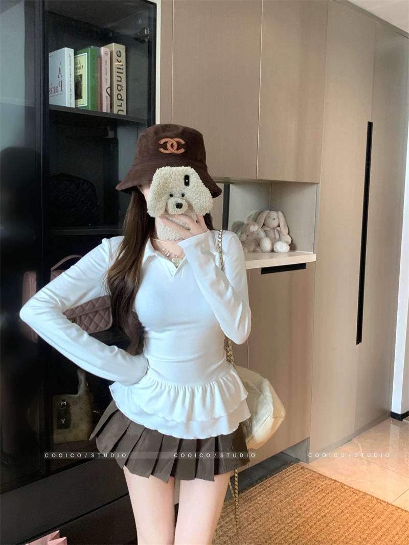 PPHOME white polo collar ruffled long sleeve T-shirt