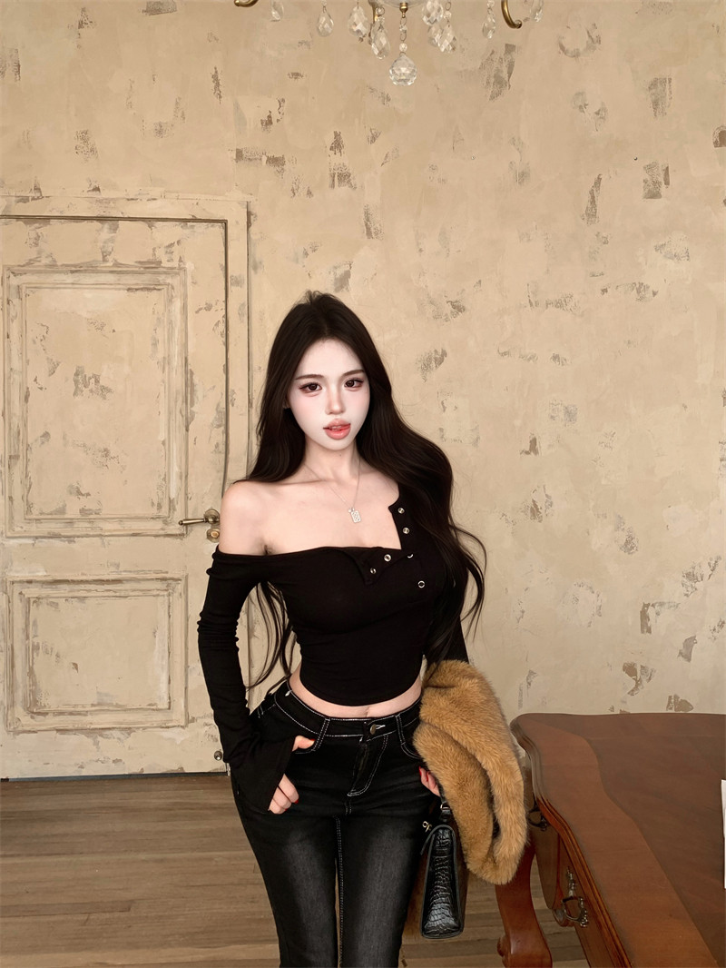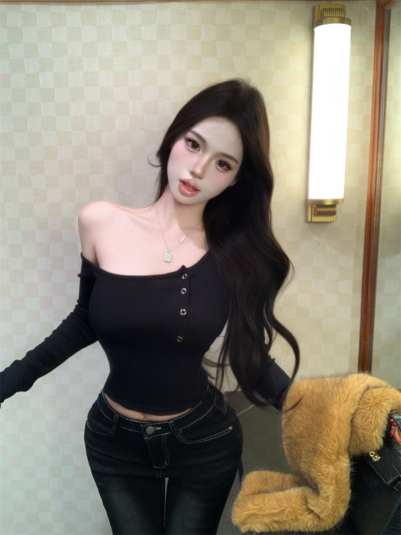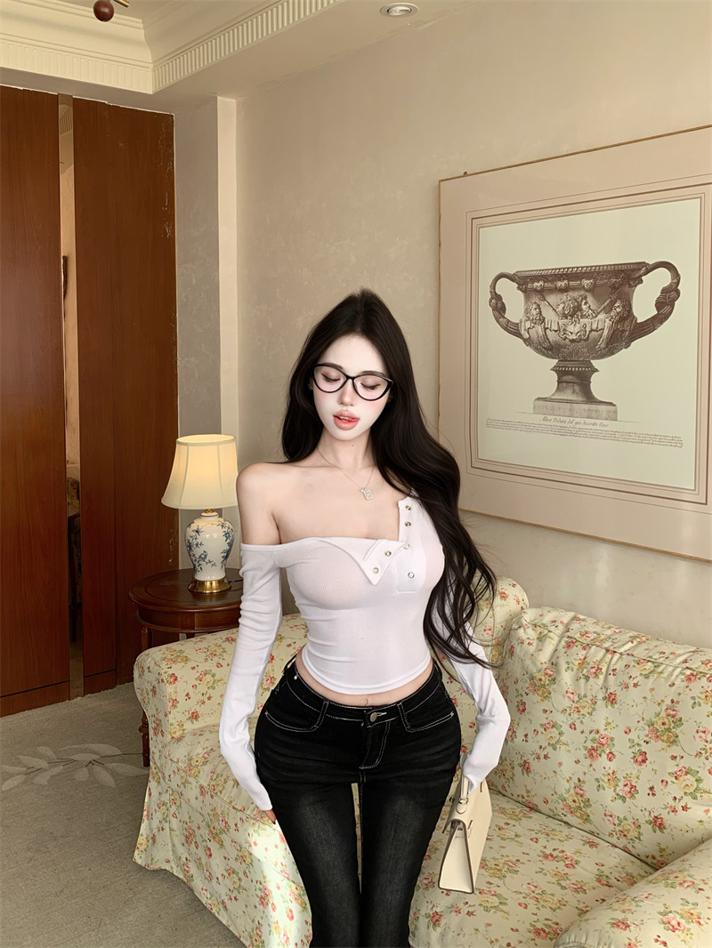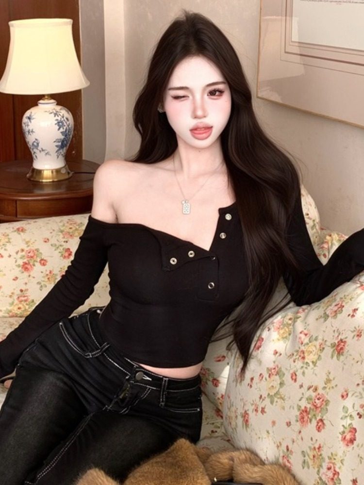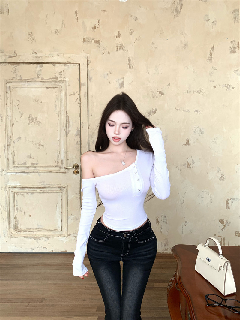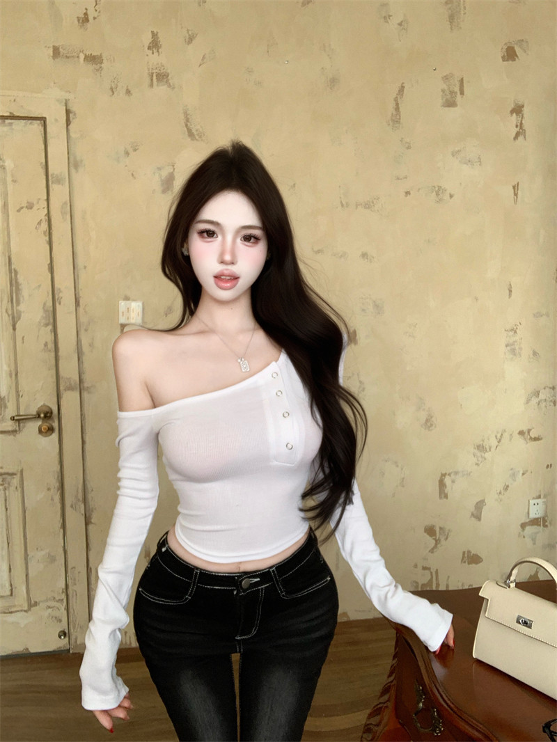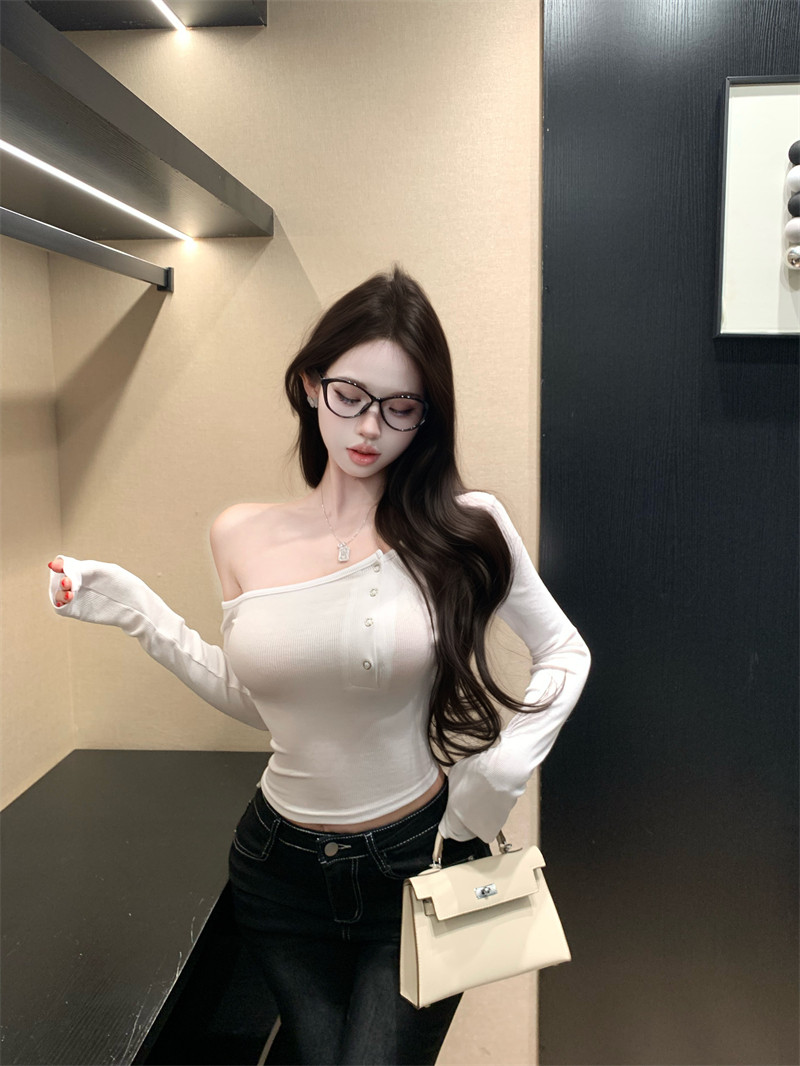 Pure desire hot girl style, sexy slanted shoulder, single-breasted design, long-sleeved T-shirt