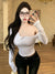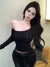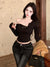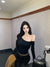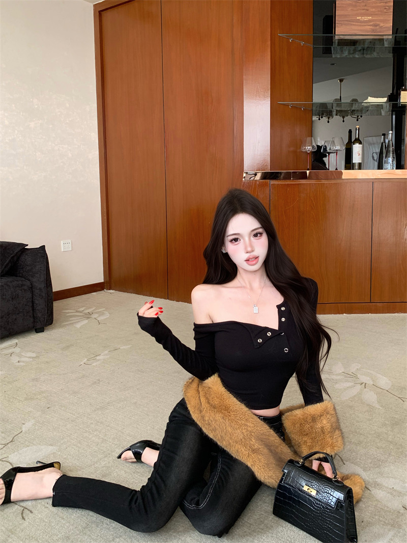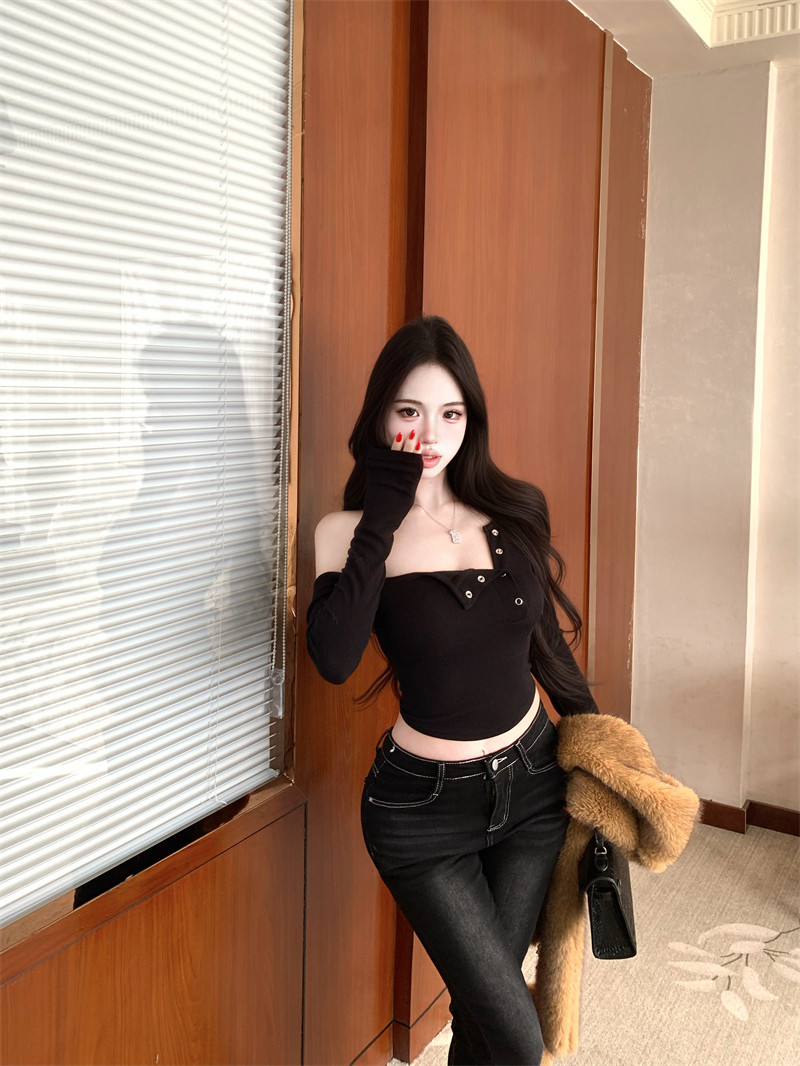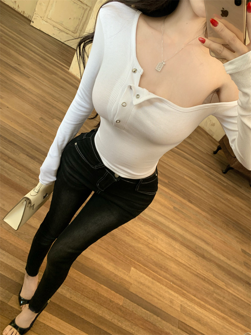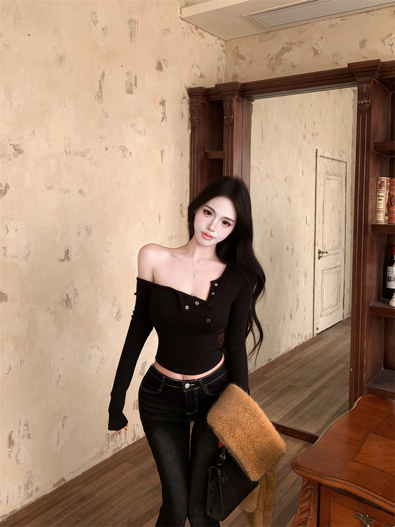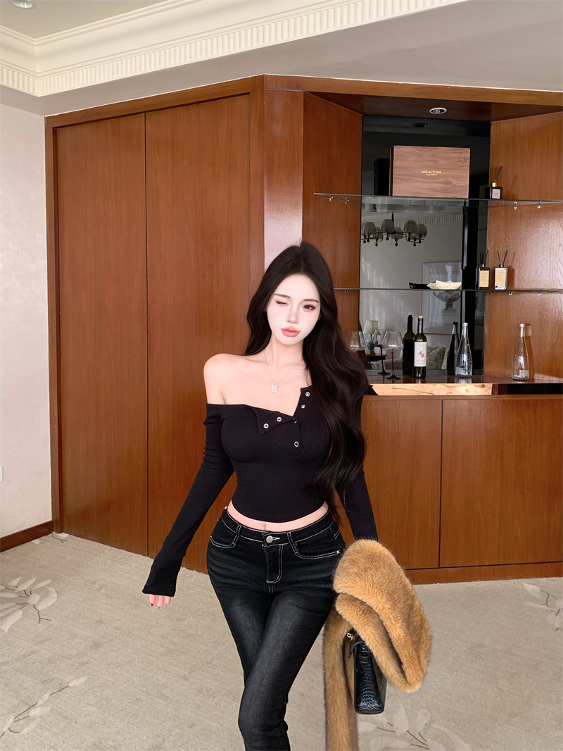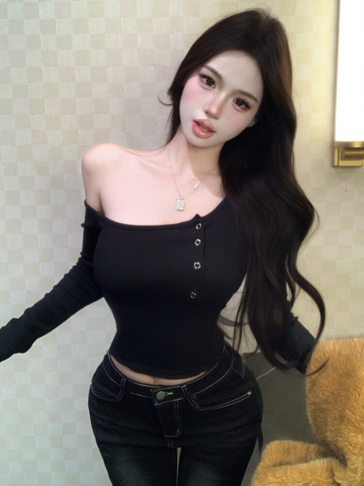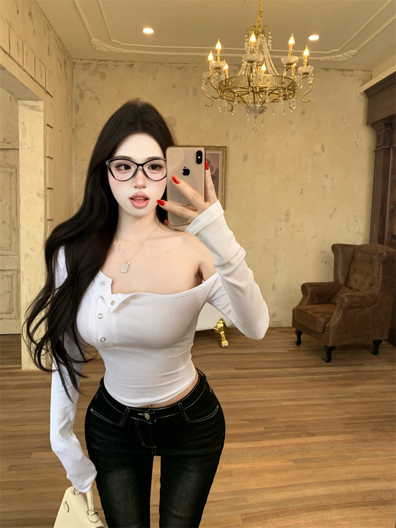 Pure desire hot girl style, sexy slanted shoulder, single-breasted design, long-sleeved T-shirt