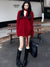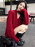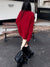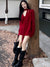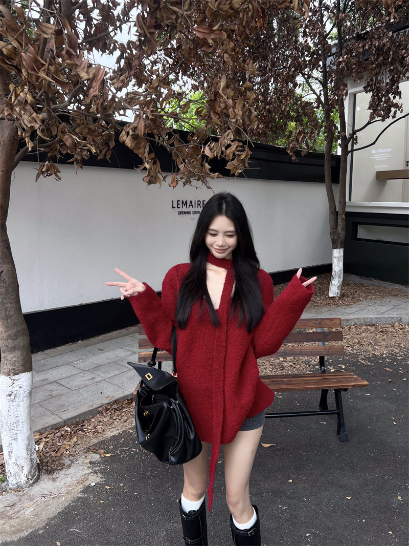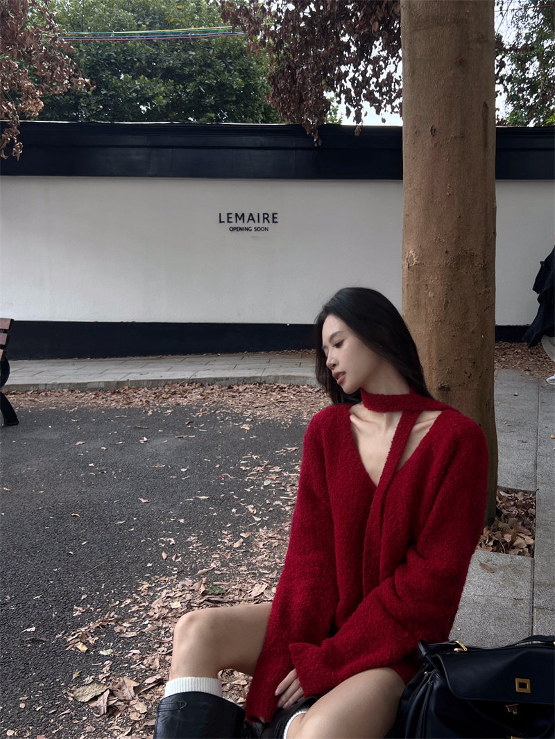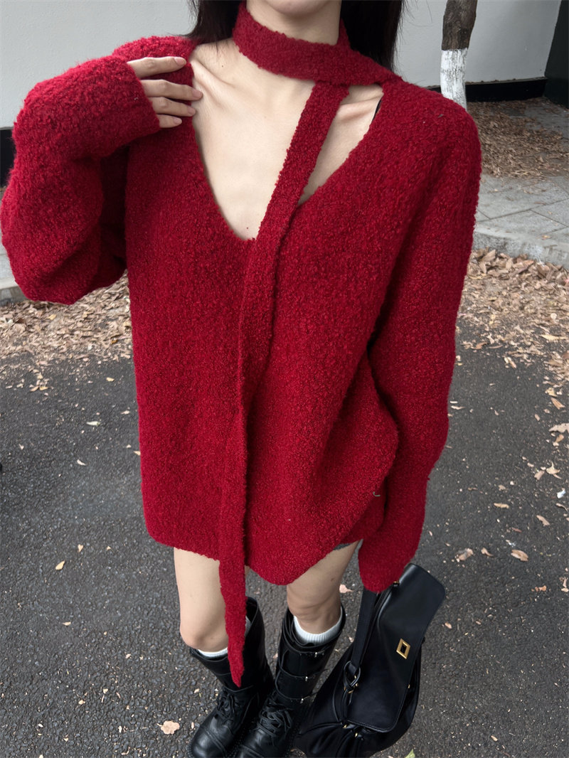 With a scarf-tie-red vibe, a V-neck sweater, a soft waxy knit sweater
