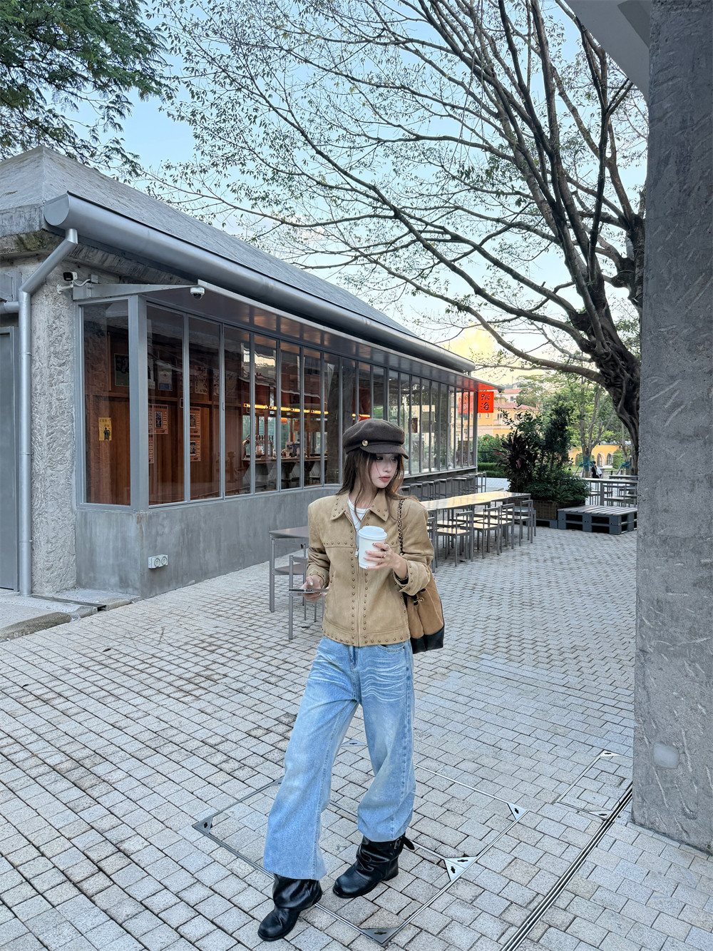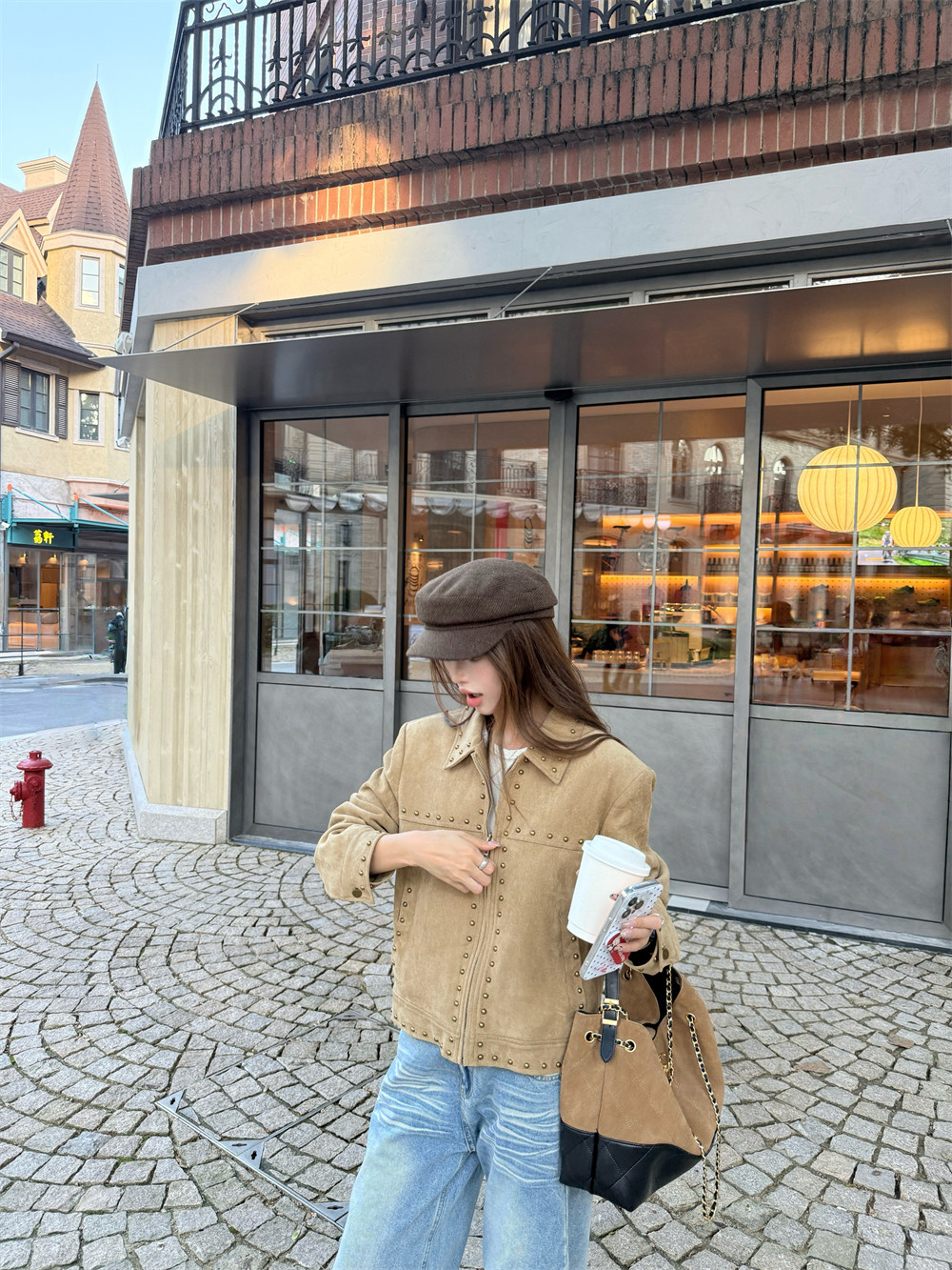 High-end retro deerskin velvet studded jacket women's winter loose khaki long-sleevedcropped biker jacket
