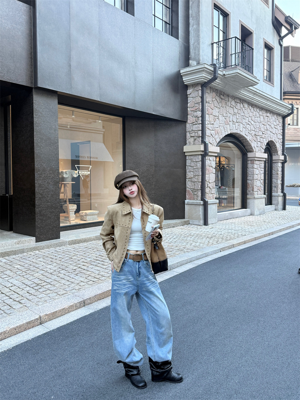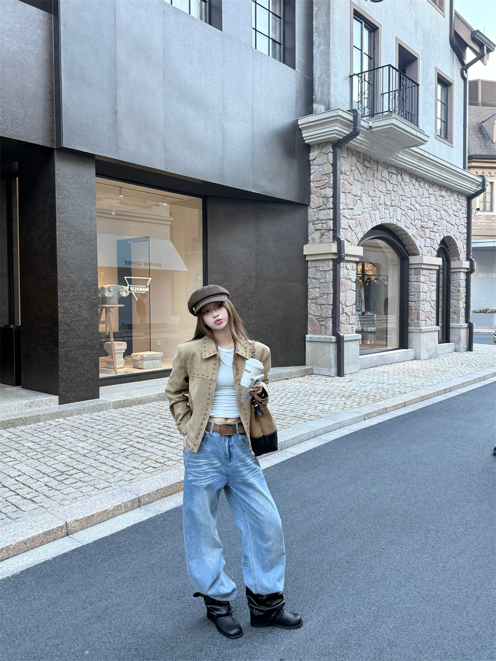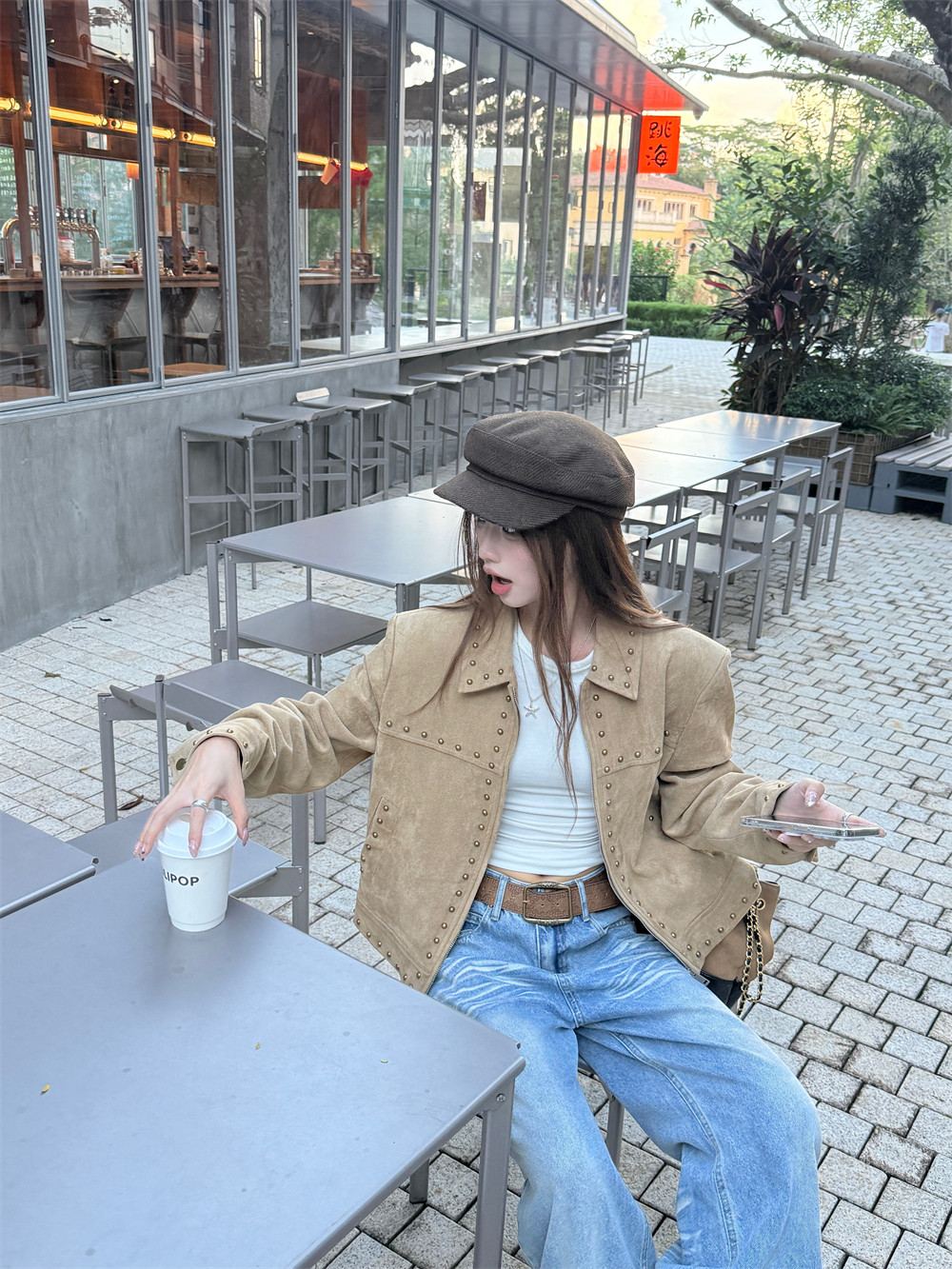 High-end retro deerskin velvet studded jacket women's winter loose khaki long-sleeved cropped biker jacket