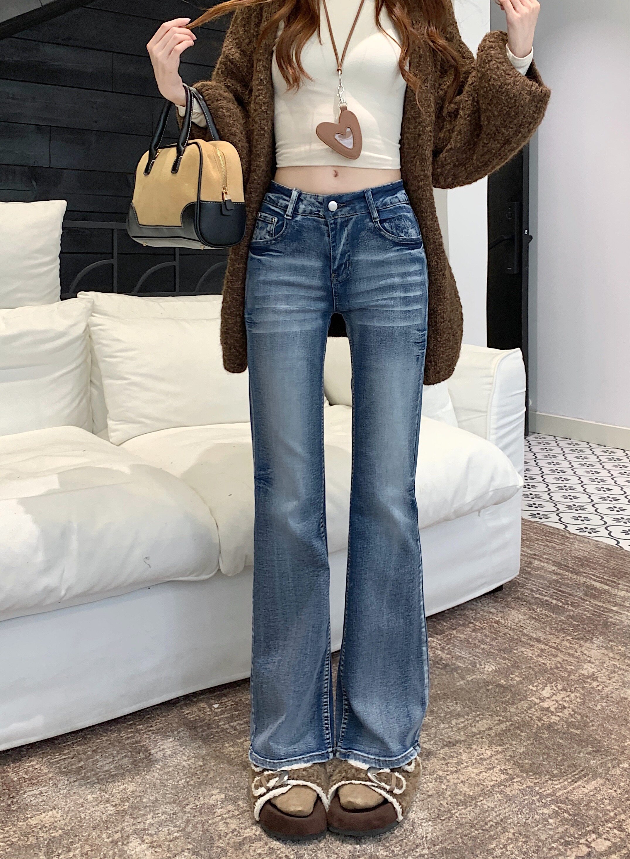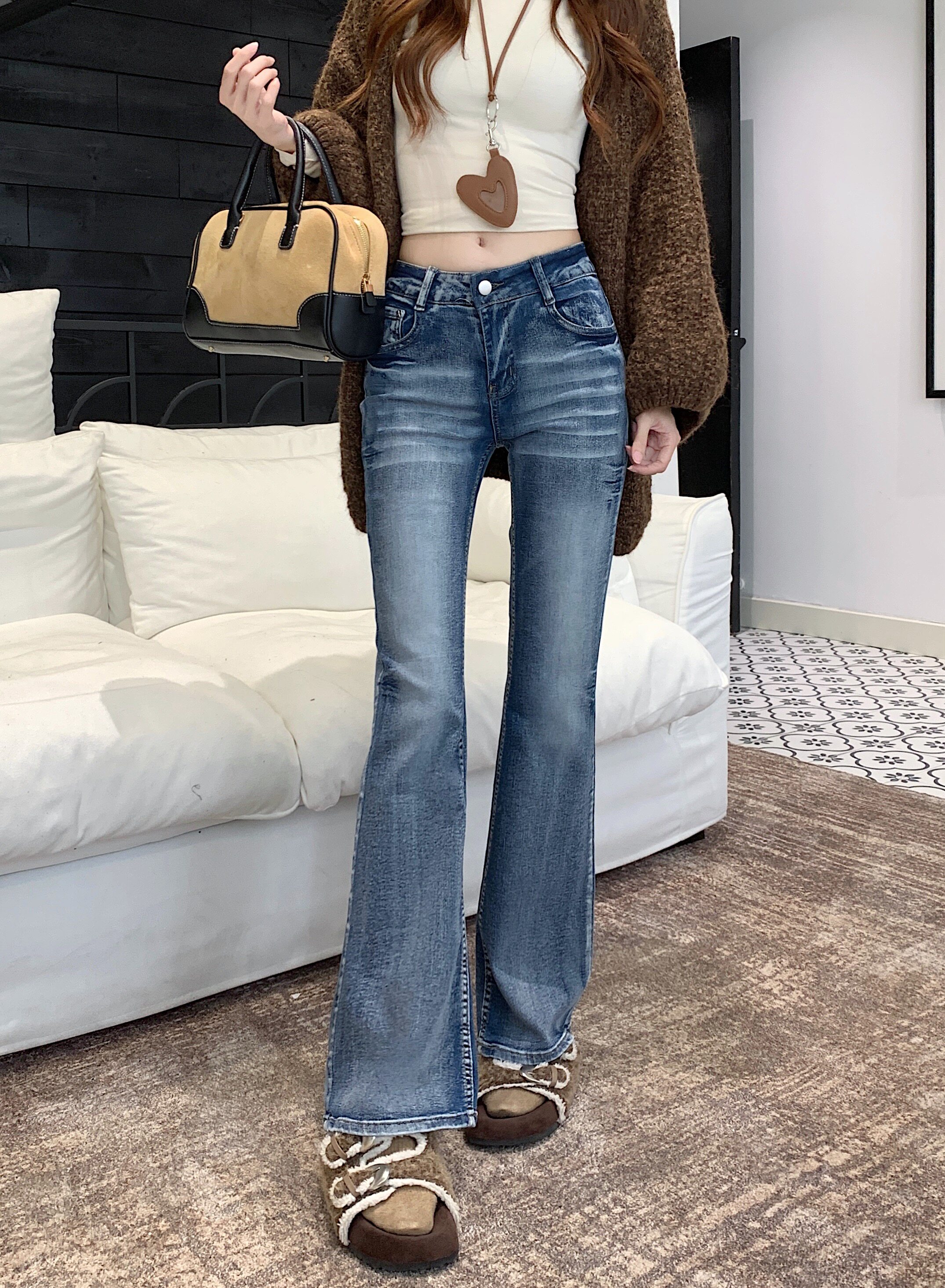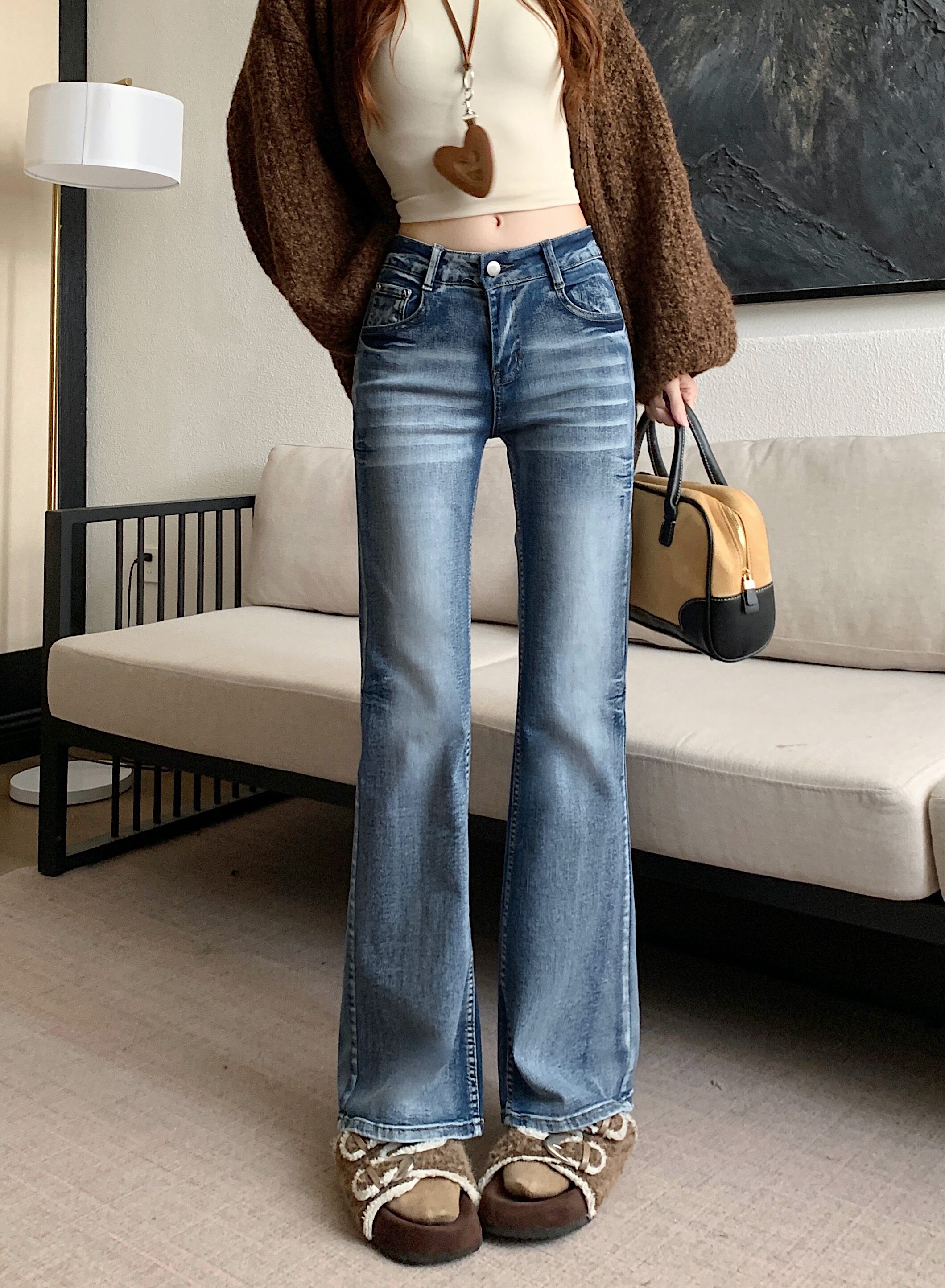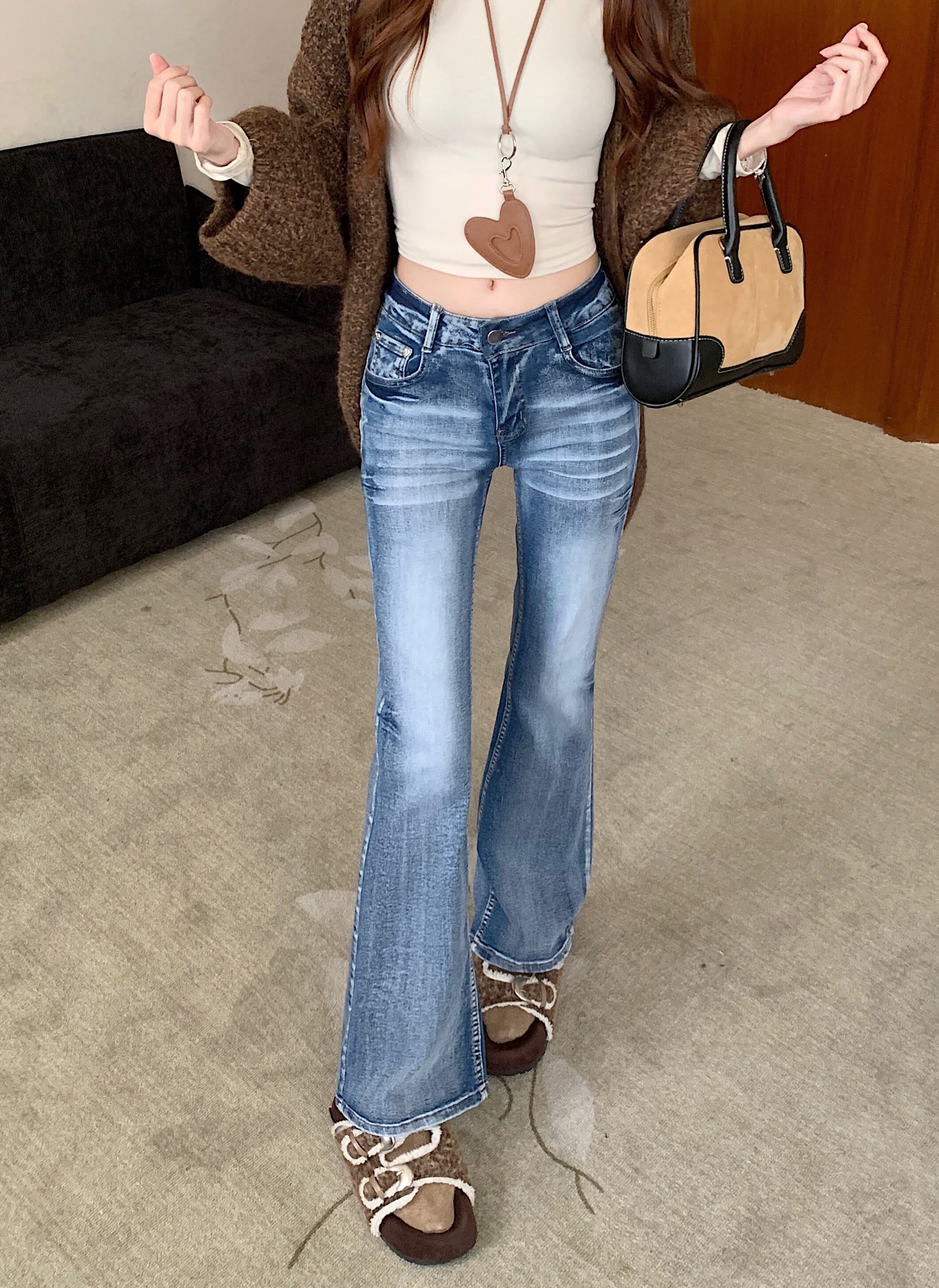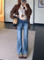 Washed distressed low-rise jeans women's winter vintage micro-flared pants narrow slimming straight-leg pants cropped trousers