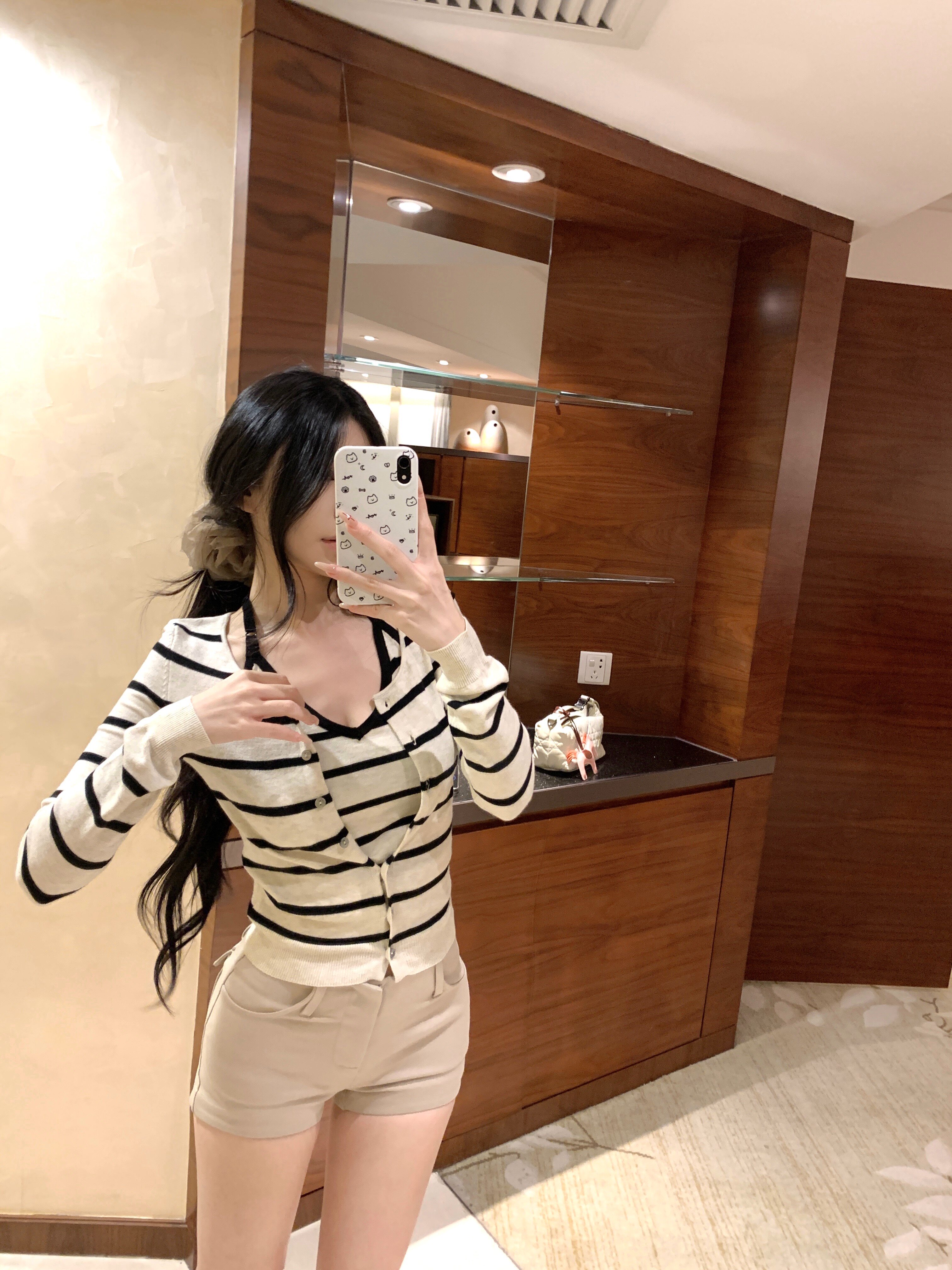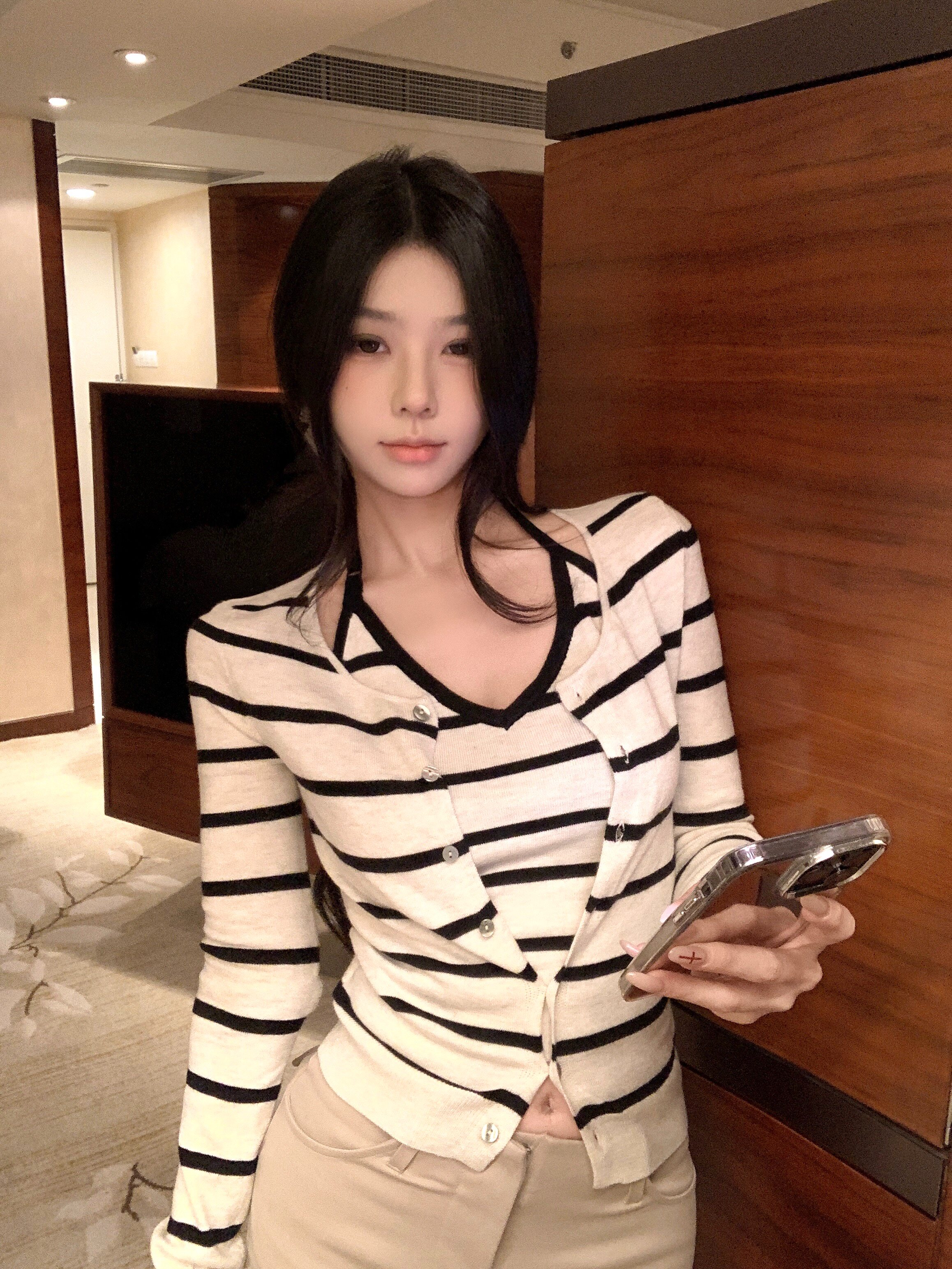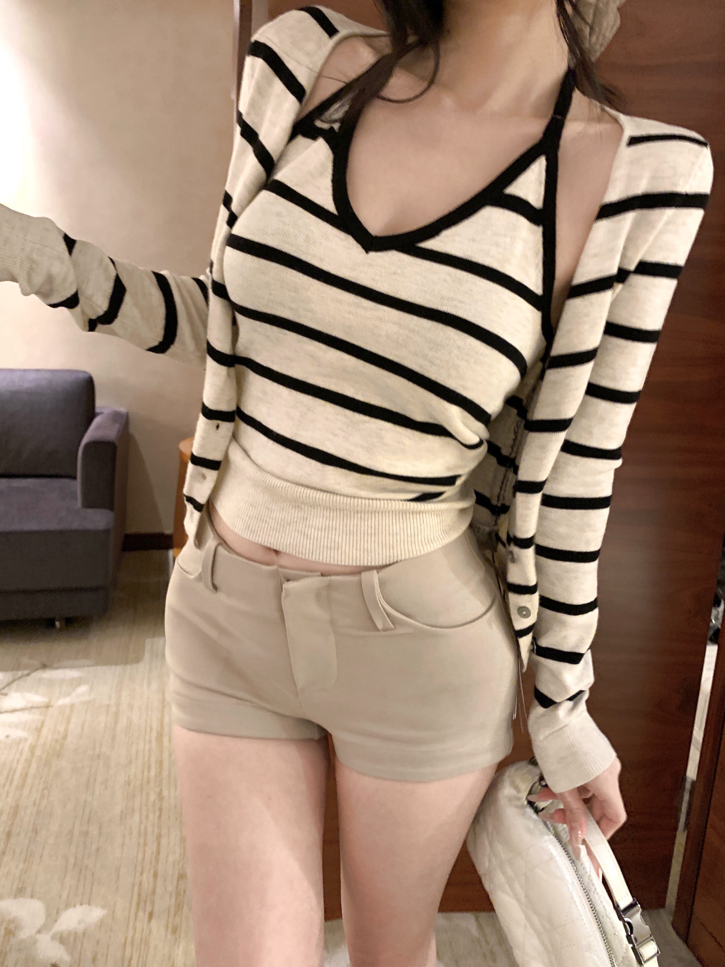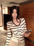 Contrasting striped long-sleeved knitted cardigan neck hanging vest two-piece set