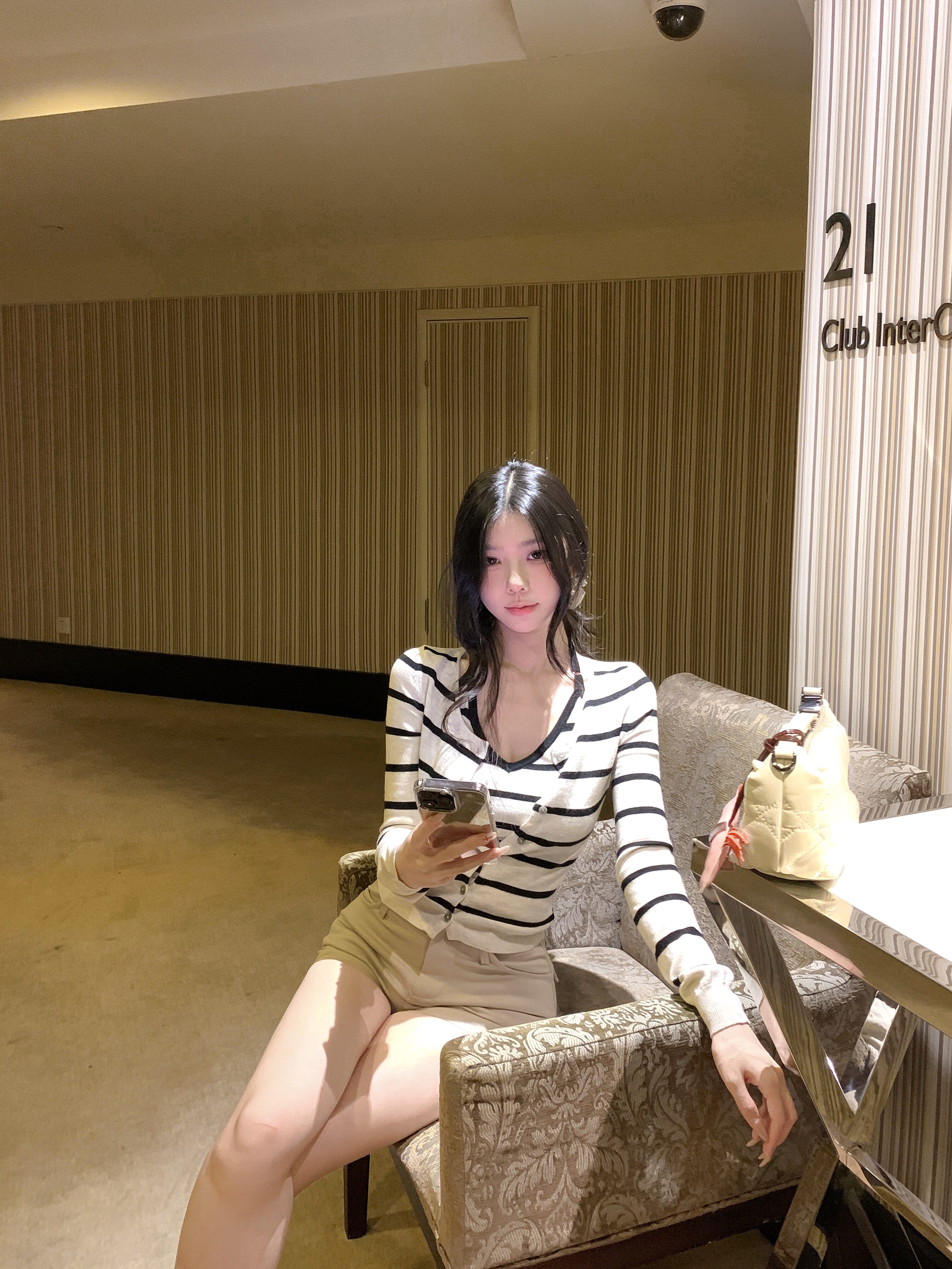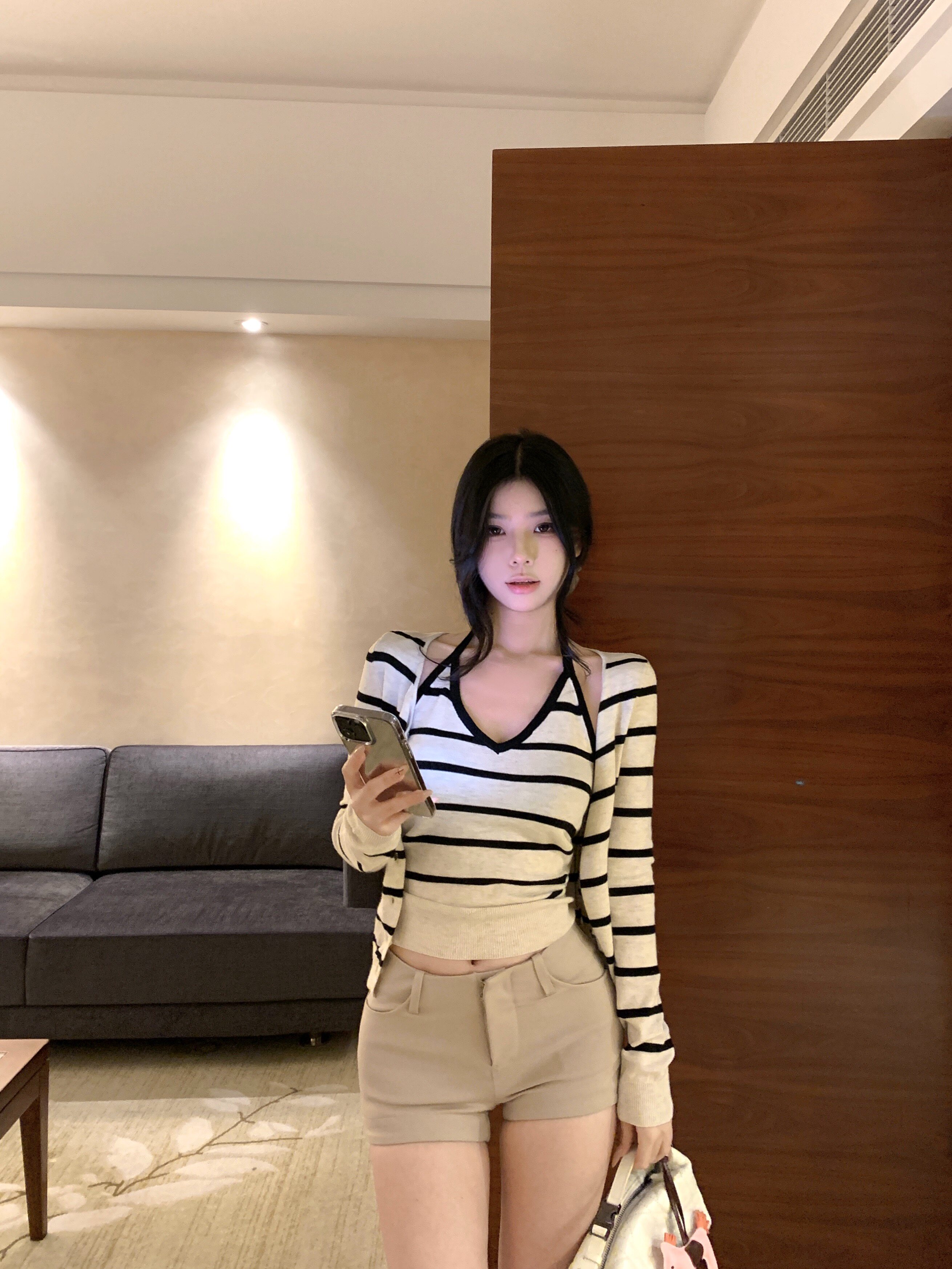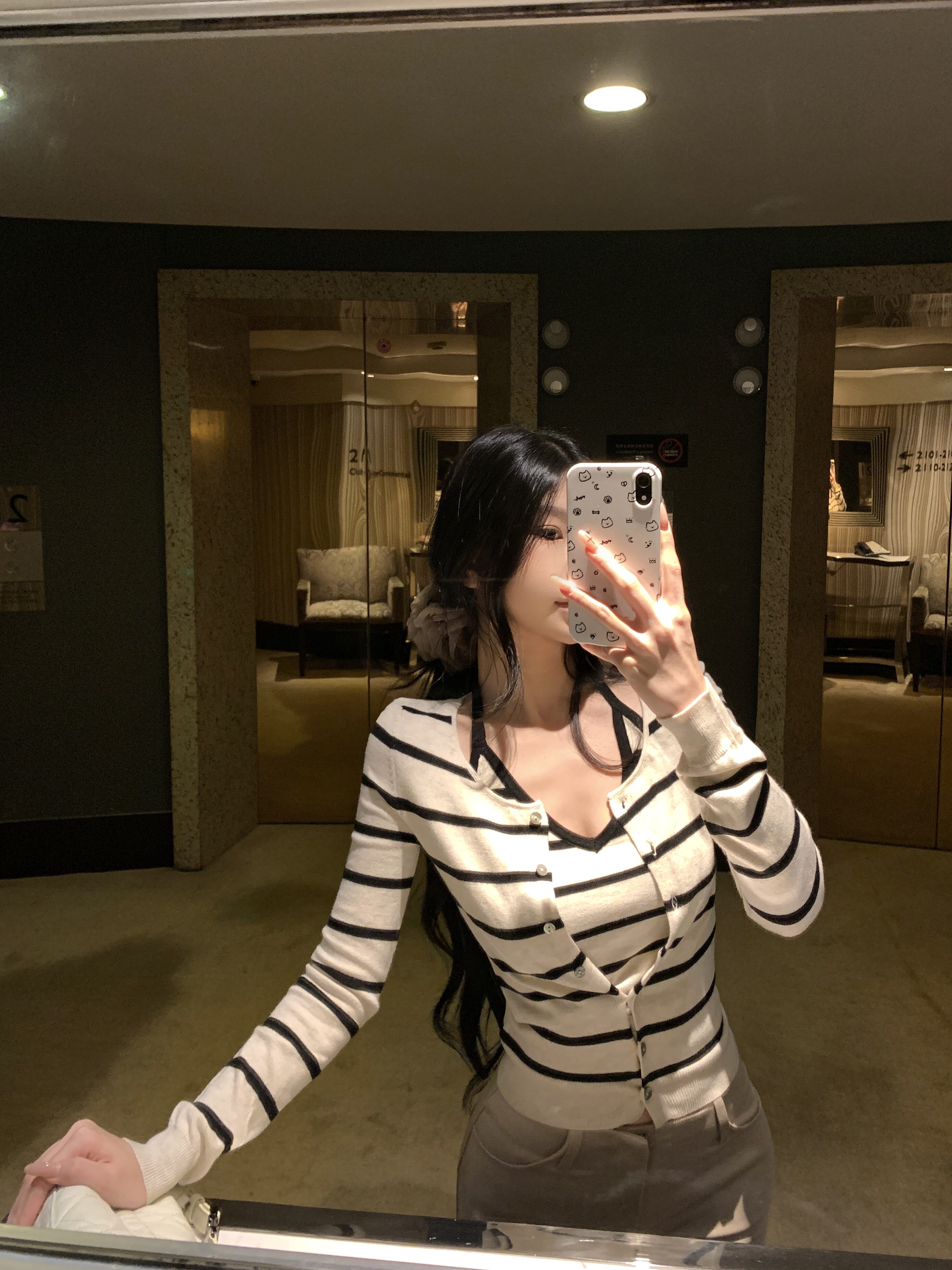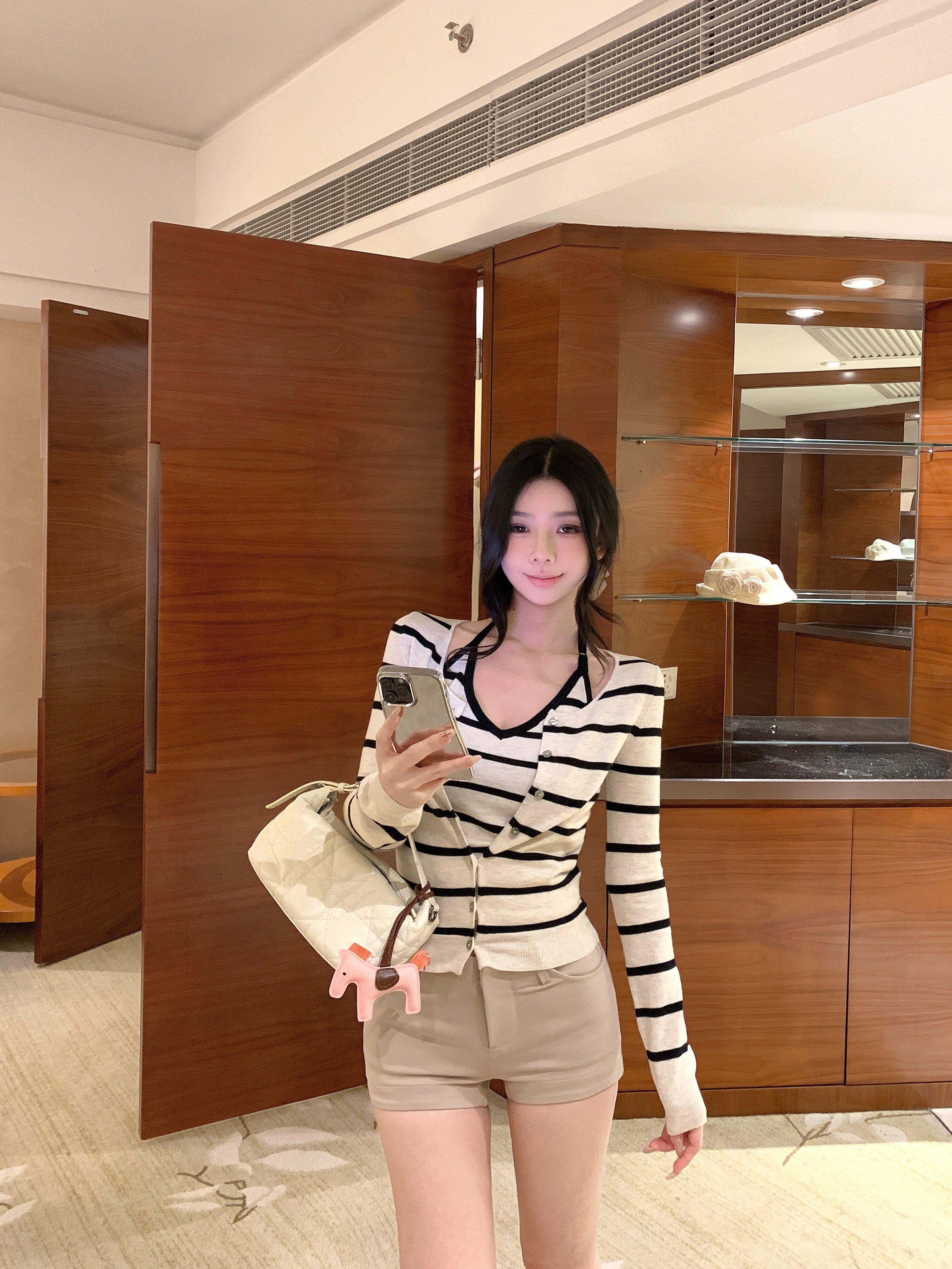 Contrasting striped long-sleeved knitted cardigan neck hanging vest two-piece set