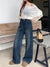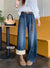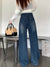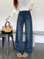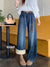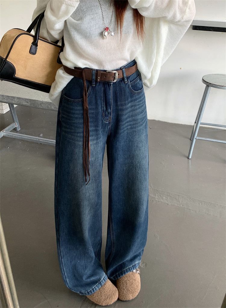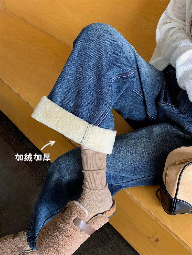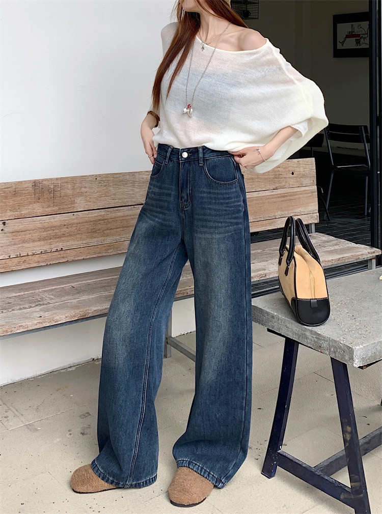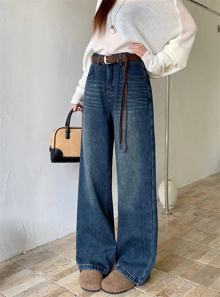 PPHOME Vintage Blue Washed Wide-Leg Jeans Women's Autumn and Winter Retro Fleece Thickened High Waist Slimming Straight Pants