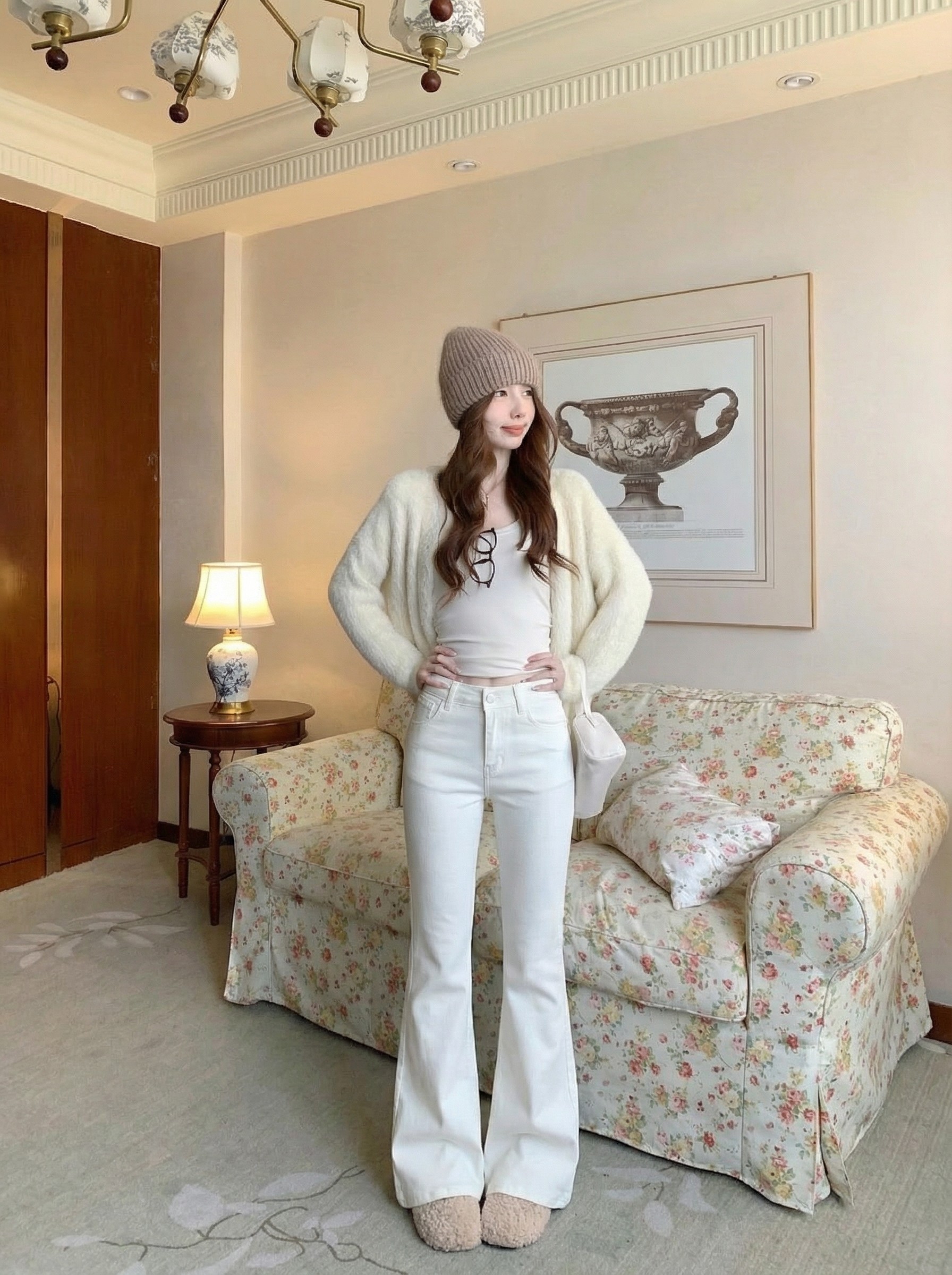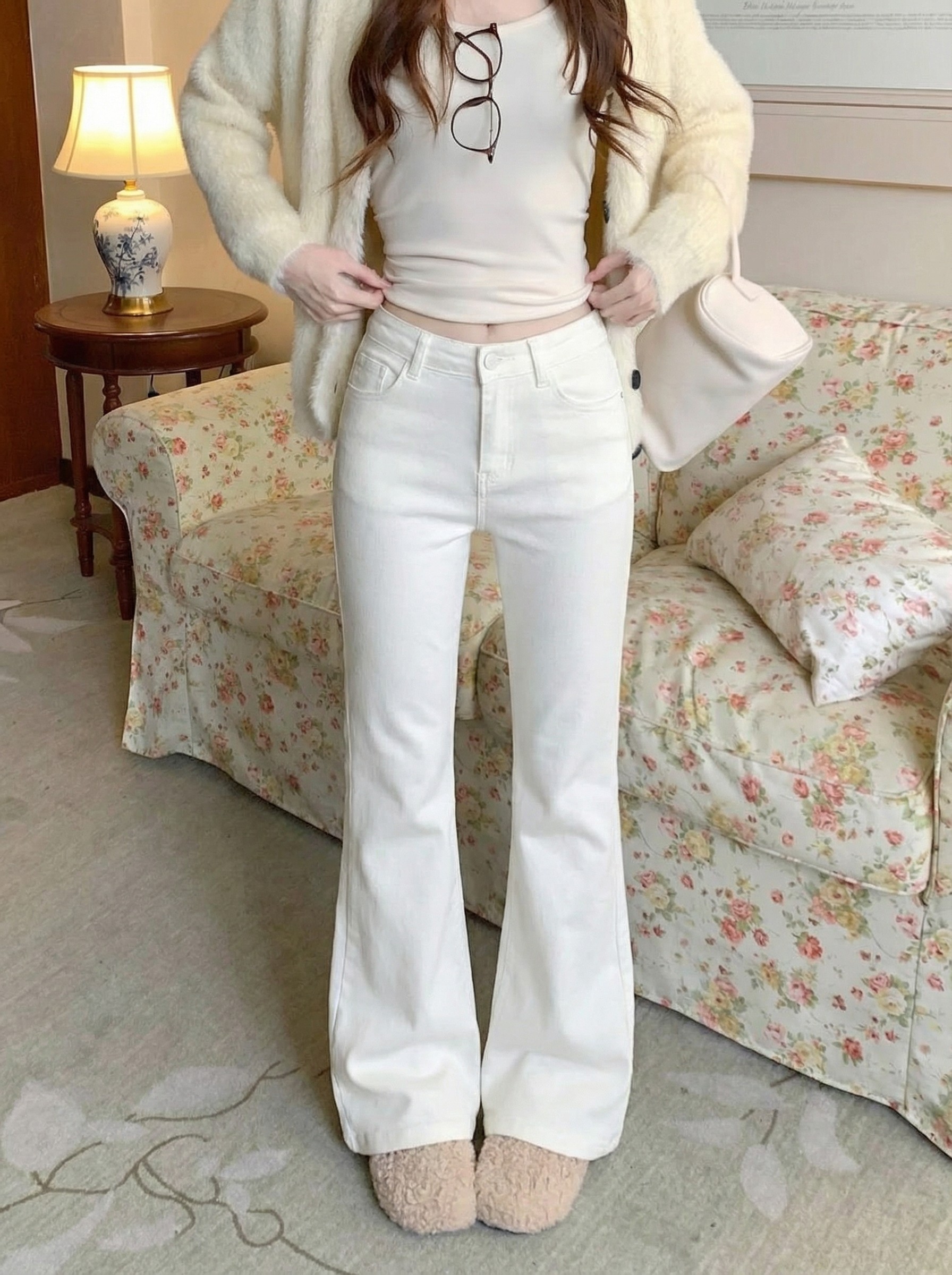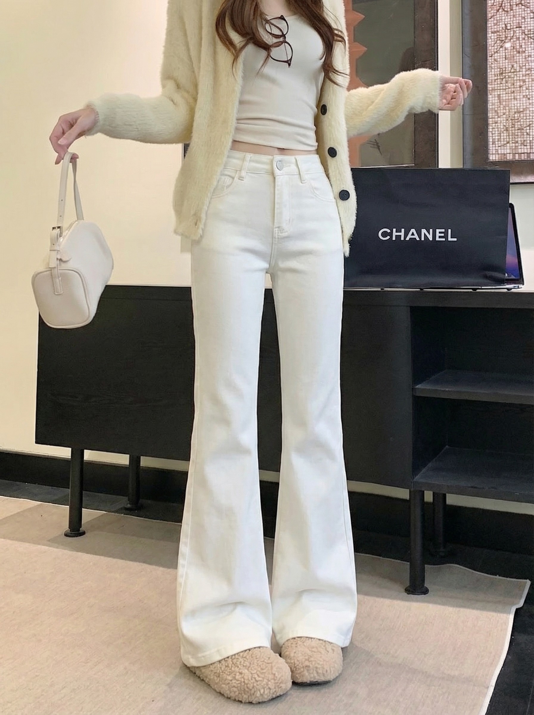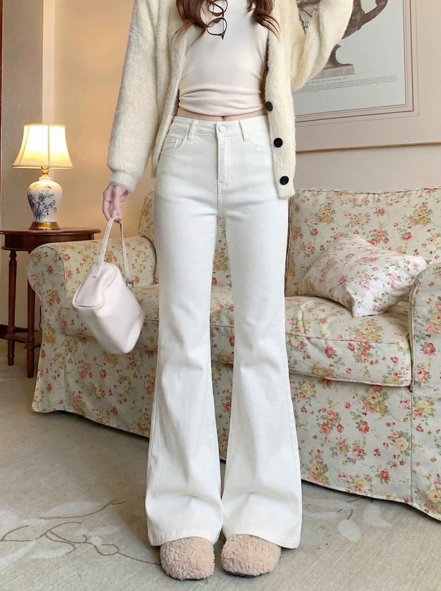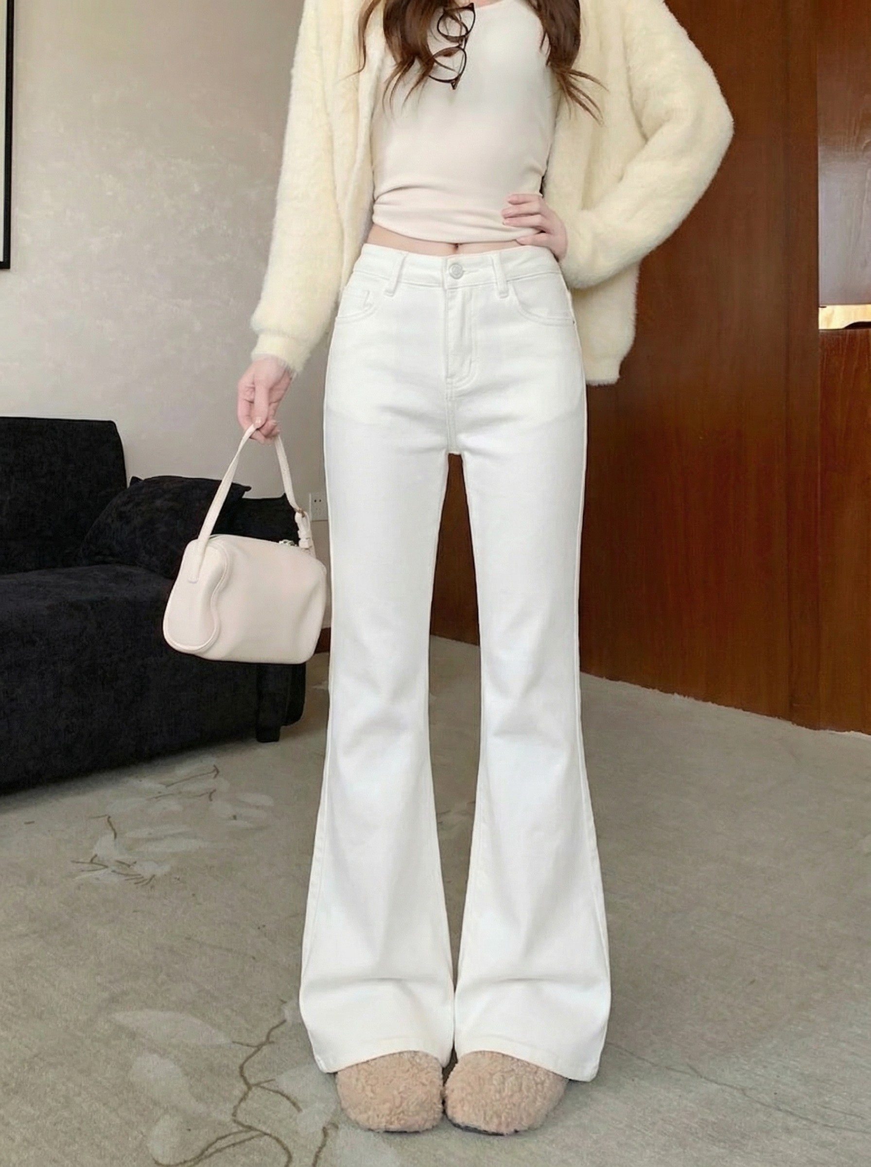 Solid color strawberry flocked thickened low-rise slimming micro-flared pants