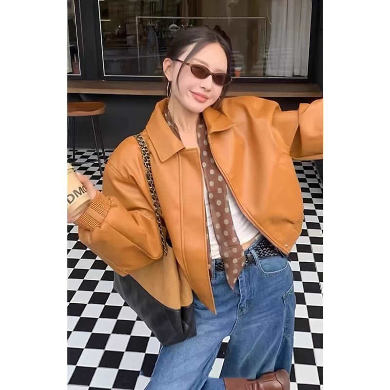 European fashionable cool lapel zipper short leather jacket PU leather jacket
