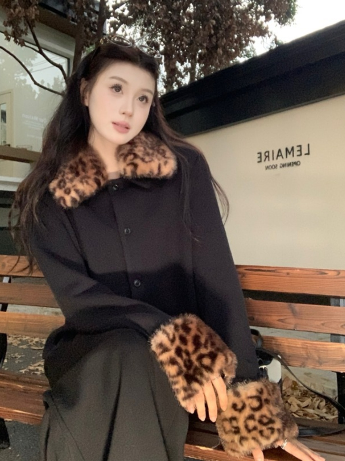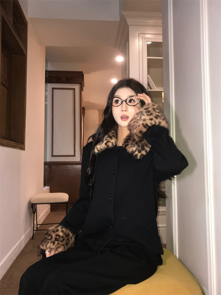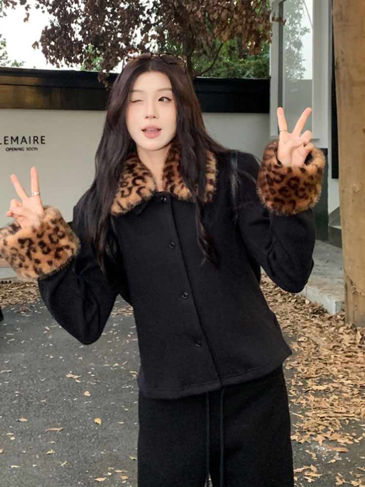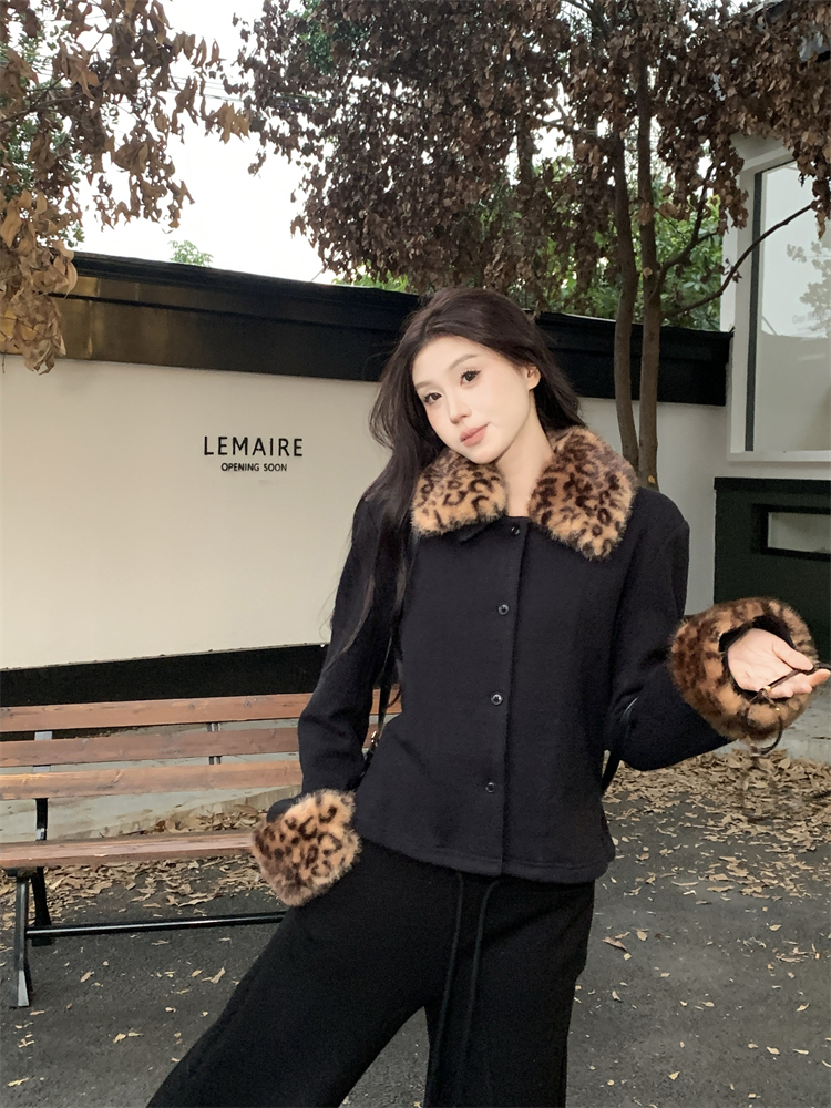 Hepburn style high-end fashion leopard print fur collar thickened short jacket