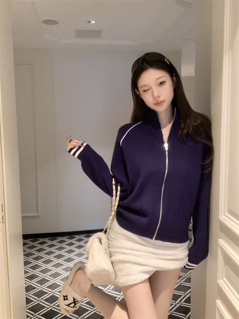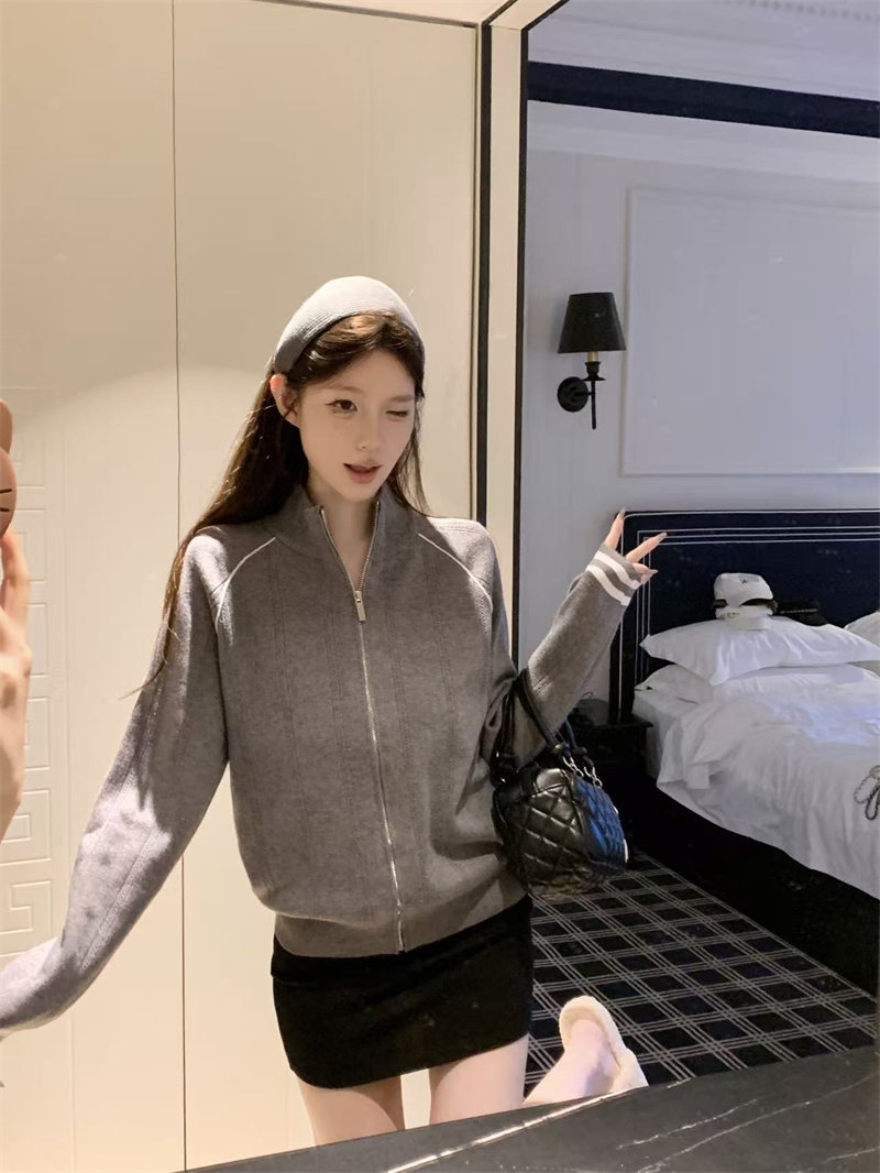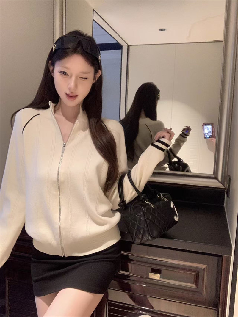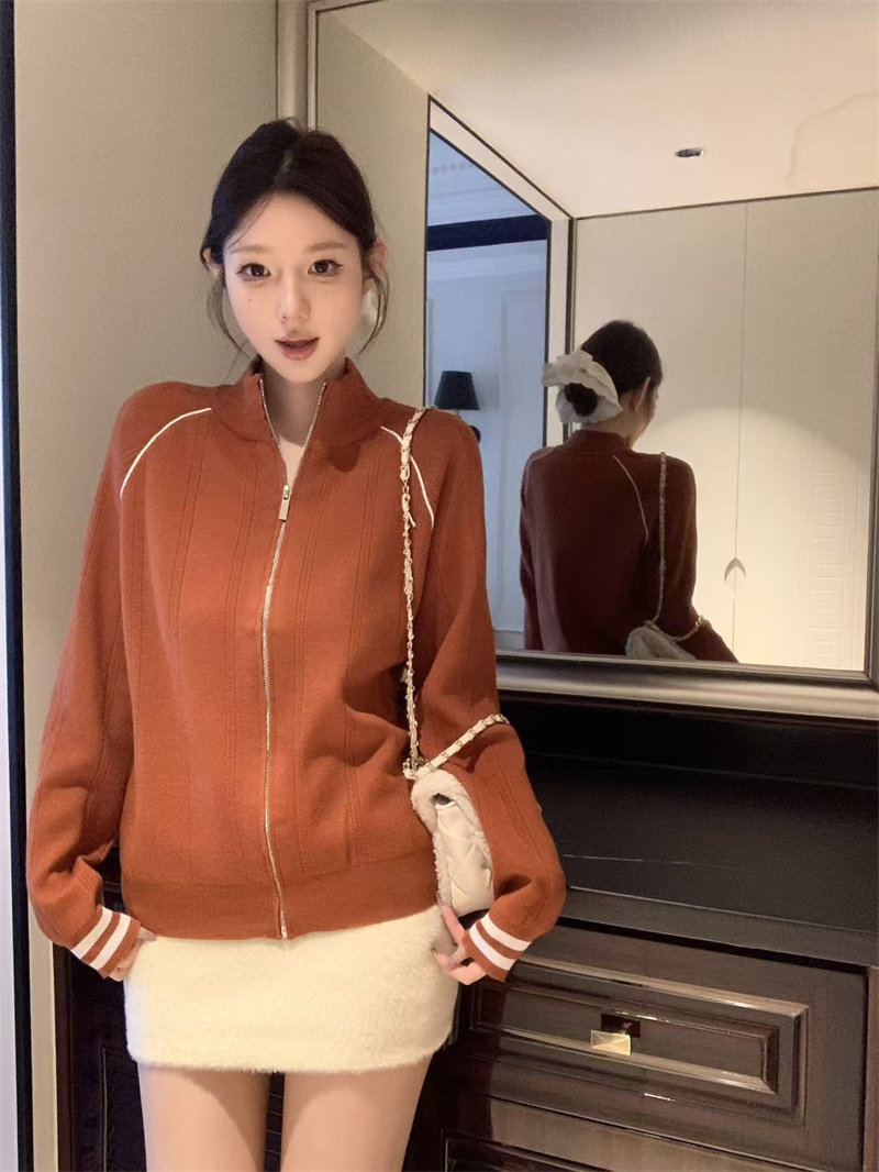 Retro contrast zipper knitted stand-up collar jacket
