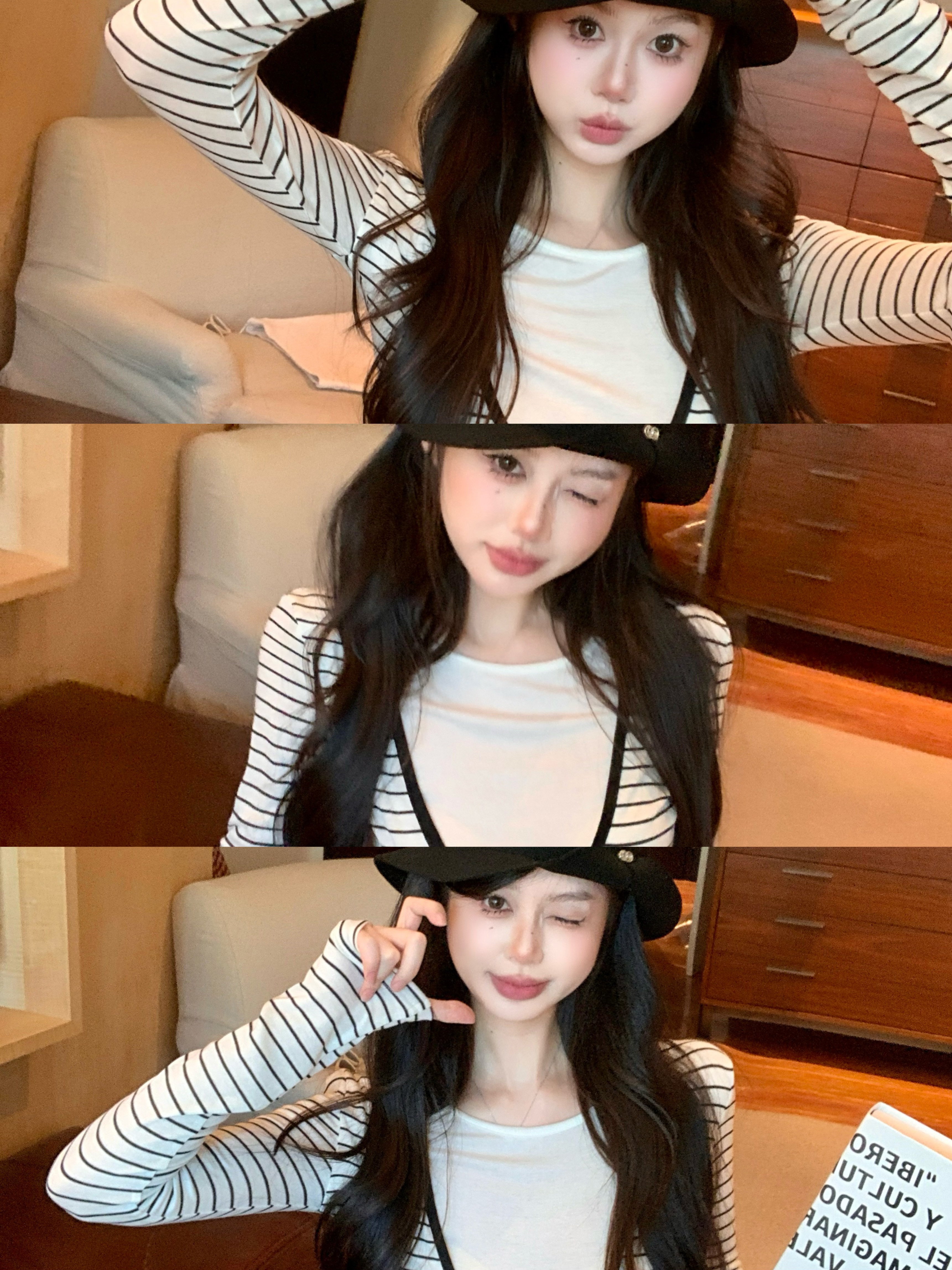 Black strawberry stripe contrast fake two-piece T-shirt