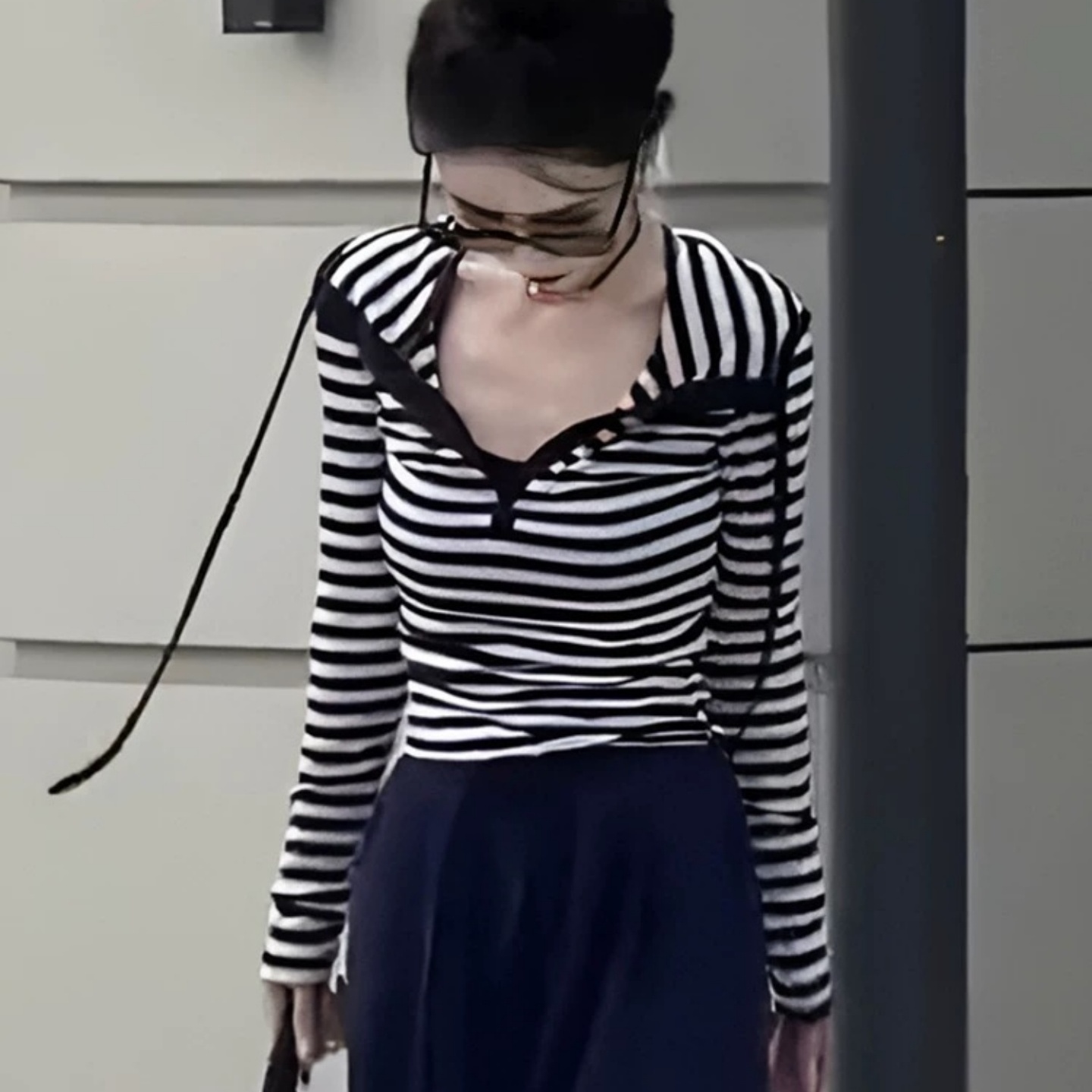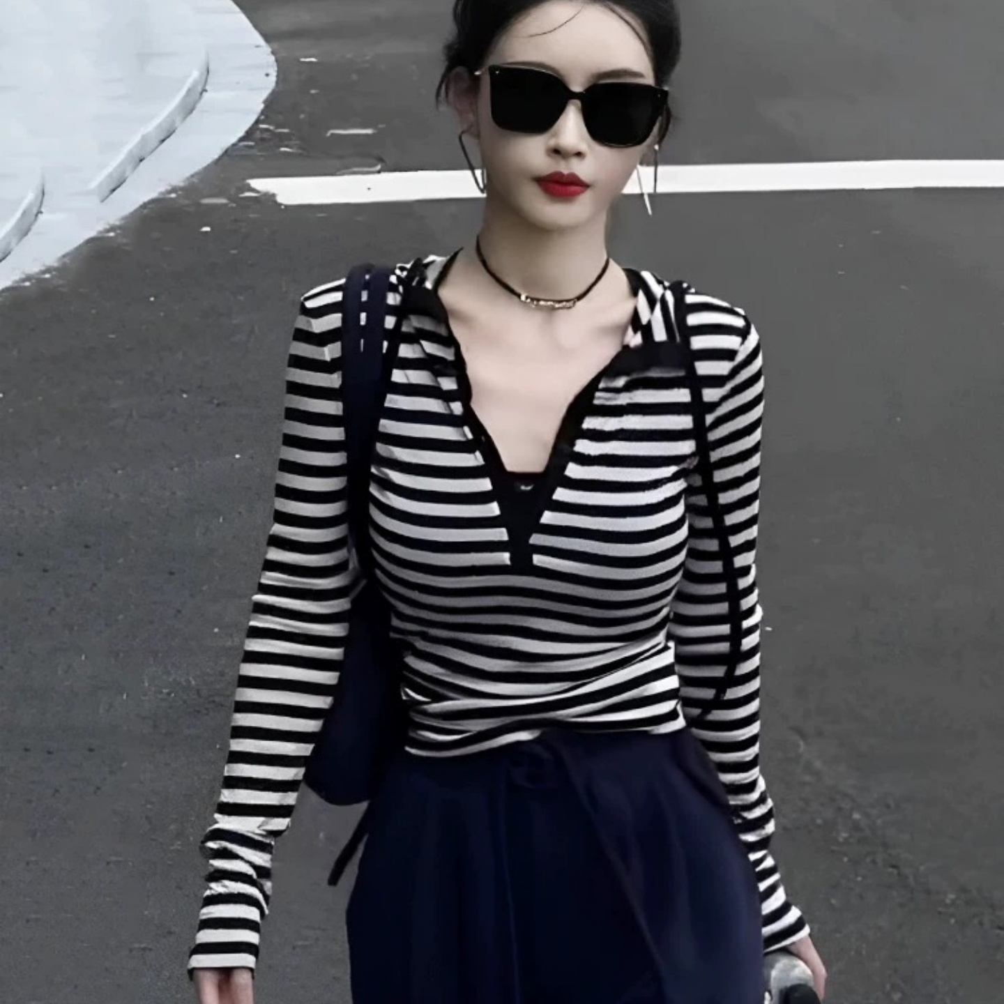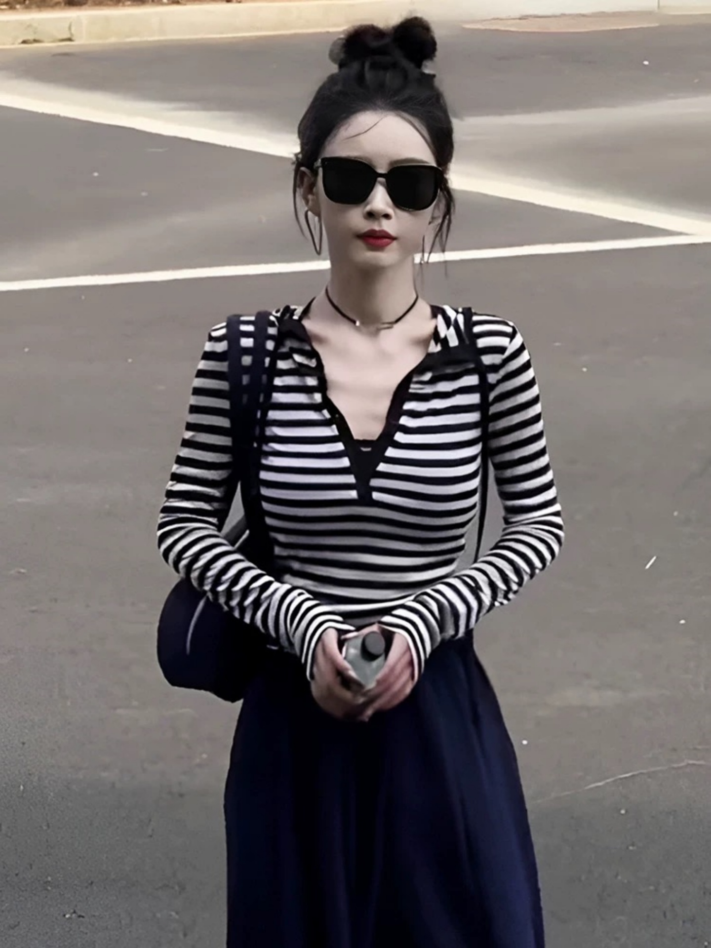 Early autumn hooded V-neck contrasting striped long-sleeved T-shirt