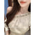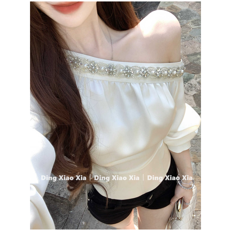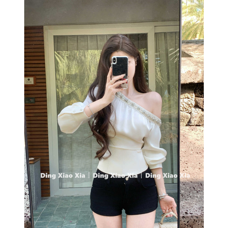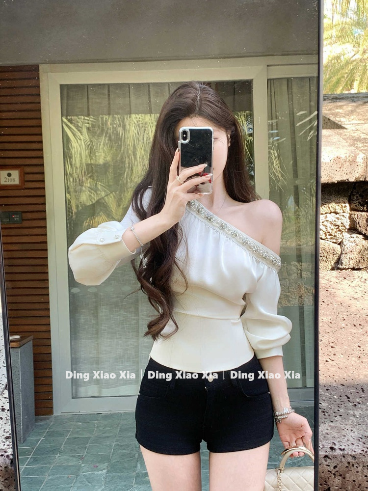 French diamond-encrusted slanted shoulders long-sleeved shirt