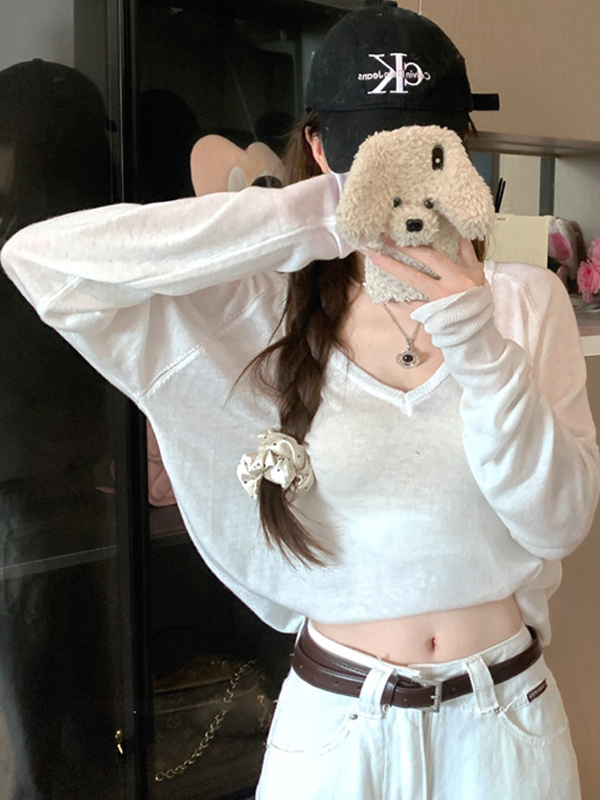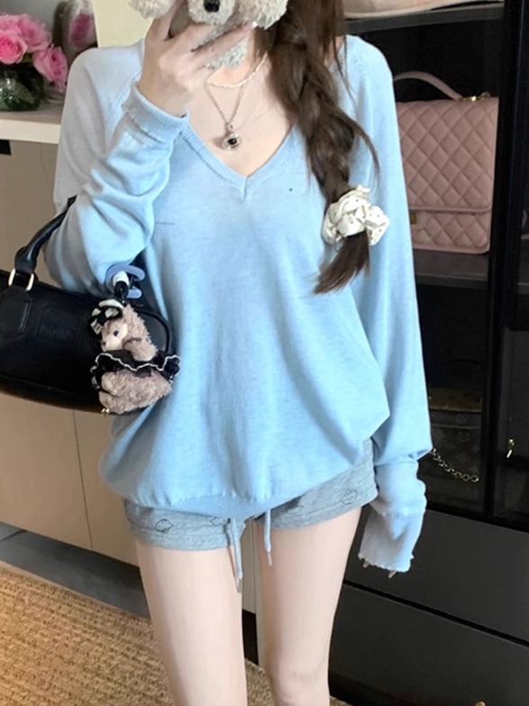 Gentle style V-neckloose knitted long-sleeved T-shirt