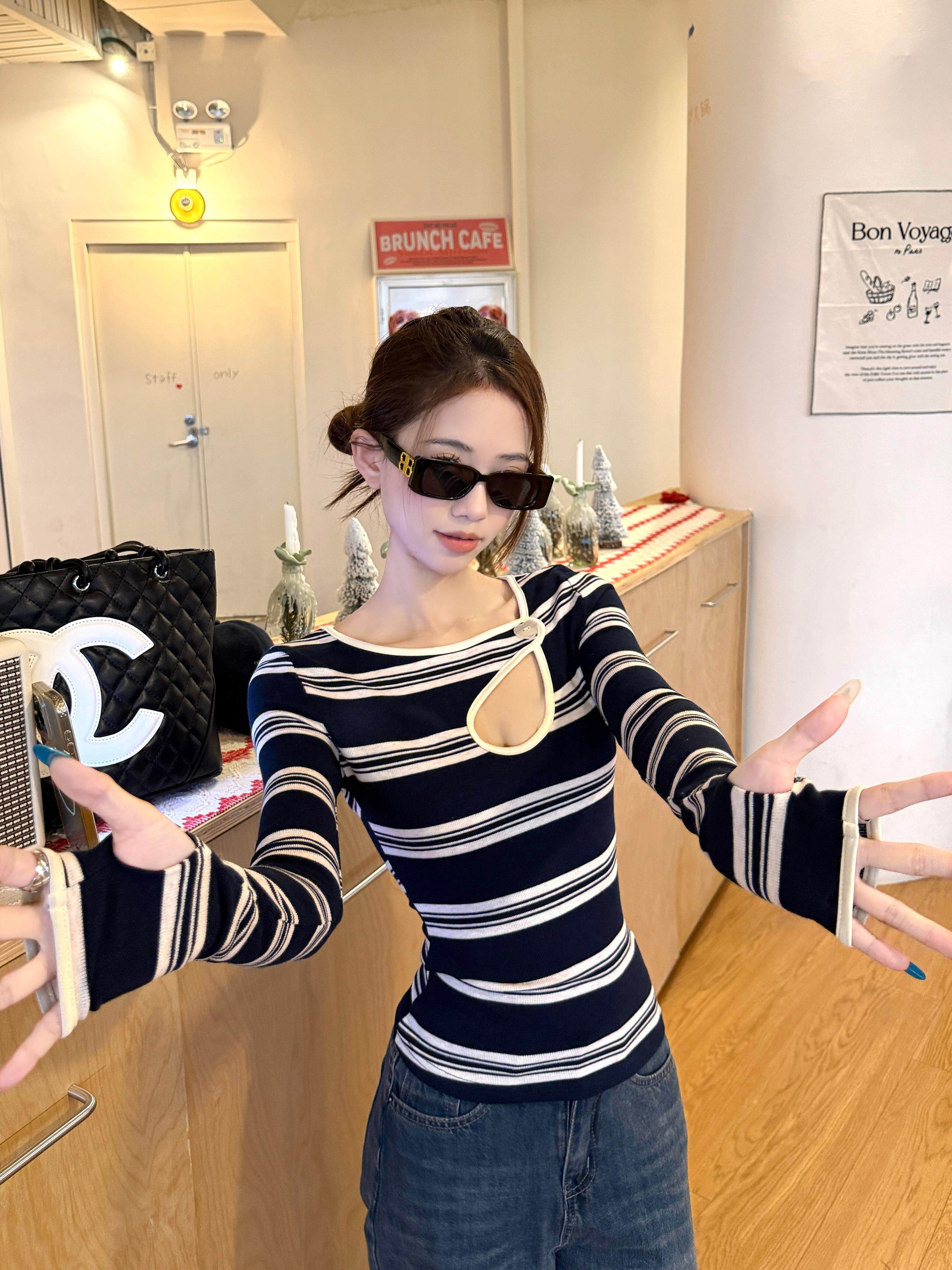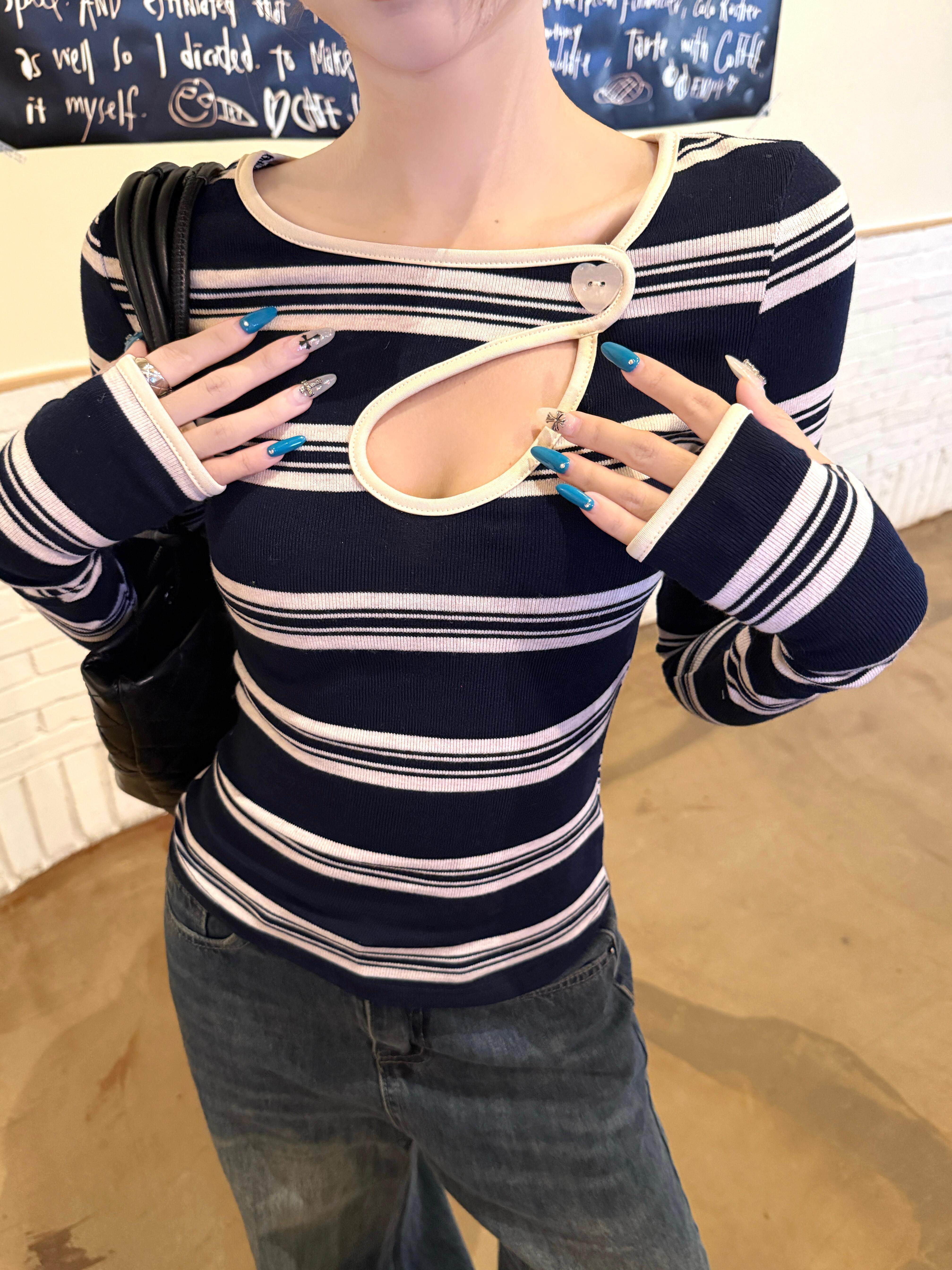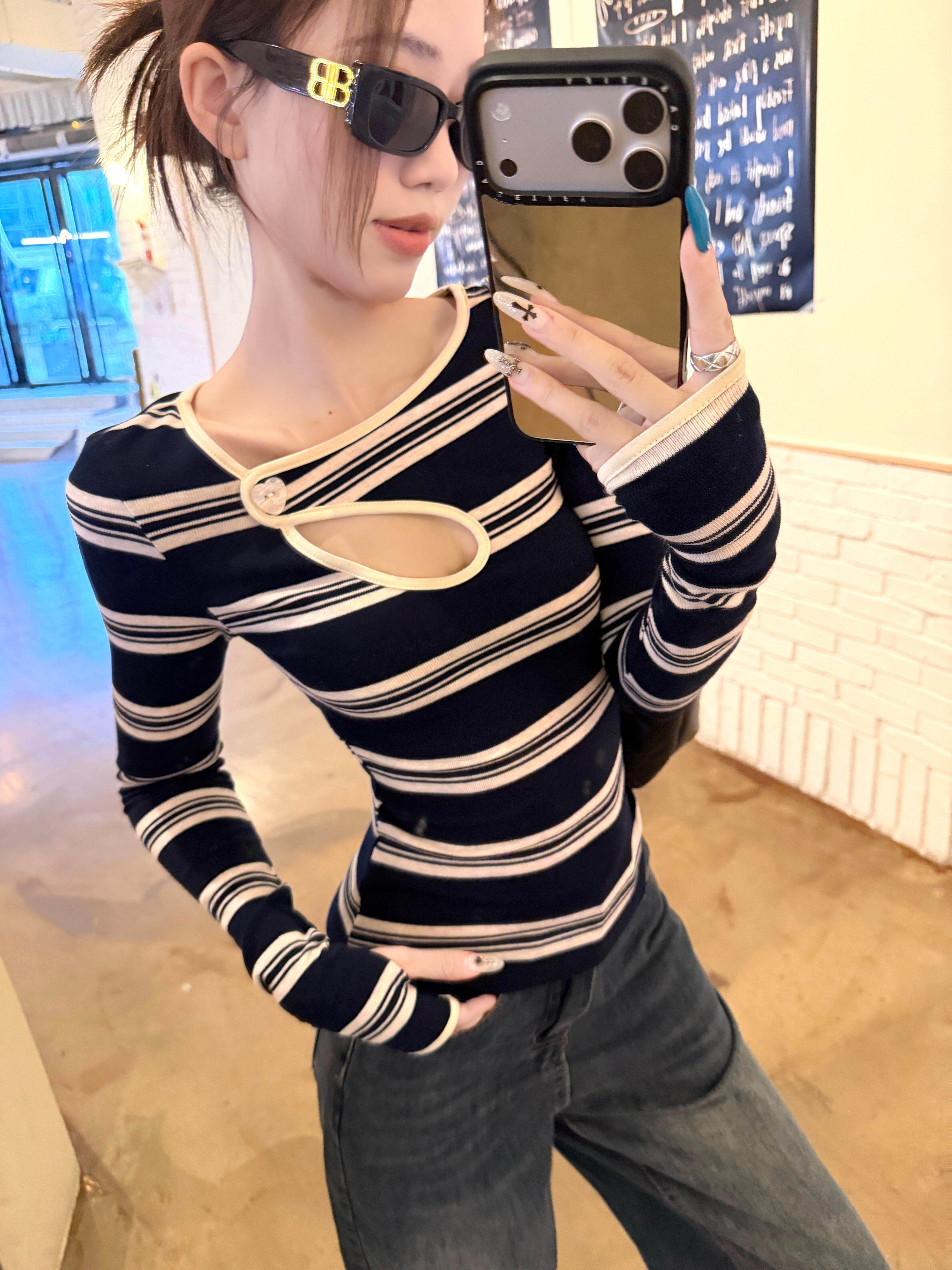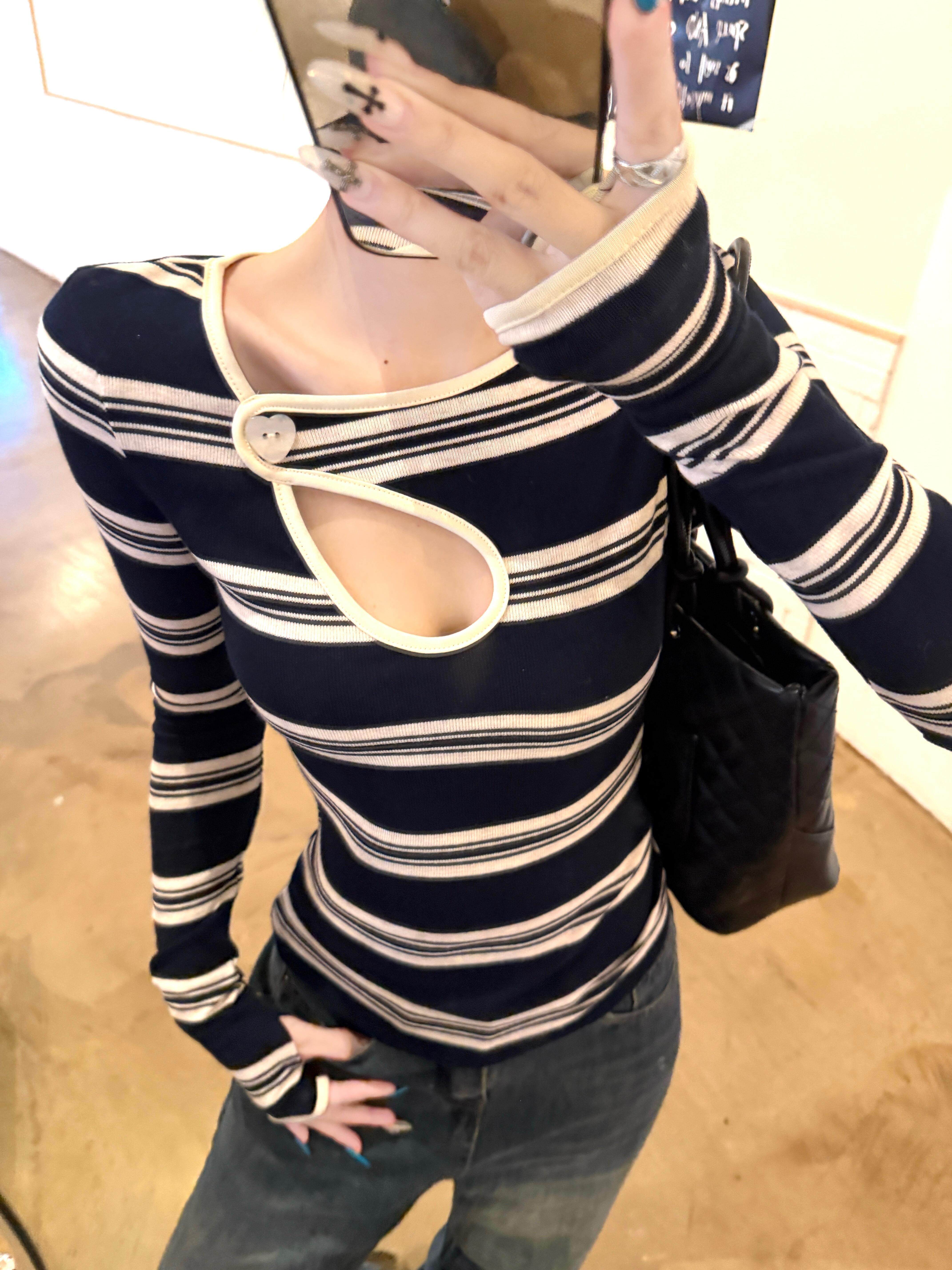 Hot girl style contrast stripe cut-out sexy long sleeve T-shirt