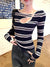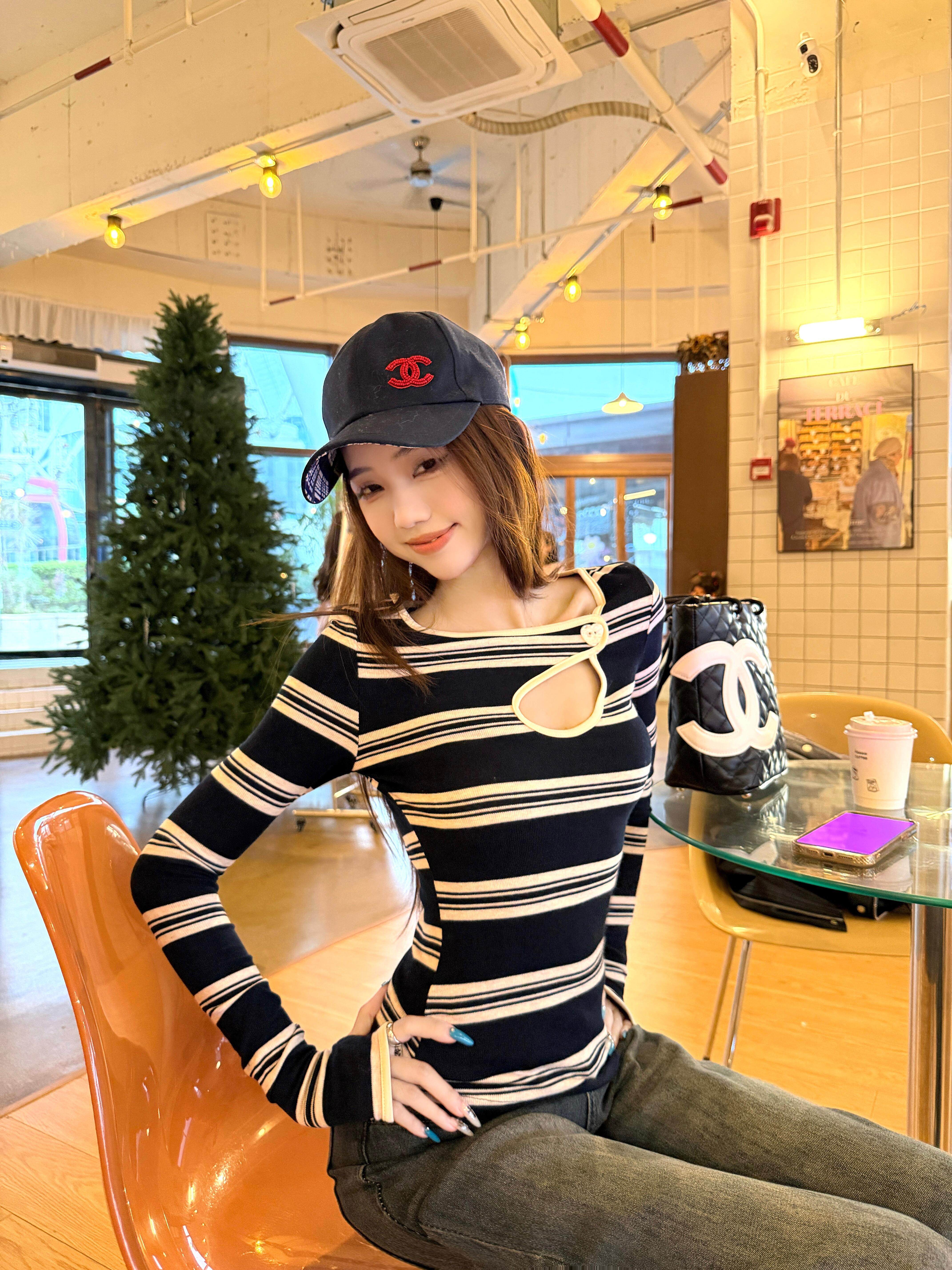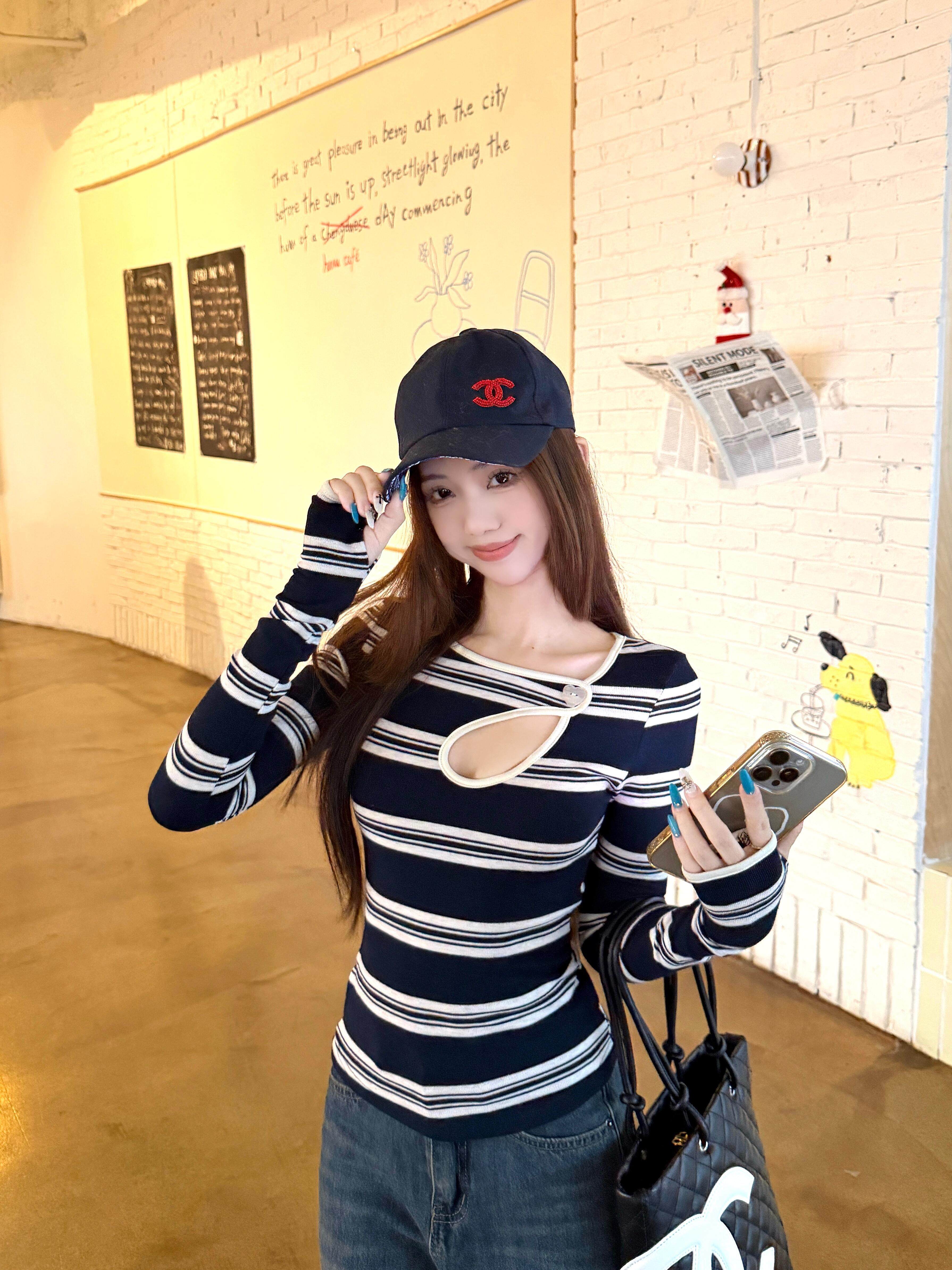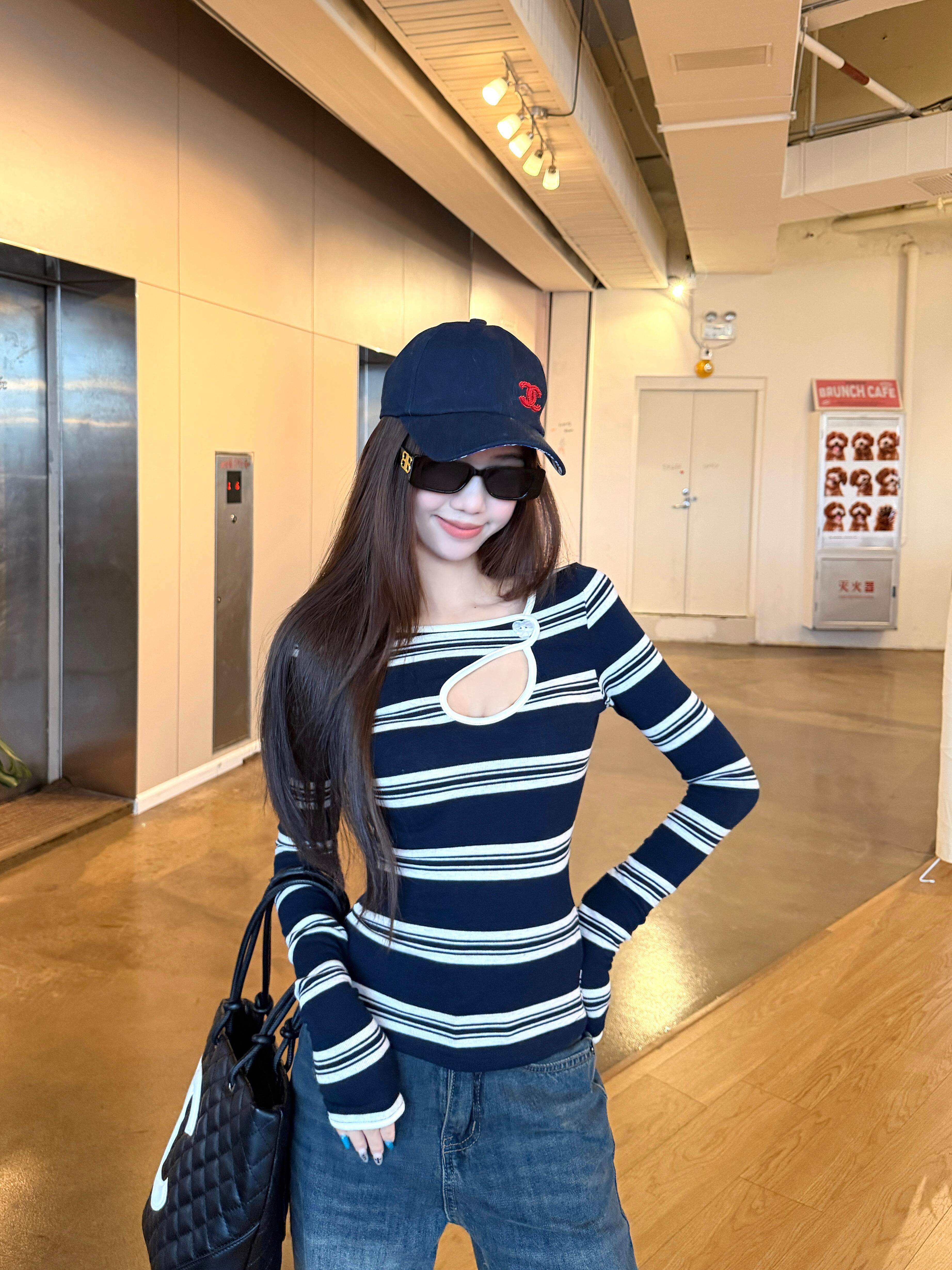 Hot girl style contrast stripe cut-out sexy long sleeve T-shirt