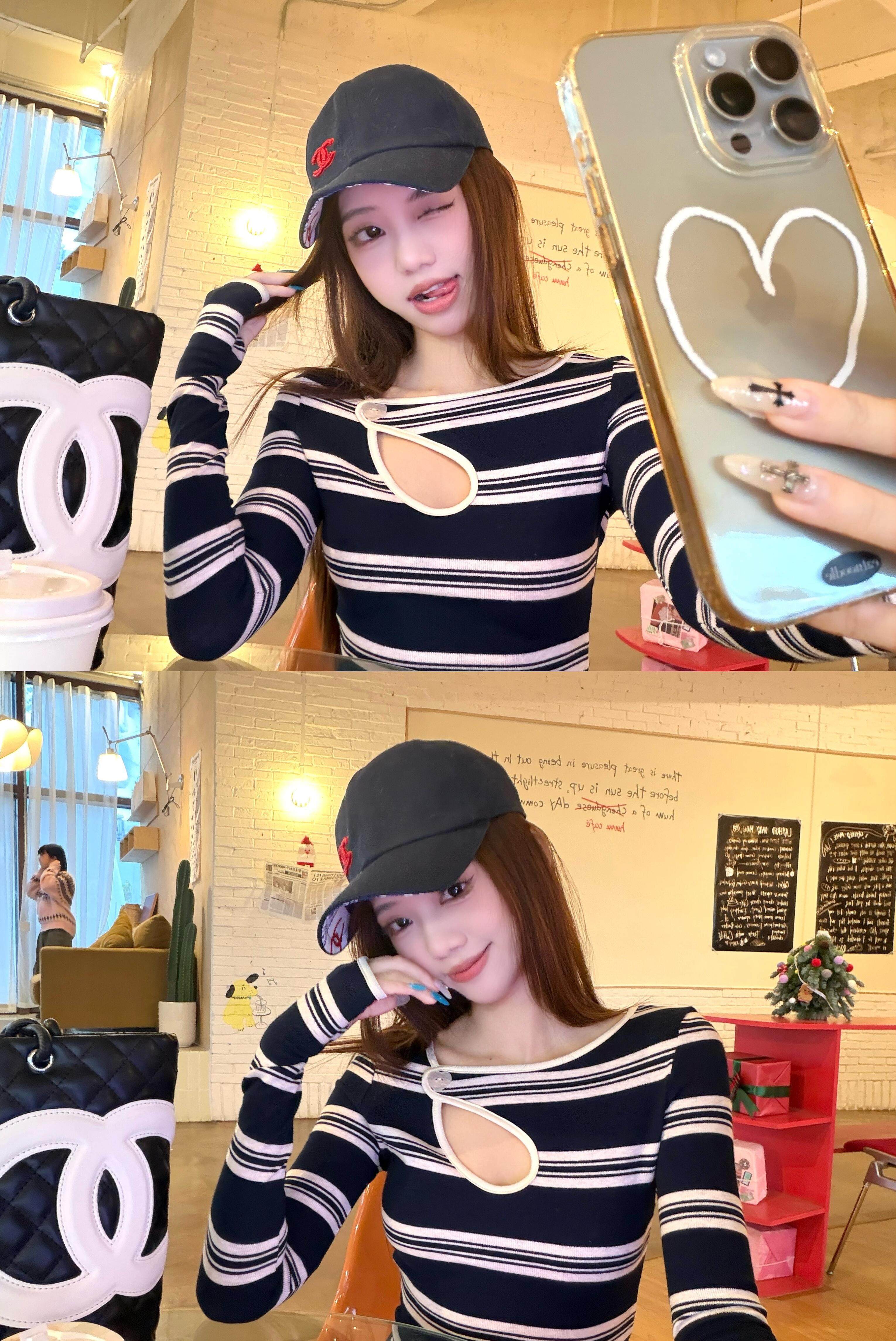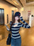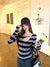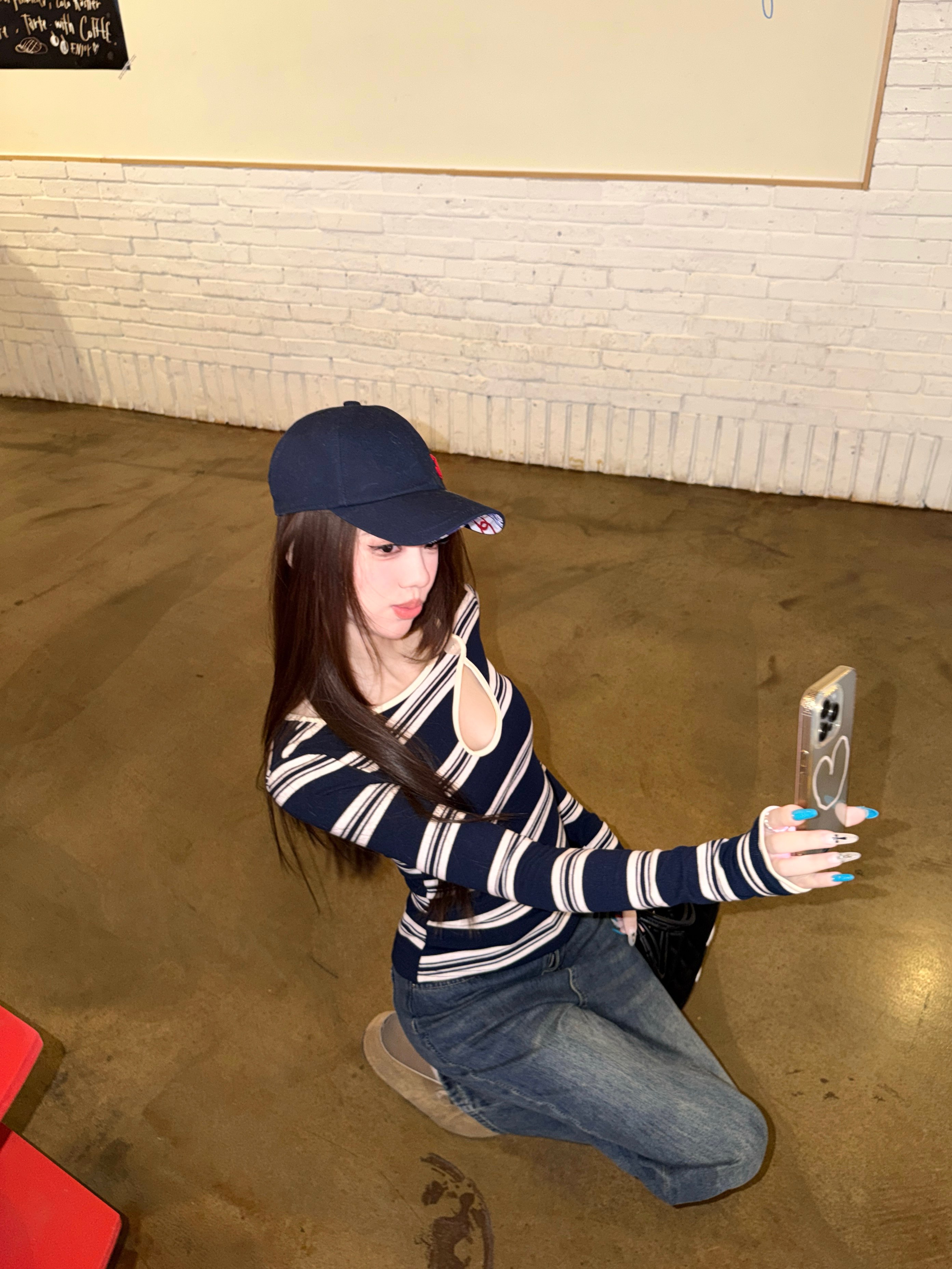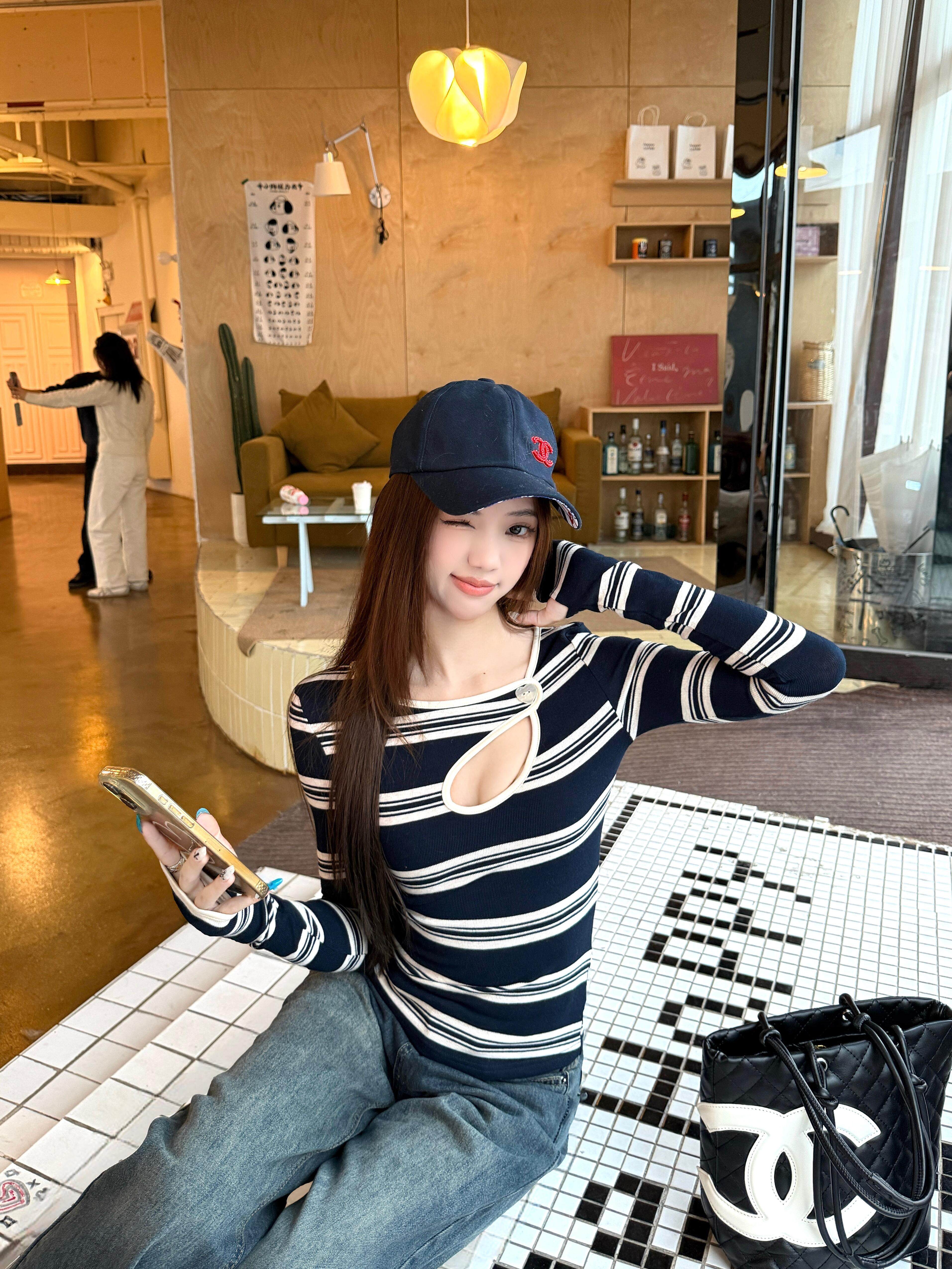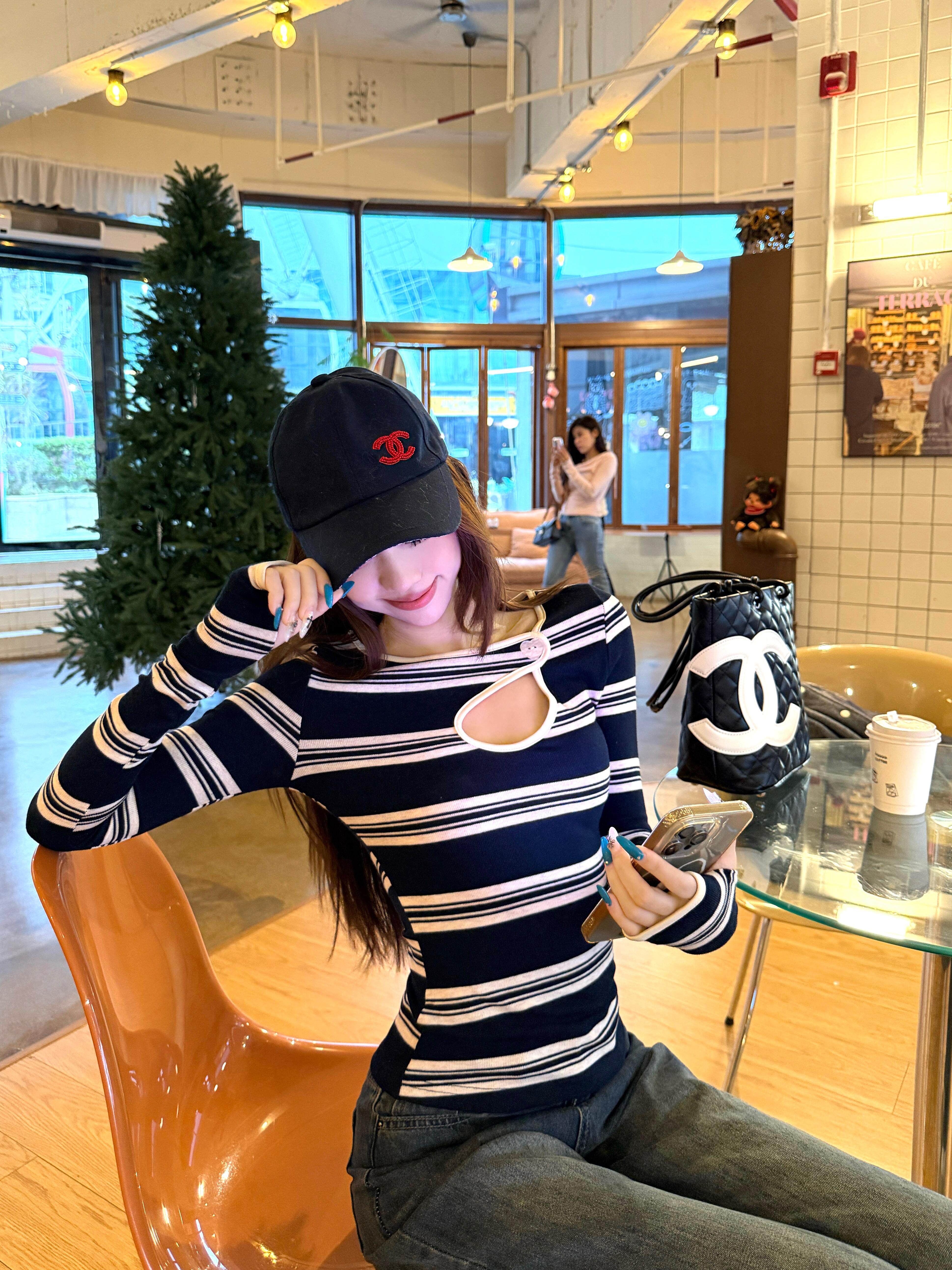 Hot girl style contrast stripe cut-out sexy long sleeve T-shirt
