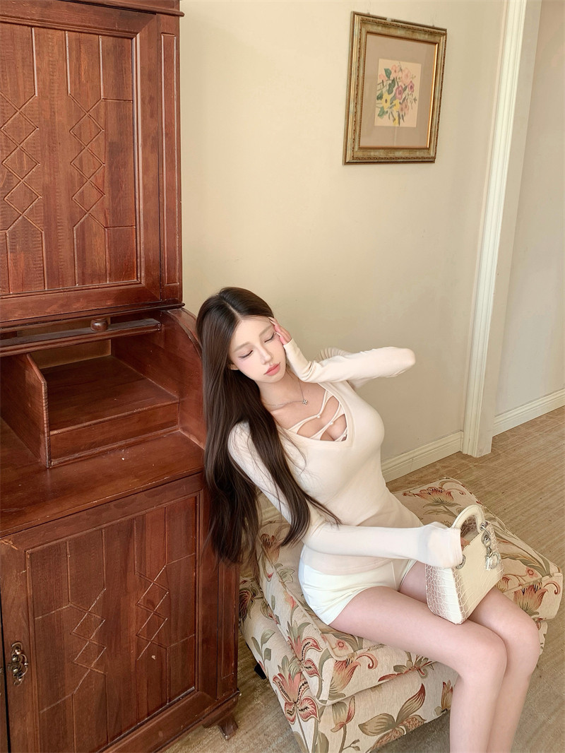Hot girl style sexy V-neck long sleeve fleece T-shirt