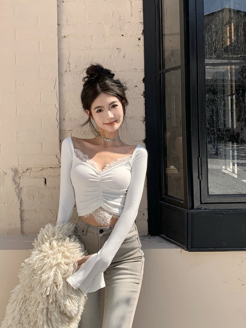 Long-sleeved square neck t-shirt with seductive lace