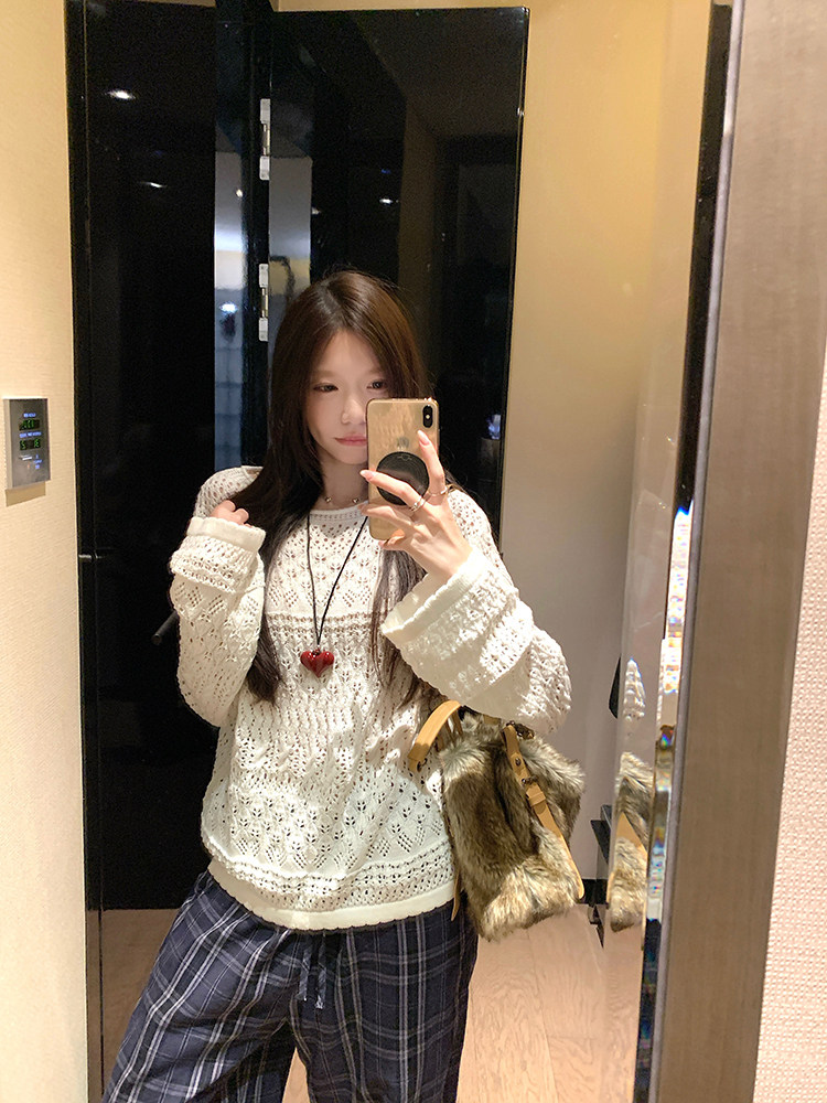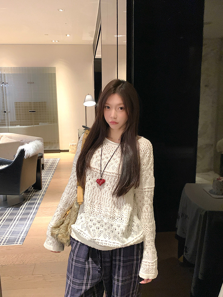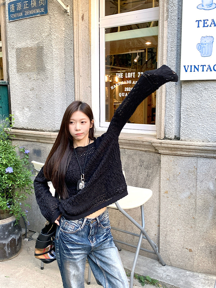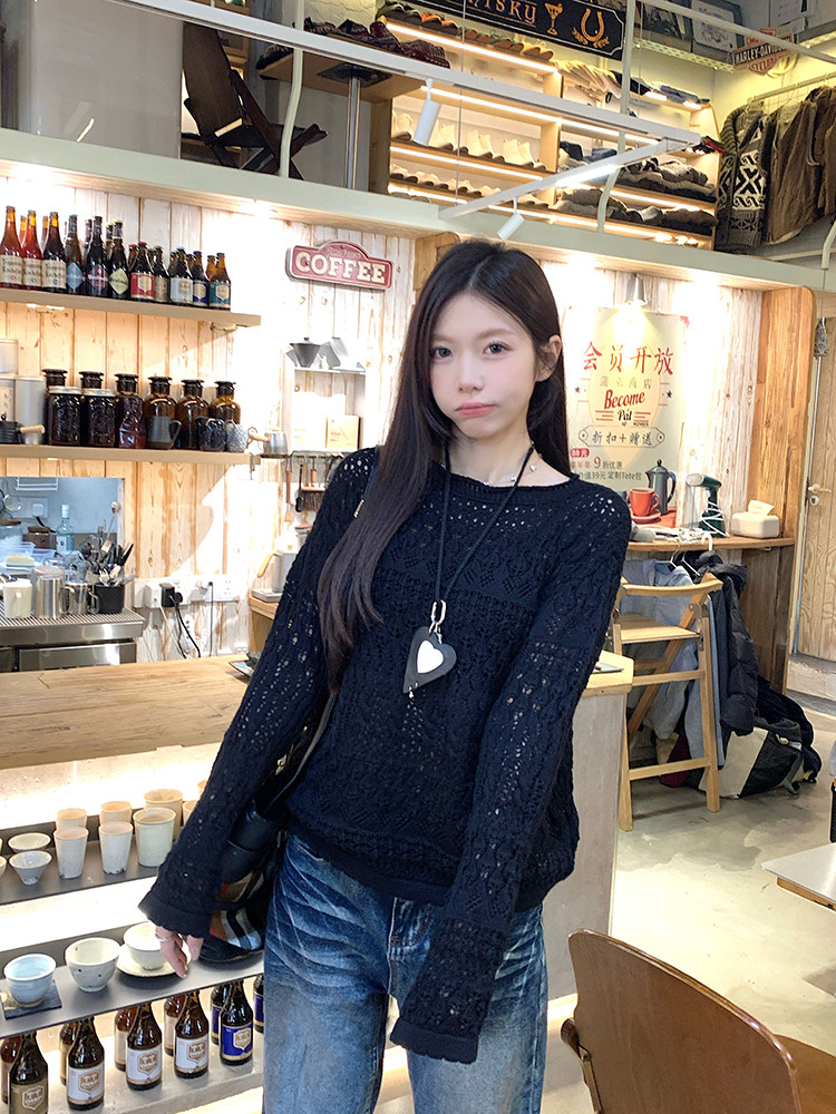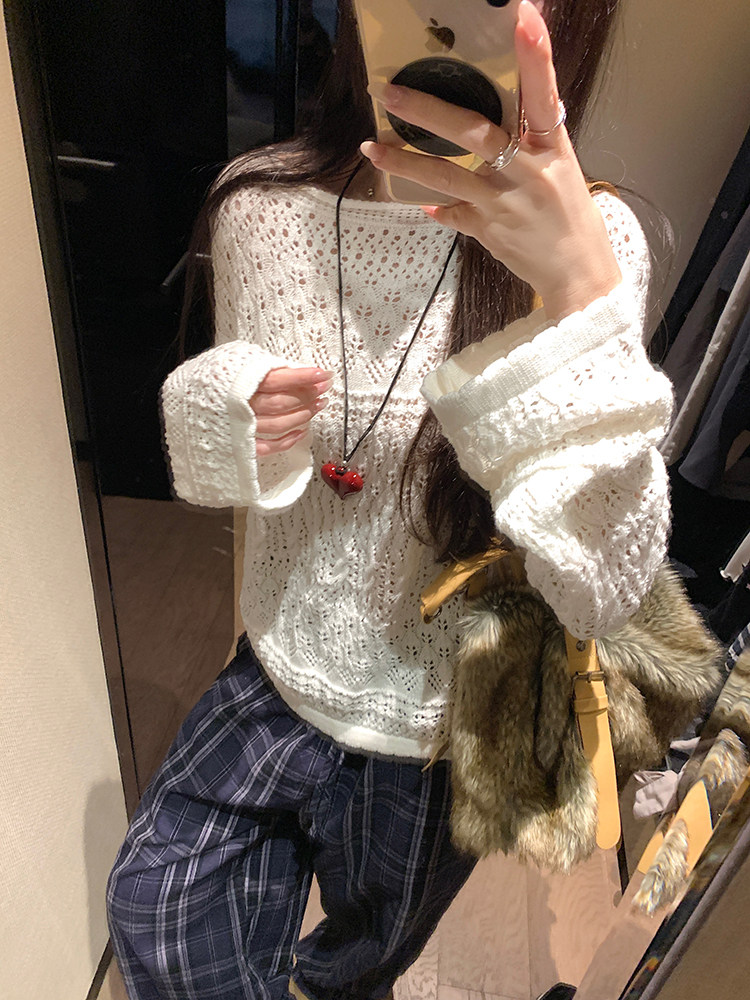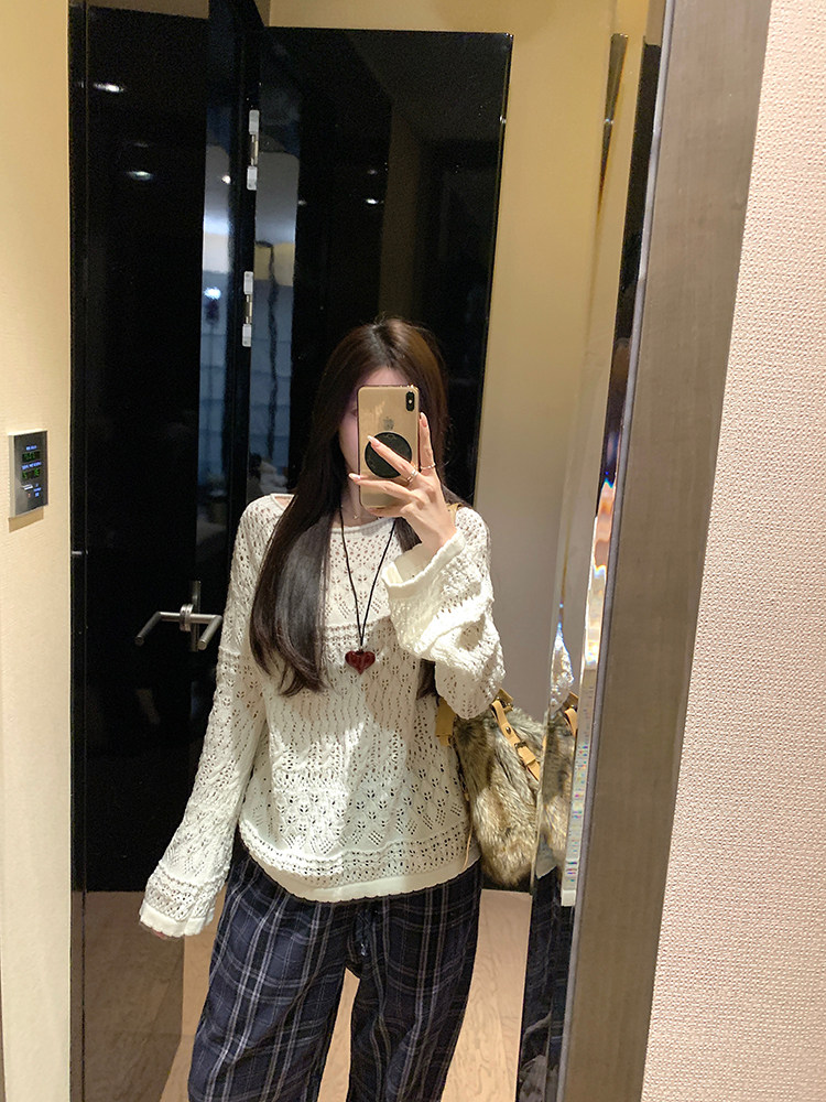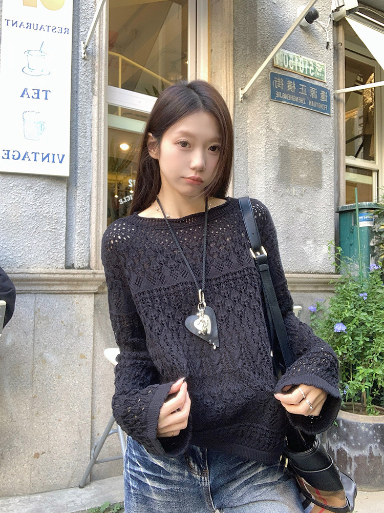 MosesQueen openwork French off-the-shoulder knit cover-up autumn long-sleeved loose shirt
