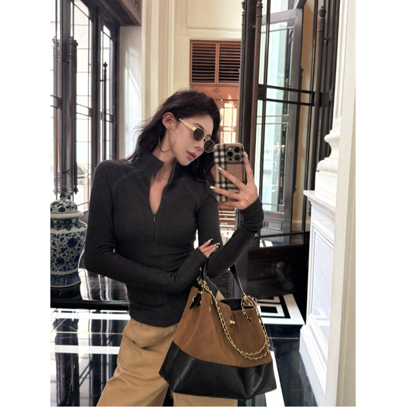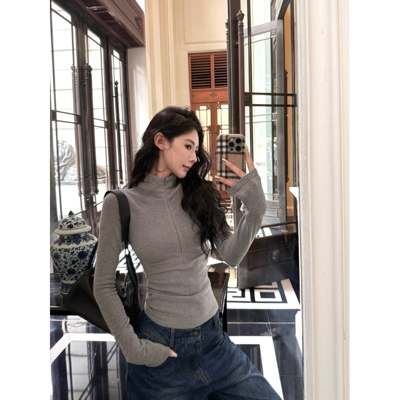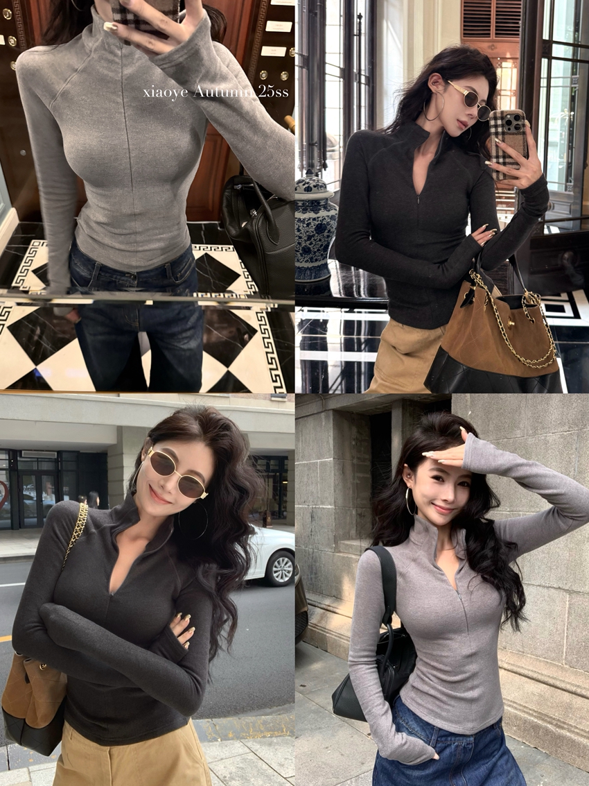 Pre-autumn unique gray chic semi-turtleneck zipper base shirt