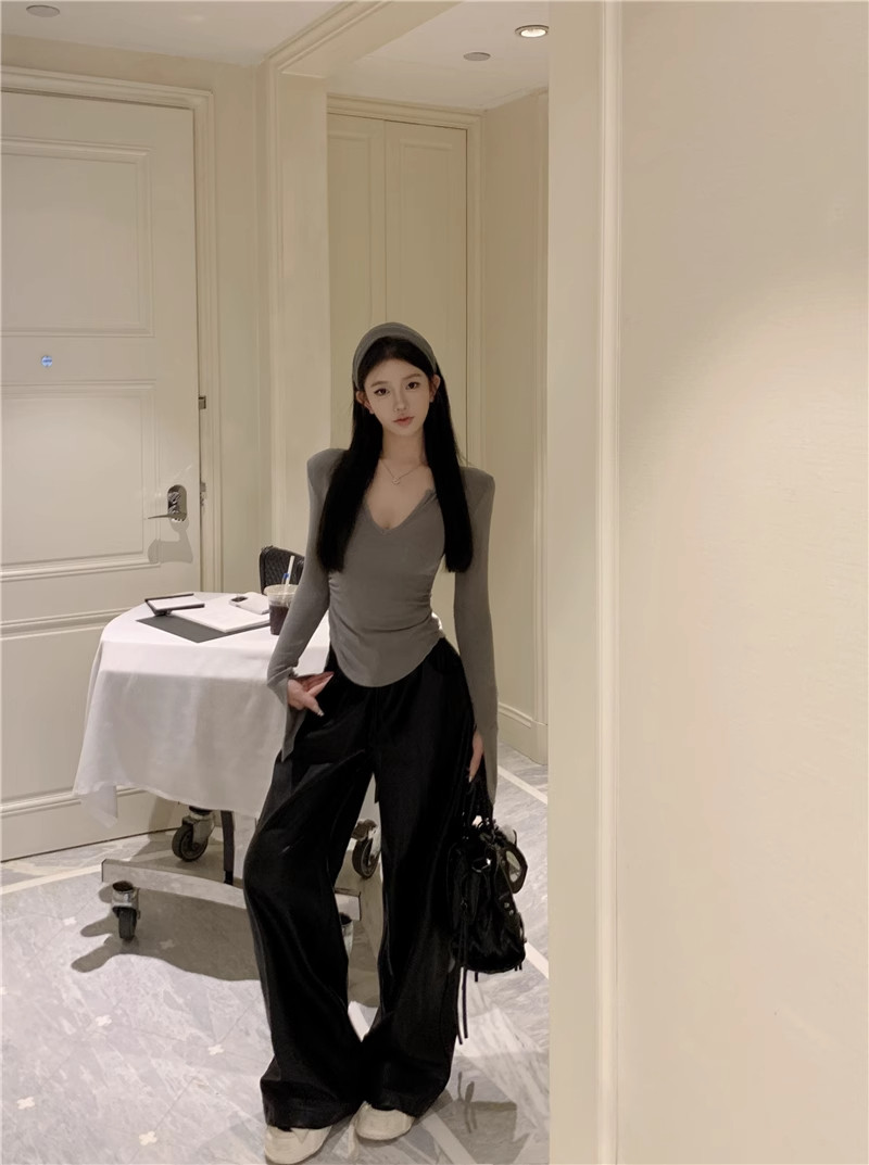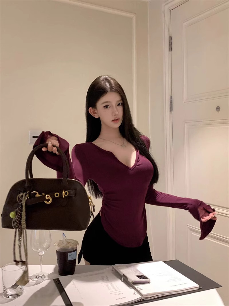 Pure desire hot girl purple V-neck curved hem T-shirt