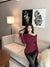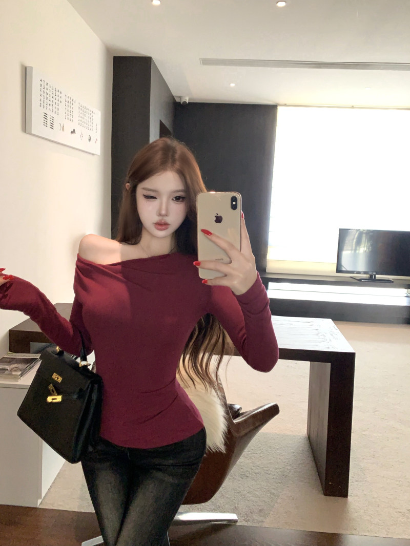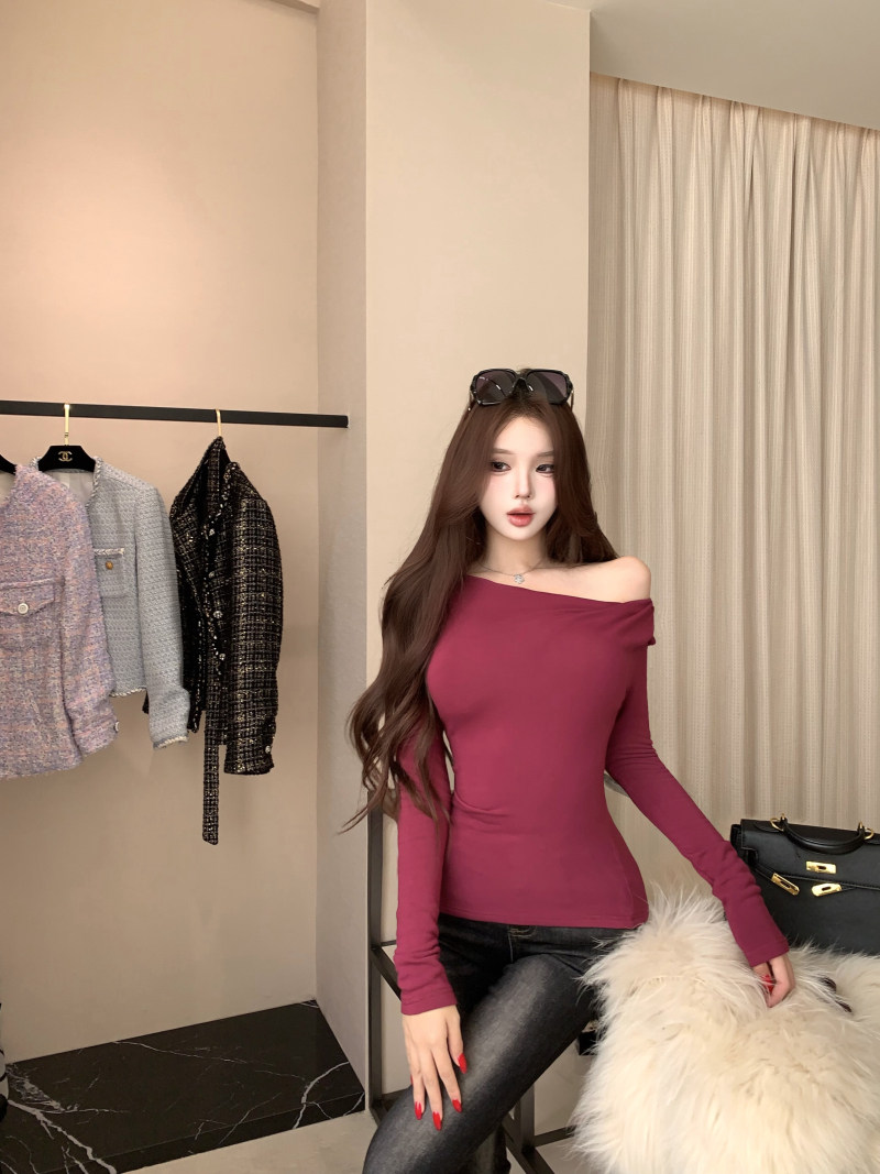 Pure desire wind slanted shoulder long sleeve grape purple T-shirt