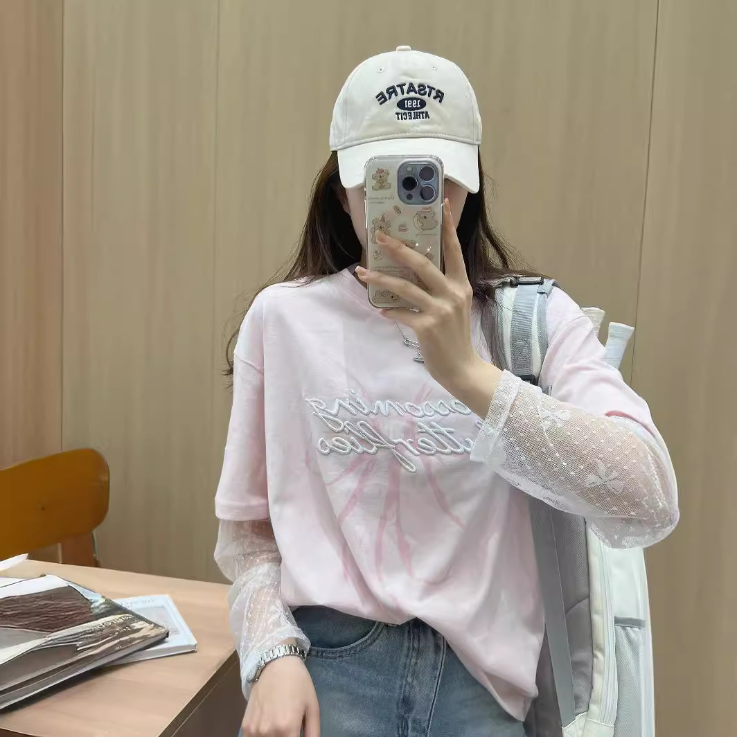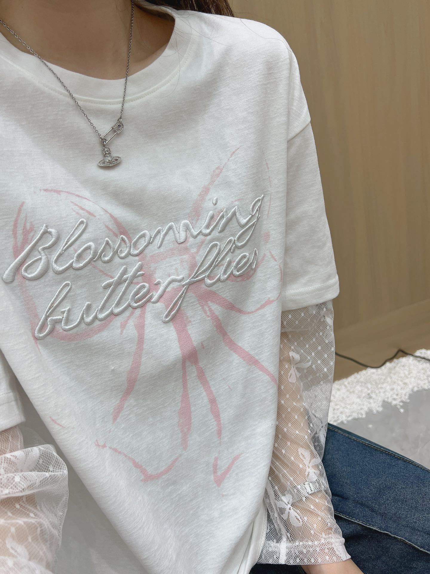 Round neck t-shirt with mesh chiffon long sleeves with lovely lettering
