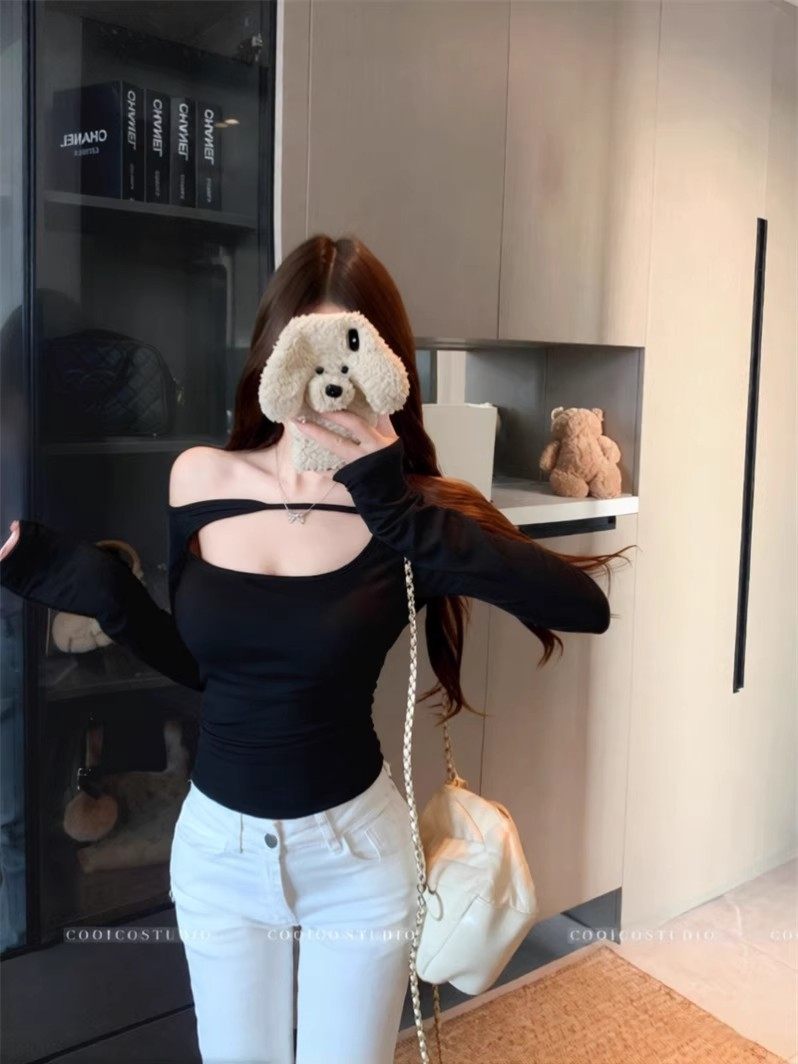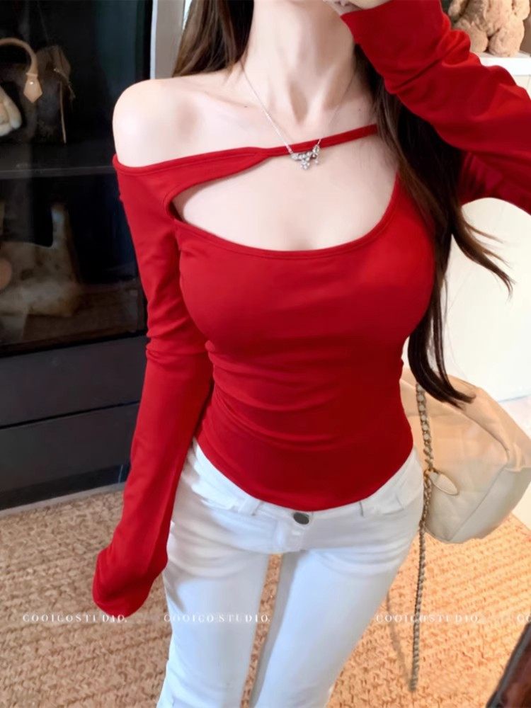 Sexy hot girl low-cut one-shoulder collarbone long sleeve t-shirt