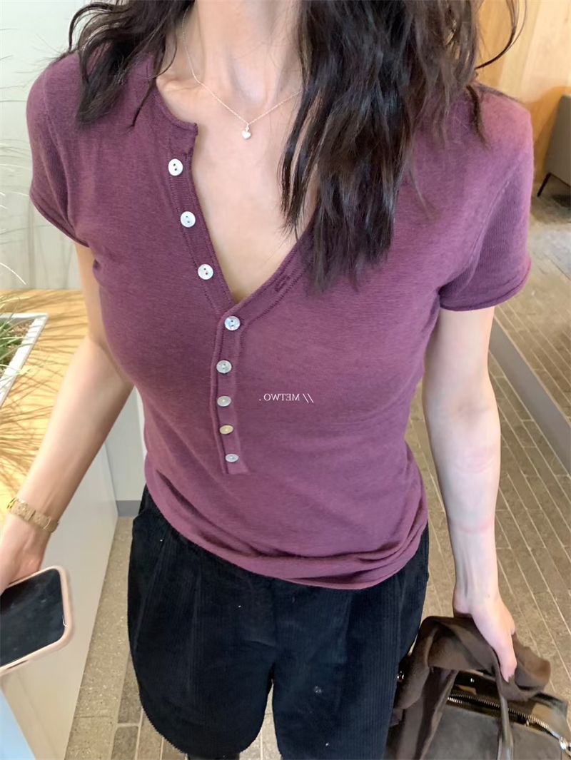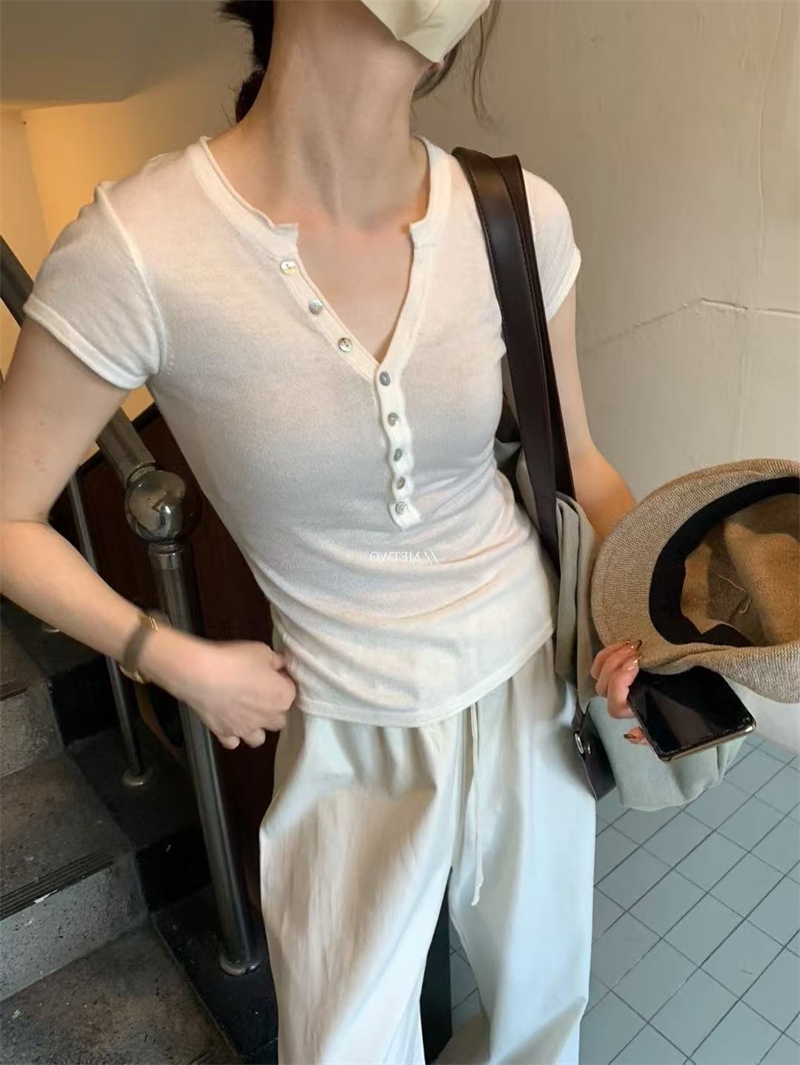 Solid color V-neck short sleeve ice silk knit T-shirt