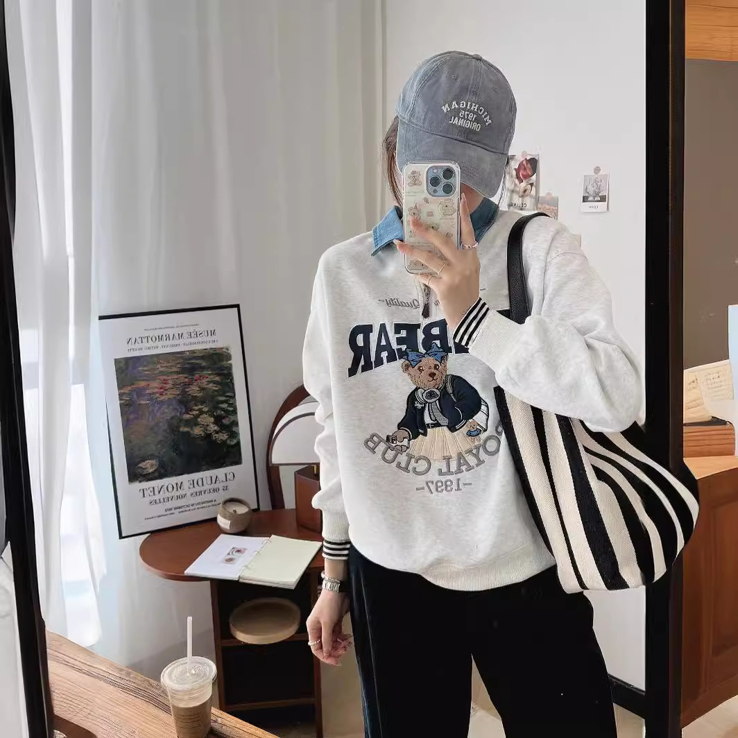 Turn-down collar sweater with horizontal stripes on the wrists, zipper on the top half, embroidered with a cute bear pattern