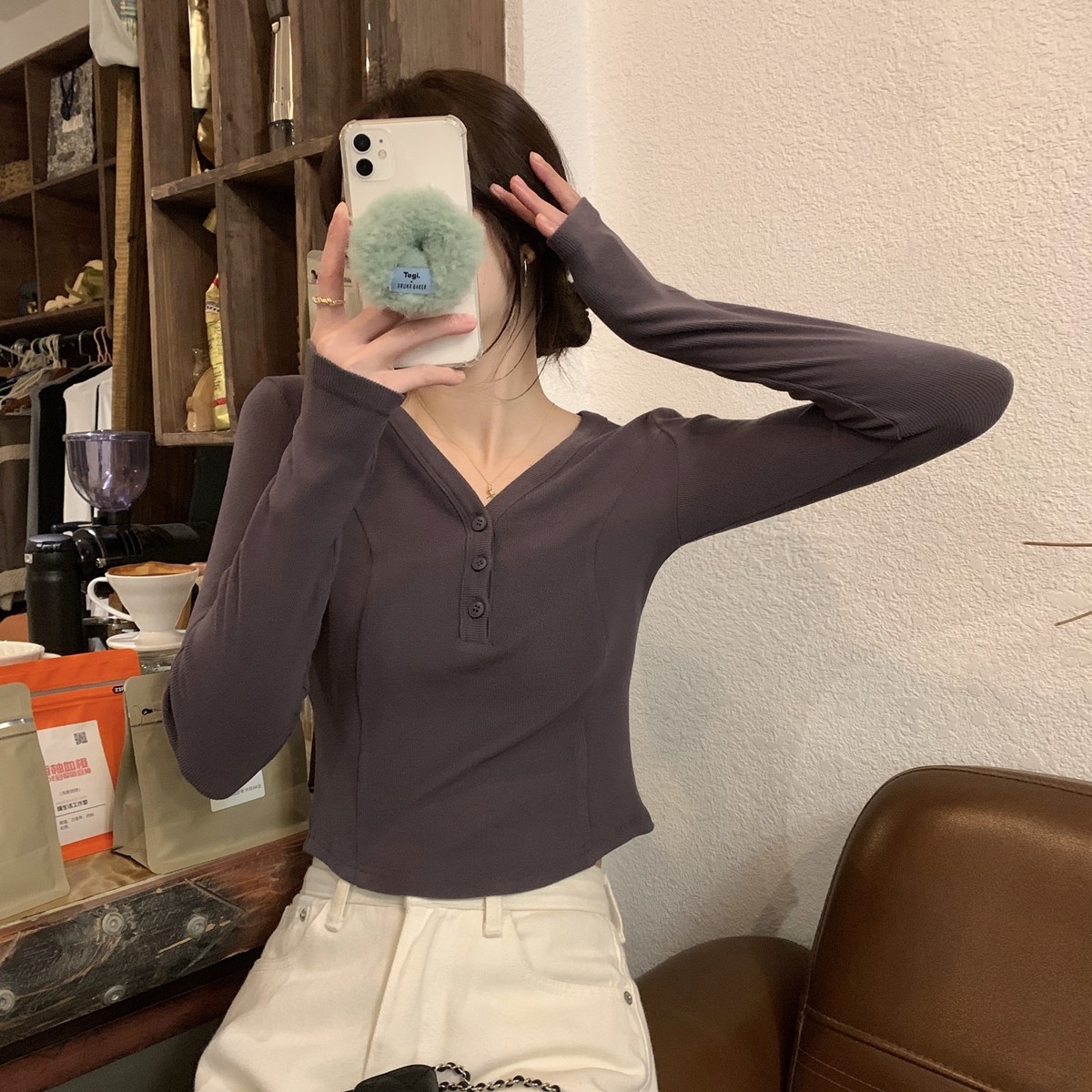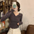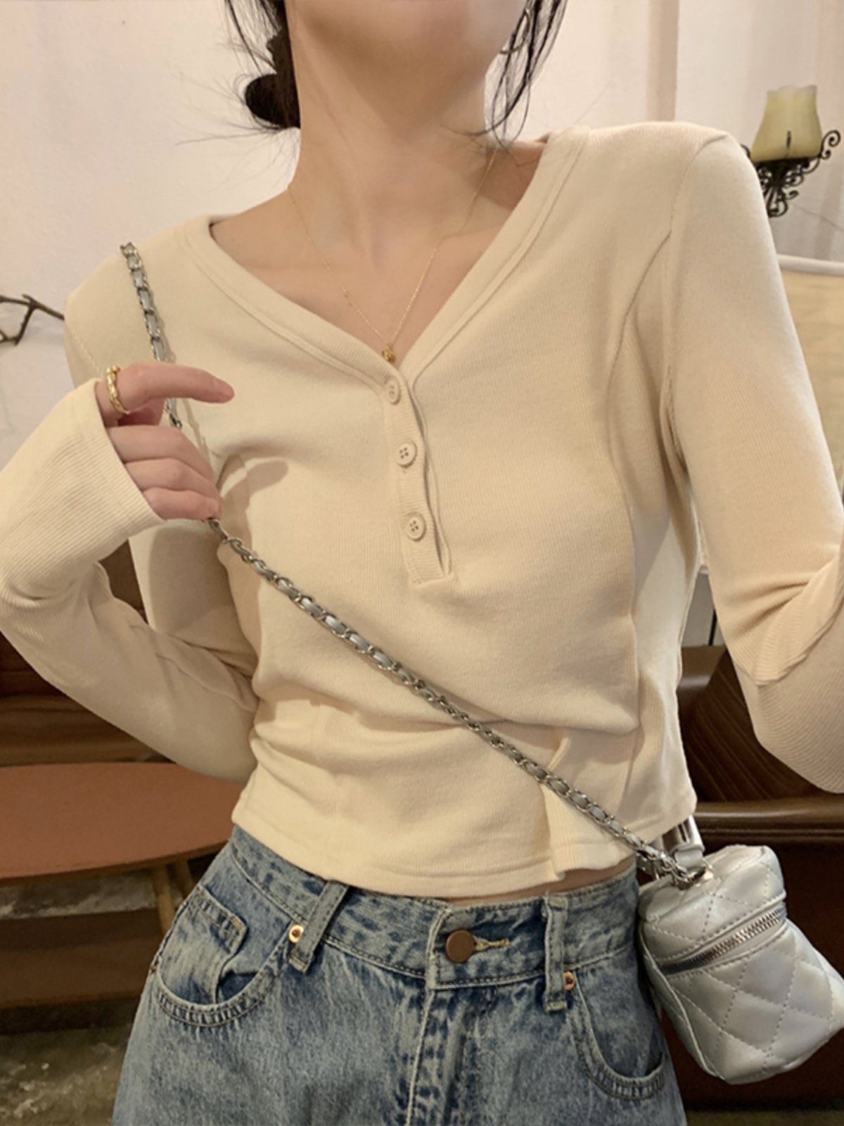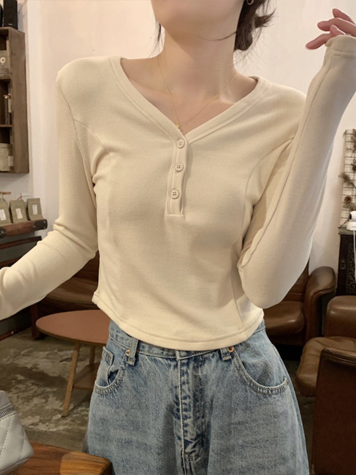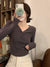 V-neck button-down threaded slim short T-shirt