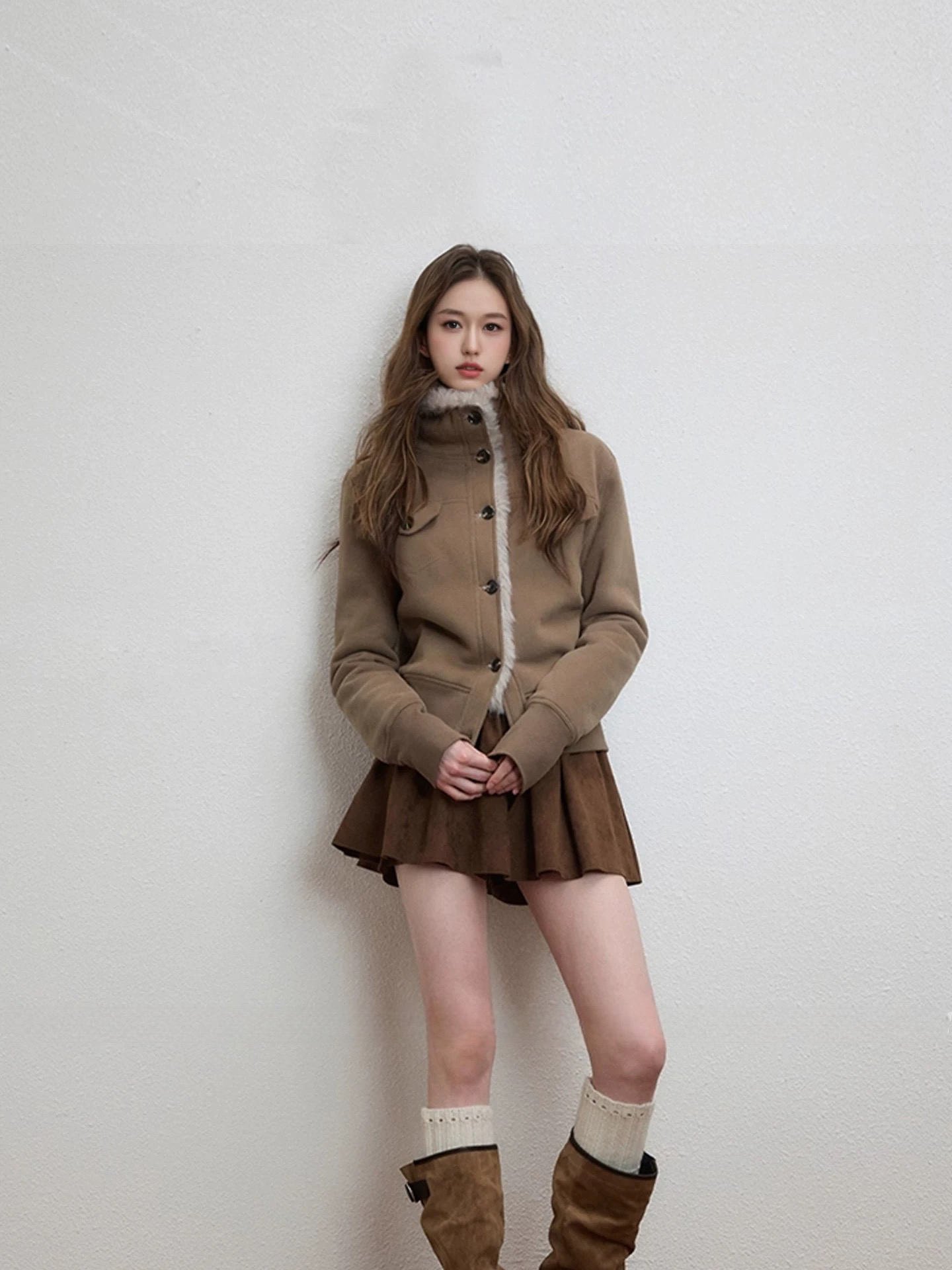 Vintage brown stand-up collar plush thickened sweatshirt jacket