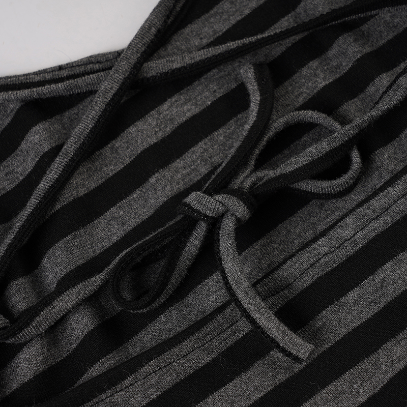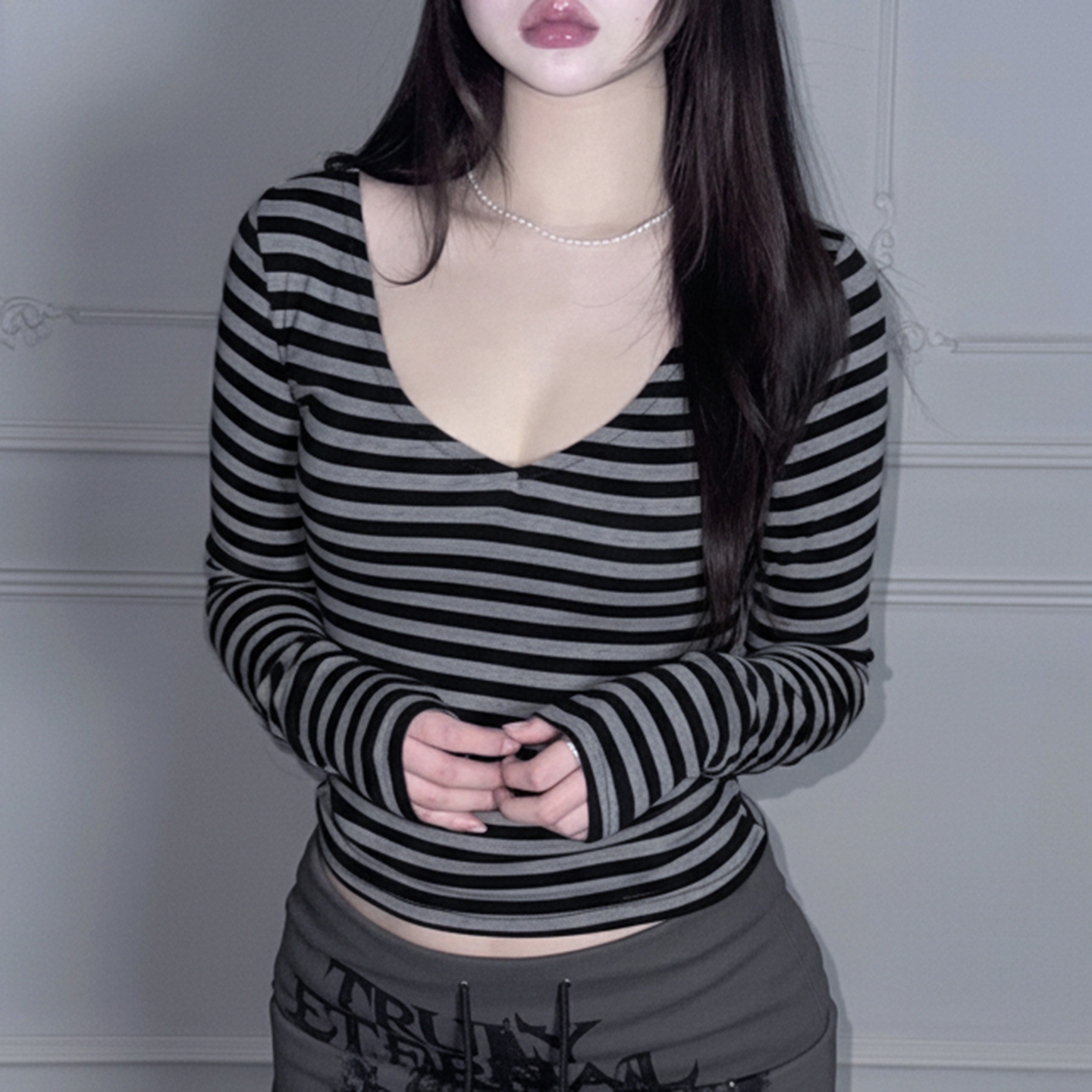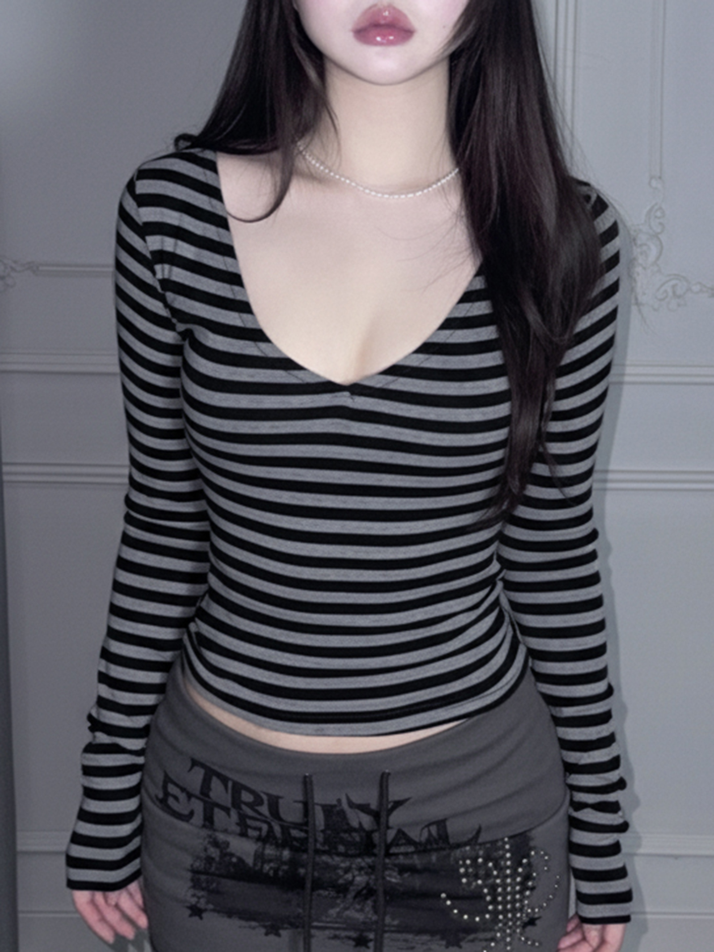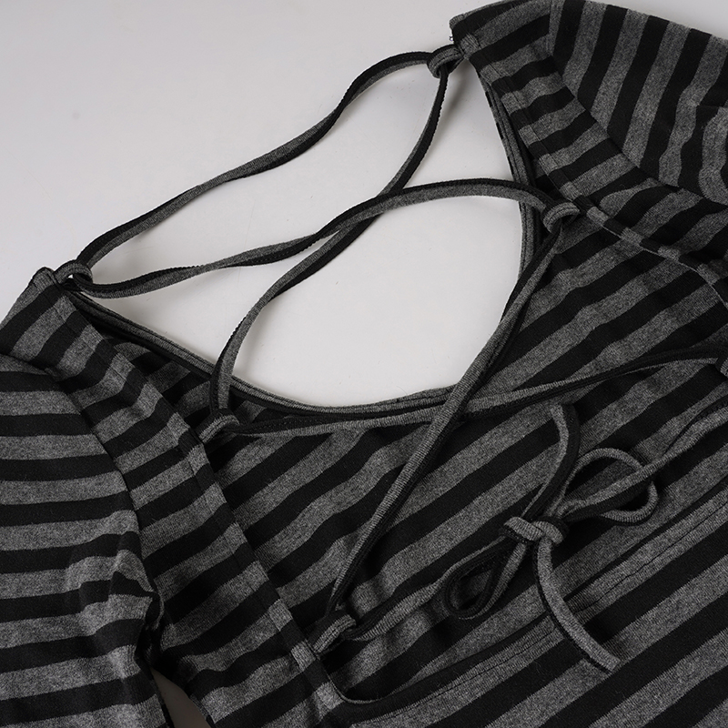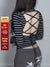 WEEKEEP hot girl sexy contrast striped V-neck open back cross-strap long sleeve t-shirt